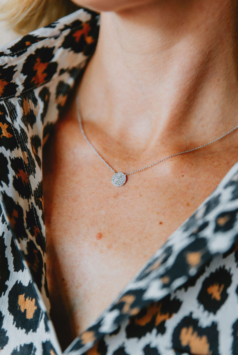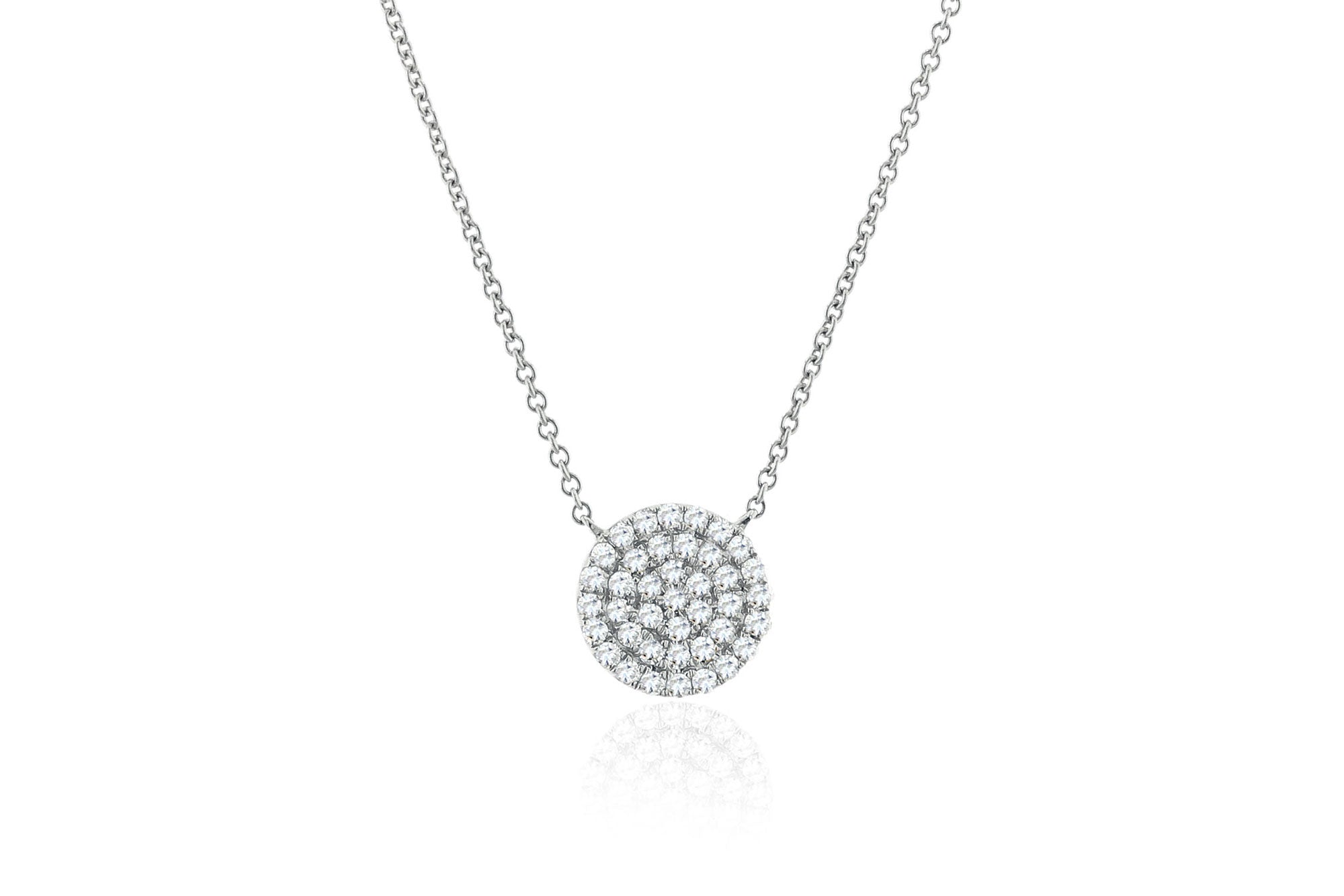 Shine bright with the Details by CoatTails Diamond Pave Disc Necklace in Silver. Crafted with stunning pave diamonds and available in 14k white gold, this necklace is the perfect layering piece to add a touch of elegance to any outfit. Mix and match with other necklaces for a stylish and timeless look.