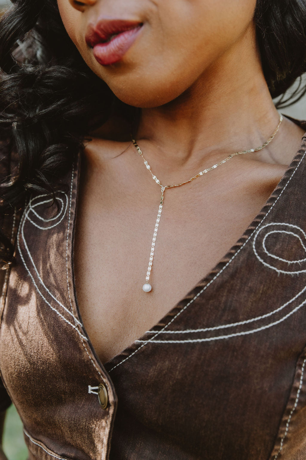 Elevate your style with the Details by CoatTails Pearl Gold Necklace. This perfect accessory features elegant pearl draping, adding a touch of sophistication to any outfit. Layer it with any short necklaces for a stunning, unique look. Make a statement and turn heads with this must-have piece.