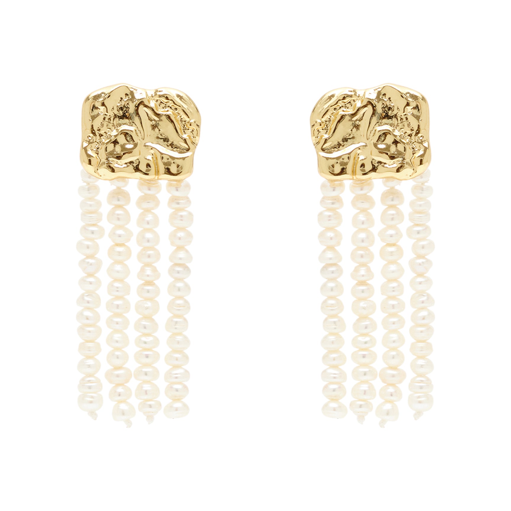 Cascading pearl fringe earrings with an organic gold topper are one of our go-to styles this season. Wear alongside your full denim look and sleek, minimal silks for a high-fashion edge.