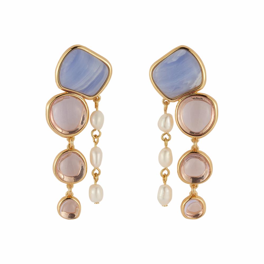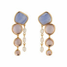Elevate your style with the Rey Earrings in Blues, featuring an enchanting array of muted lavender stones in varying shapes and sizes. The two delicate chains adorned with purple gems and dainty pearls cascade elegantly, framing your face with sophisticated movement. These statement pieces will transform any outfit from ordinary to extraordinary, making them an irresistible addition to your jewelry collection.
