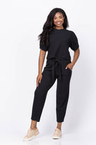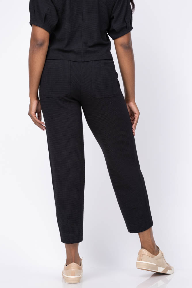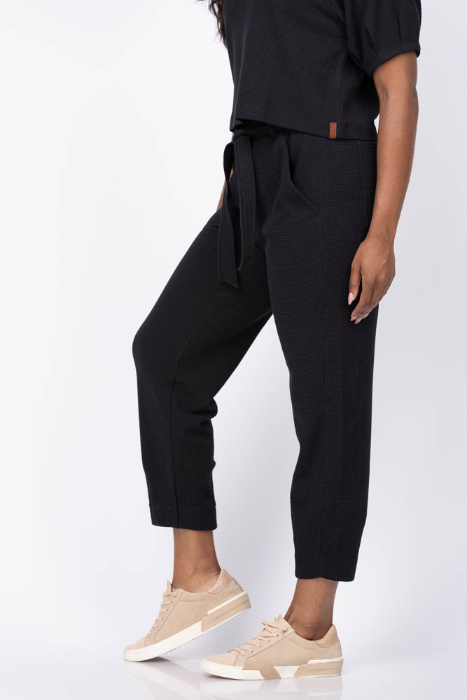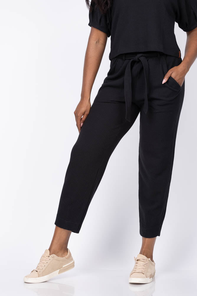 Elevate your casual wardrobe with the Lilla P Belted Pant in Black. Crafted from textured waffle fabric, these pants offer a perfect balance of structure and stretch for lasting comfort and shape retention. Featuring a self-belt, tapered leg, seam details, and functional pockets, they combine style and practicality effortlessly. Ideal for busy days or travel, pair them with a matching waffle top for a polished, chic look that moves with you.
