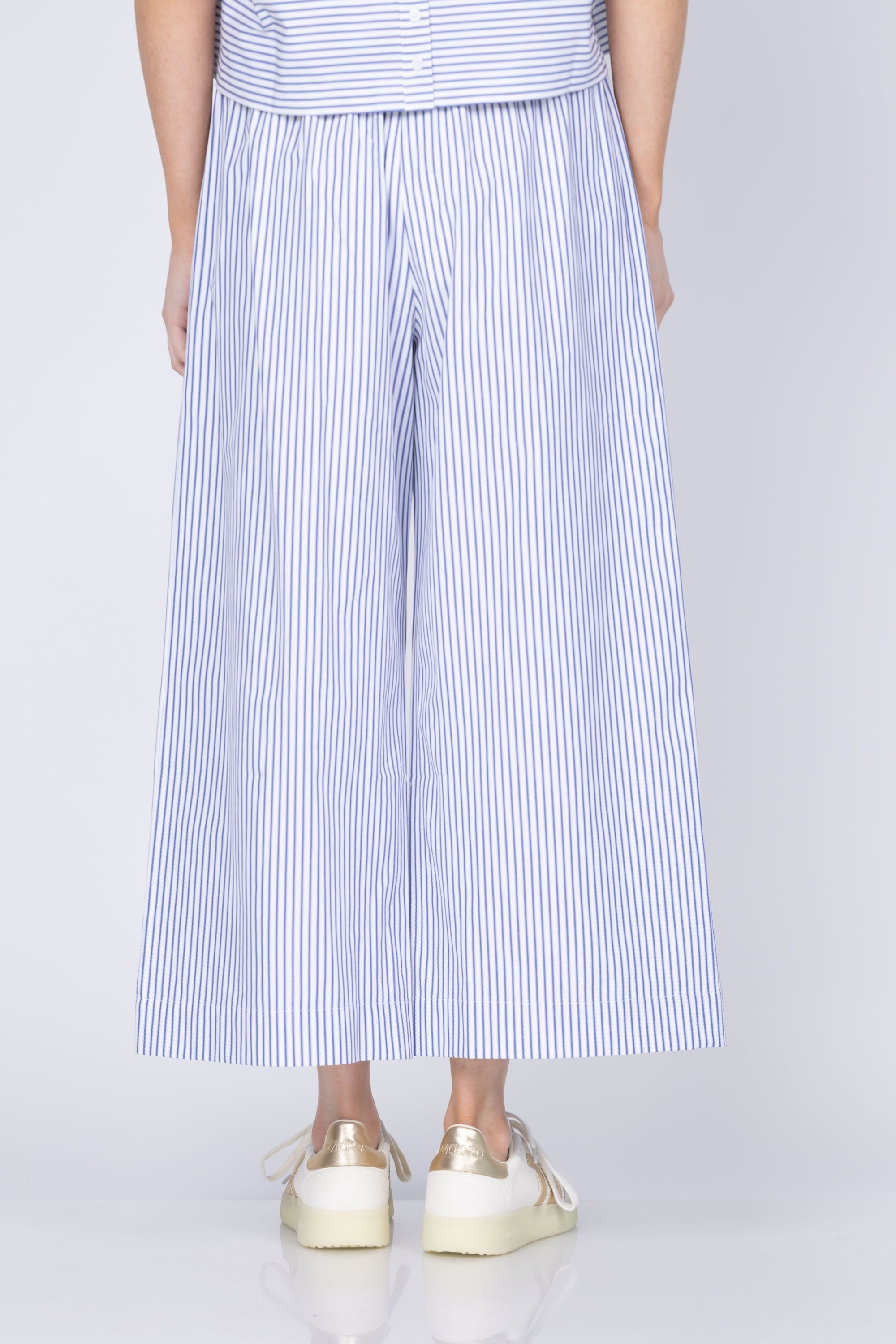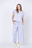 The Maya Pants deliver effortless style in a crisp navy stripe poplin. Crafted from 100% cotton, these pull-on pants feature a comfortable drawstring waist that eliminates fussy closures, making them perfect for relaxed days or casual outings. The wide-leg silhouette with a slightly cropped length creates a modern, flattering proportion that works beautifully with everything from sneakers to sandals. Fresh and versatile, these pants are a wardrobe staple that transitions seamlessly from weekend to weekday wear.