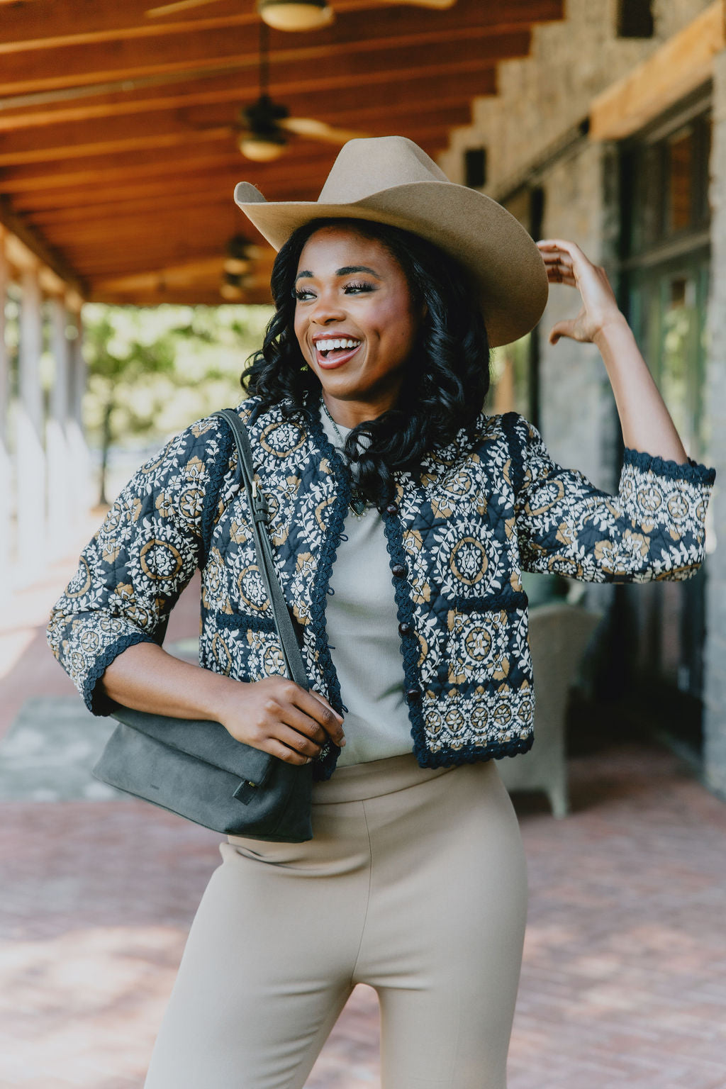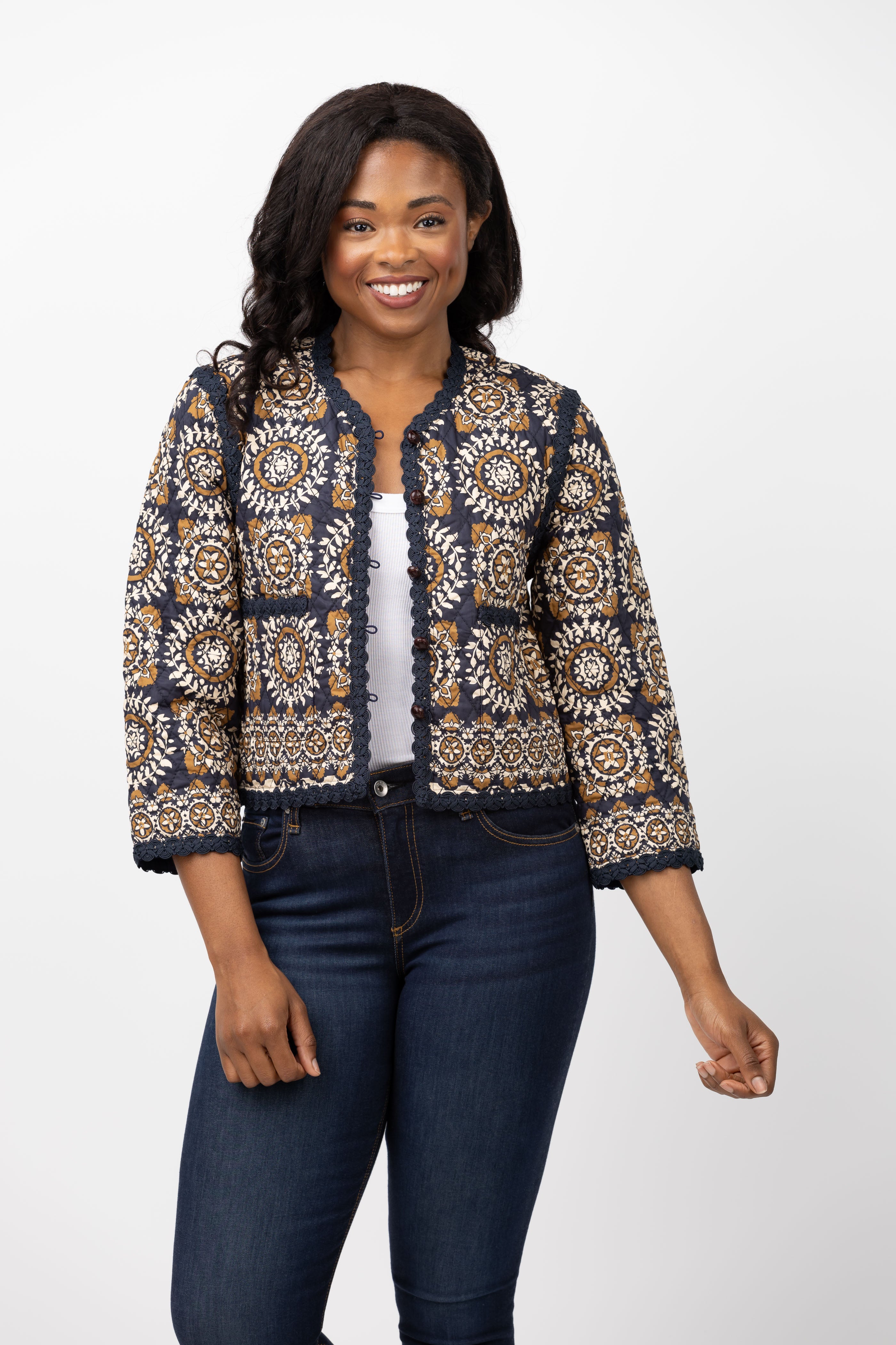 Elevate your style with the Cara Cara Marissa Jacket in Blue Medium Tile. This closet staple is quilted with a unique tile print, giving it a modern and stylish look. Made from lightweight cotton and lined for extra warmth, it features a jacquard cross stitch ribbon and vegan leather shank buttons.
