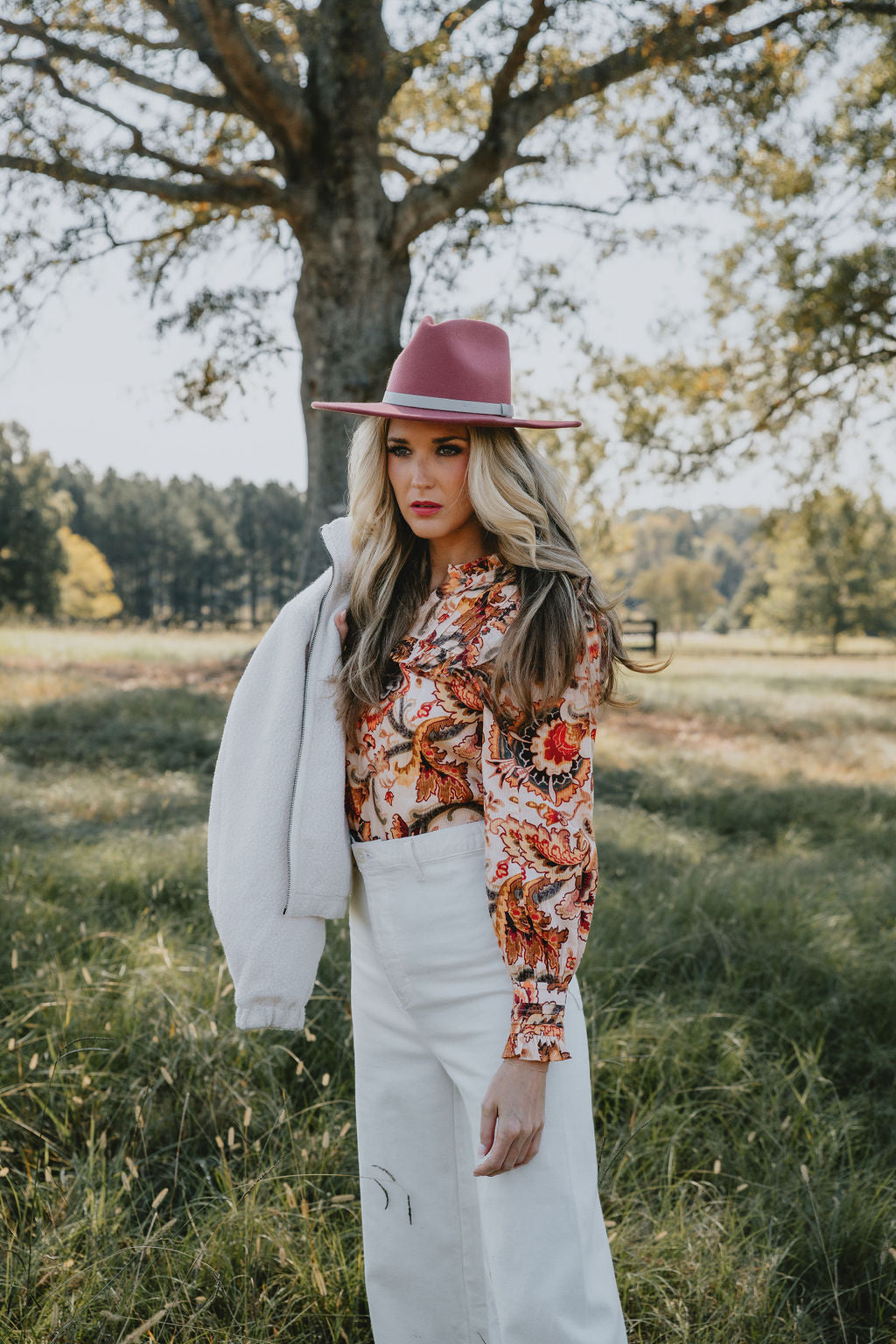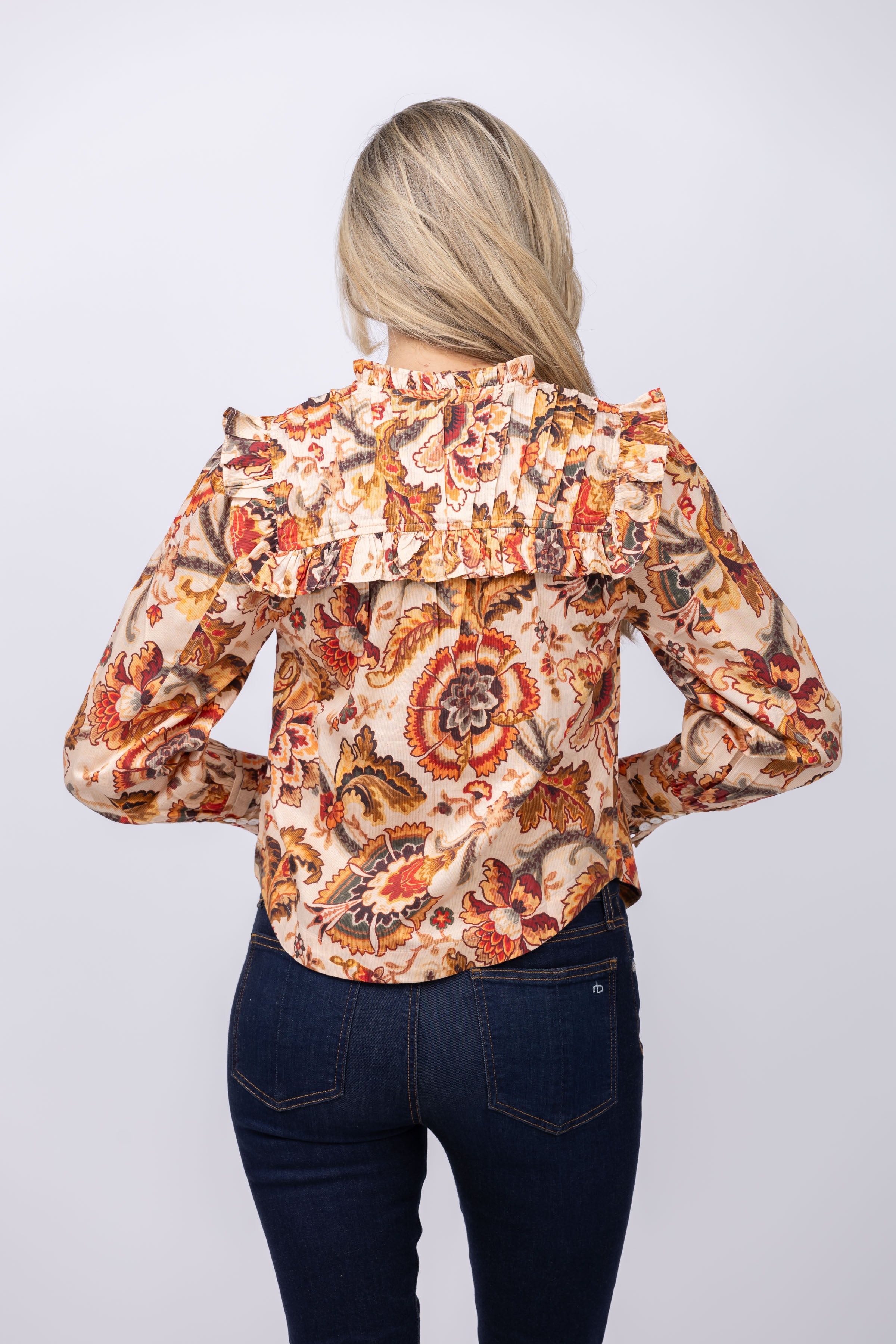 Add a touch of elegance to your wardrobe with the Love The Label Tallulah Top in Fiona Floral. The detailed, colorful floral print creates a romantic silhouette, while the ruffled neckline and cuffs add feminine charm. This versatile top can be dressed up or down, making it a timeless addition to any outfit.