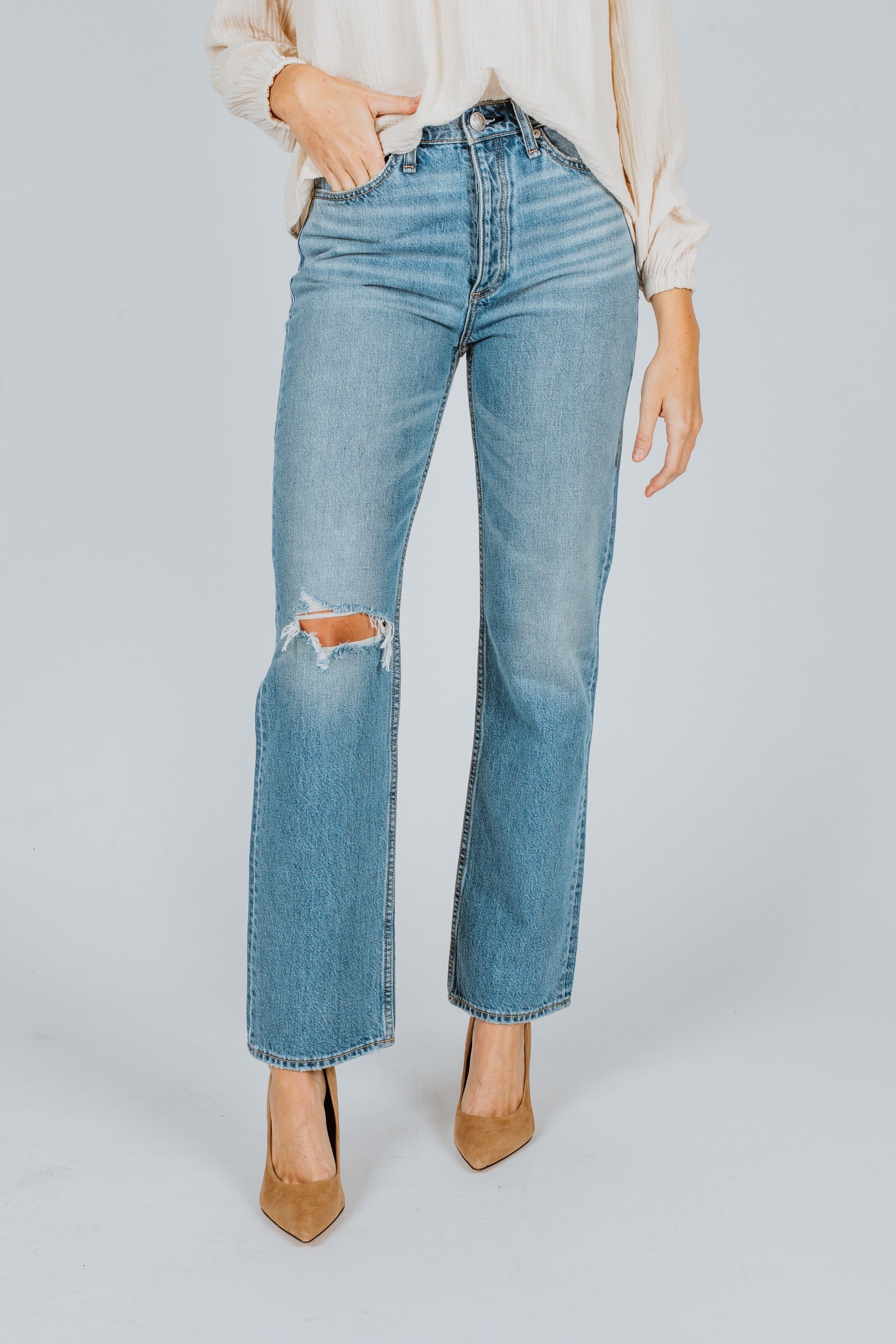 The Alex jeans by rag & bone are crafted of premium rigid denim, featuring a vintage-inspired straight-leg silhouette with a slashed knee and classic five-pocket detail.