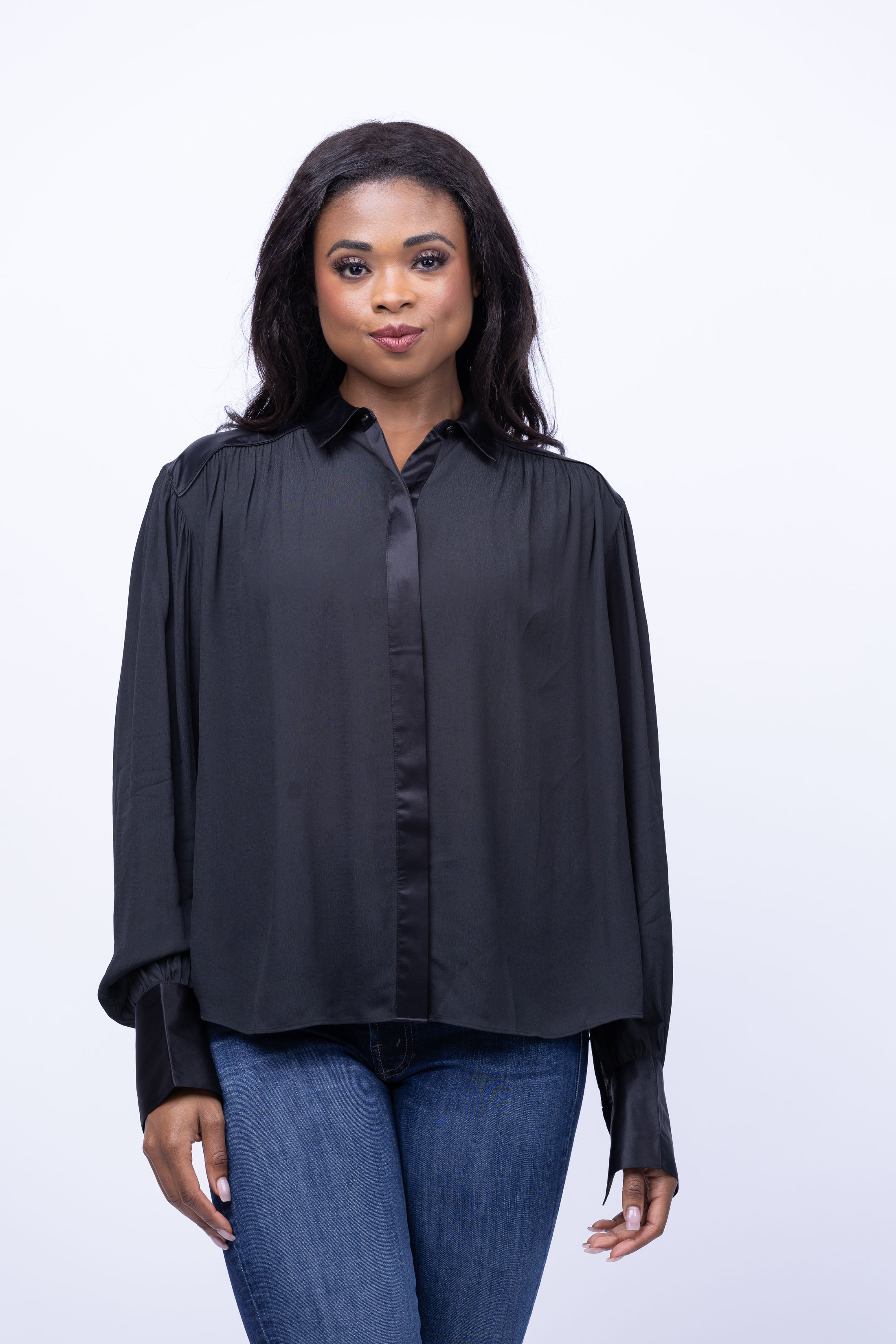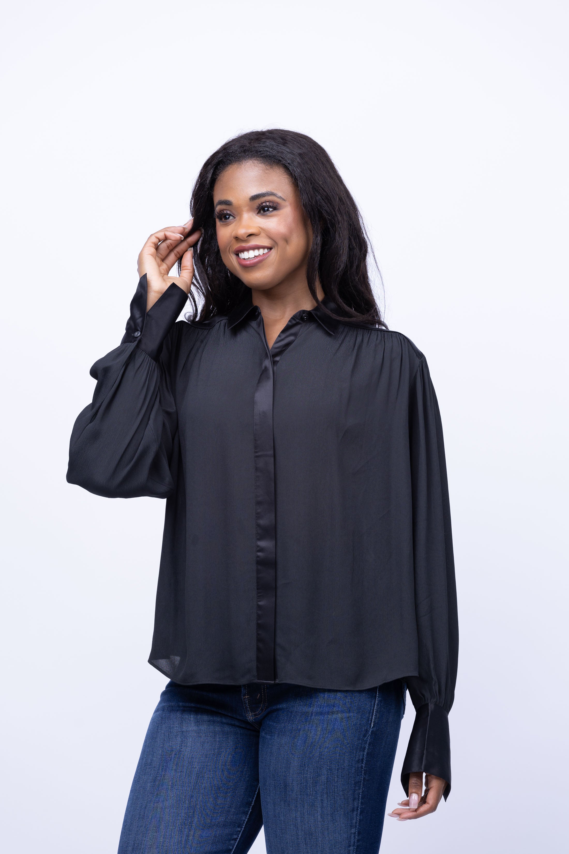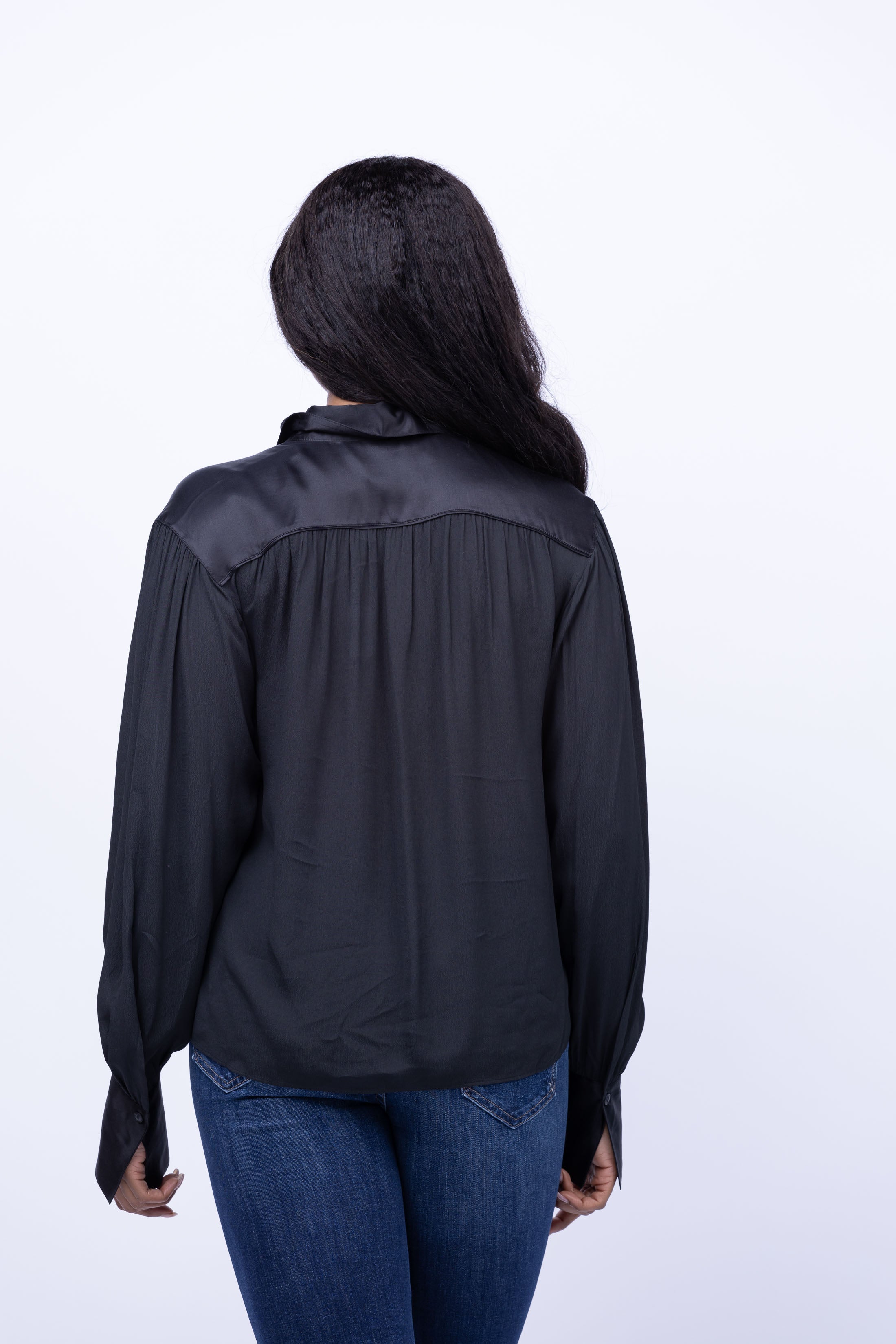 Flaunt your modern sense of style with the Rag & Bone Aubrey Georgette Top! Crafted from stars-aligning viscose georgette with a satin collar and shoulder details, this timeless button down will make any outfit look effortlessly chic. Hidden fisheye buttons and stylish cuffs add an extra touch of elegance to this stunning piece. Dare to be different.