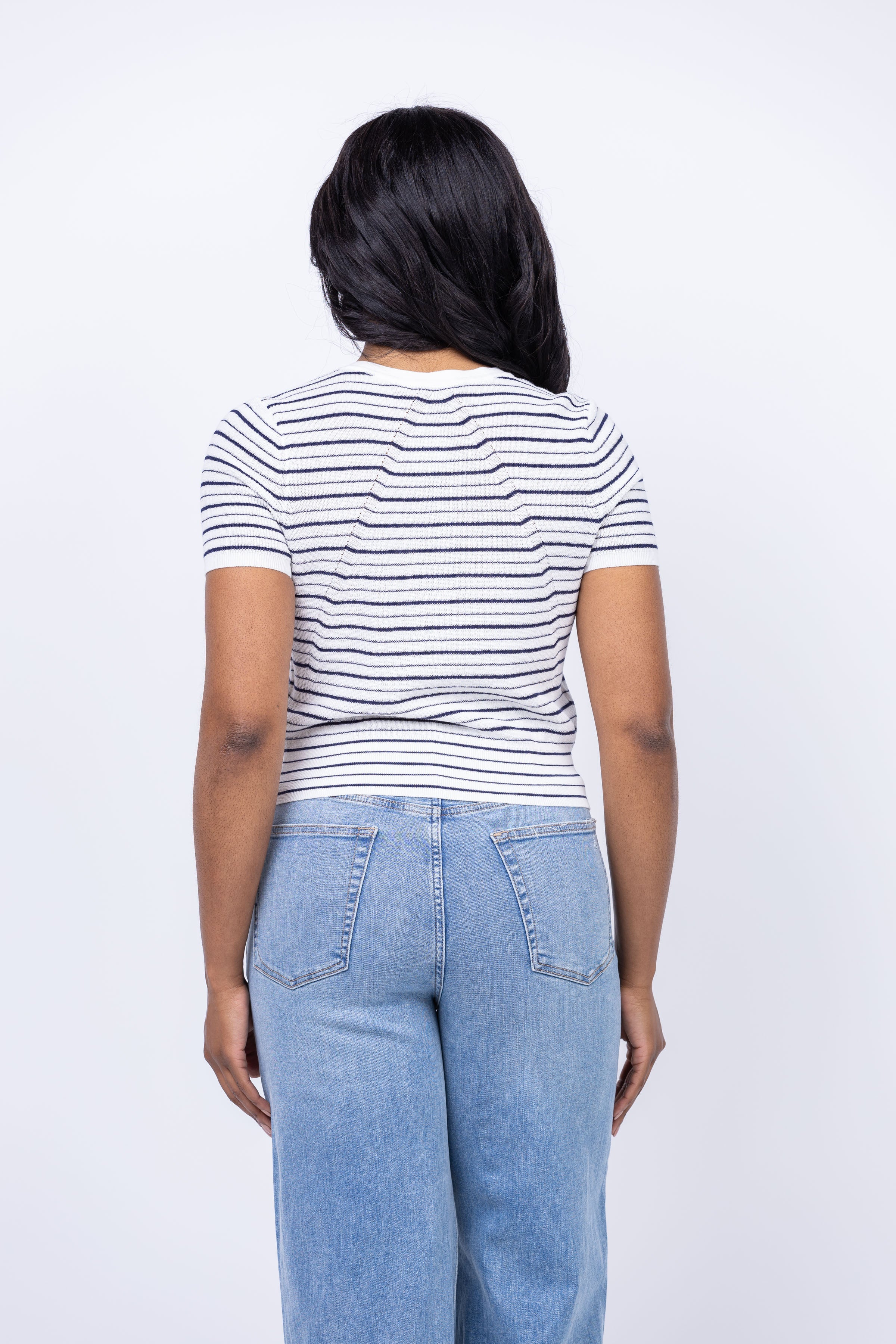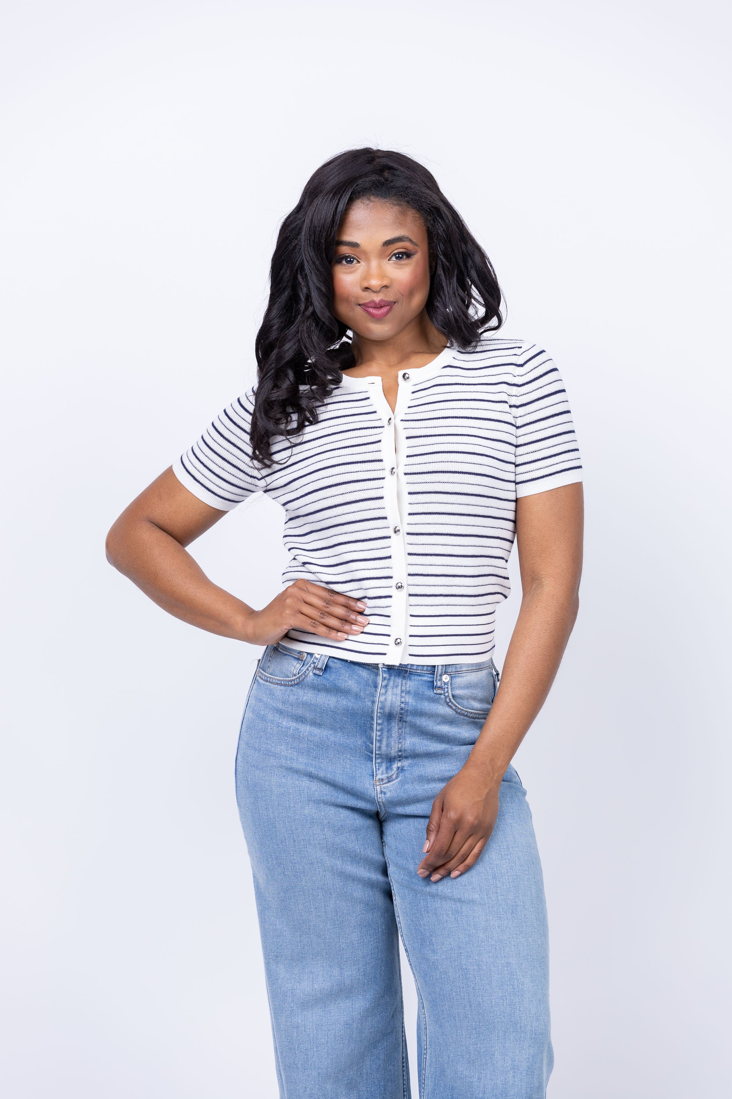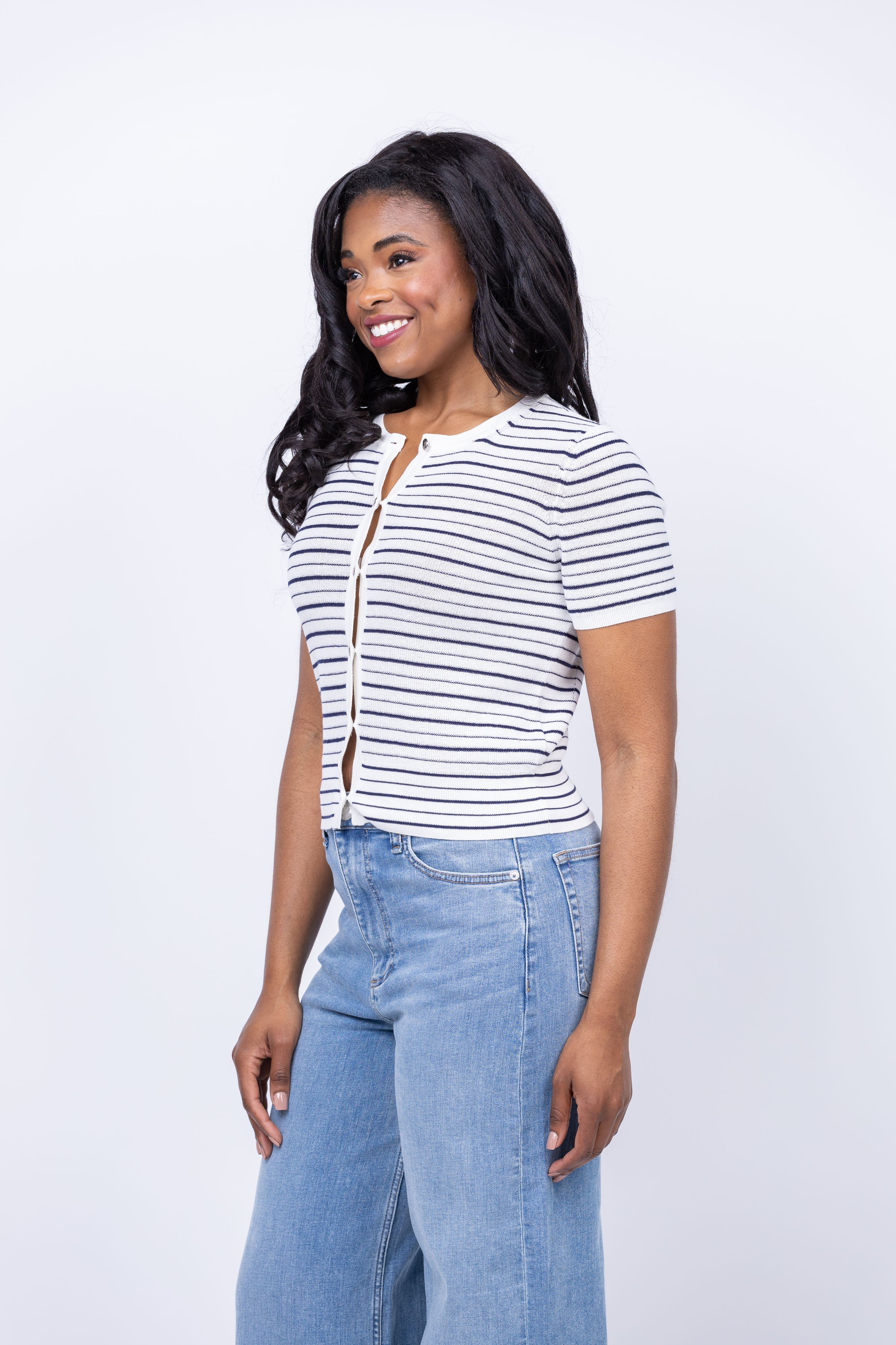 Effortlessly chic and versatile, the Dina Stripe Cardigan is the perfect addition to your wardrobe. Crafted from soft, lightweight yarn and featuring nautical-inspired variegated stripes, this fitted, short-sleeve sweater will keep you stylish and comfortable. With domed metal buttons and a signature V-stitch seam, it's a must-have for the season.