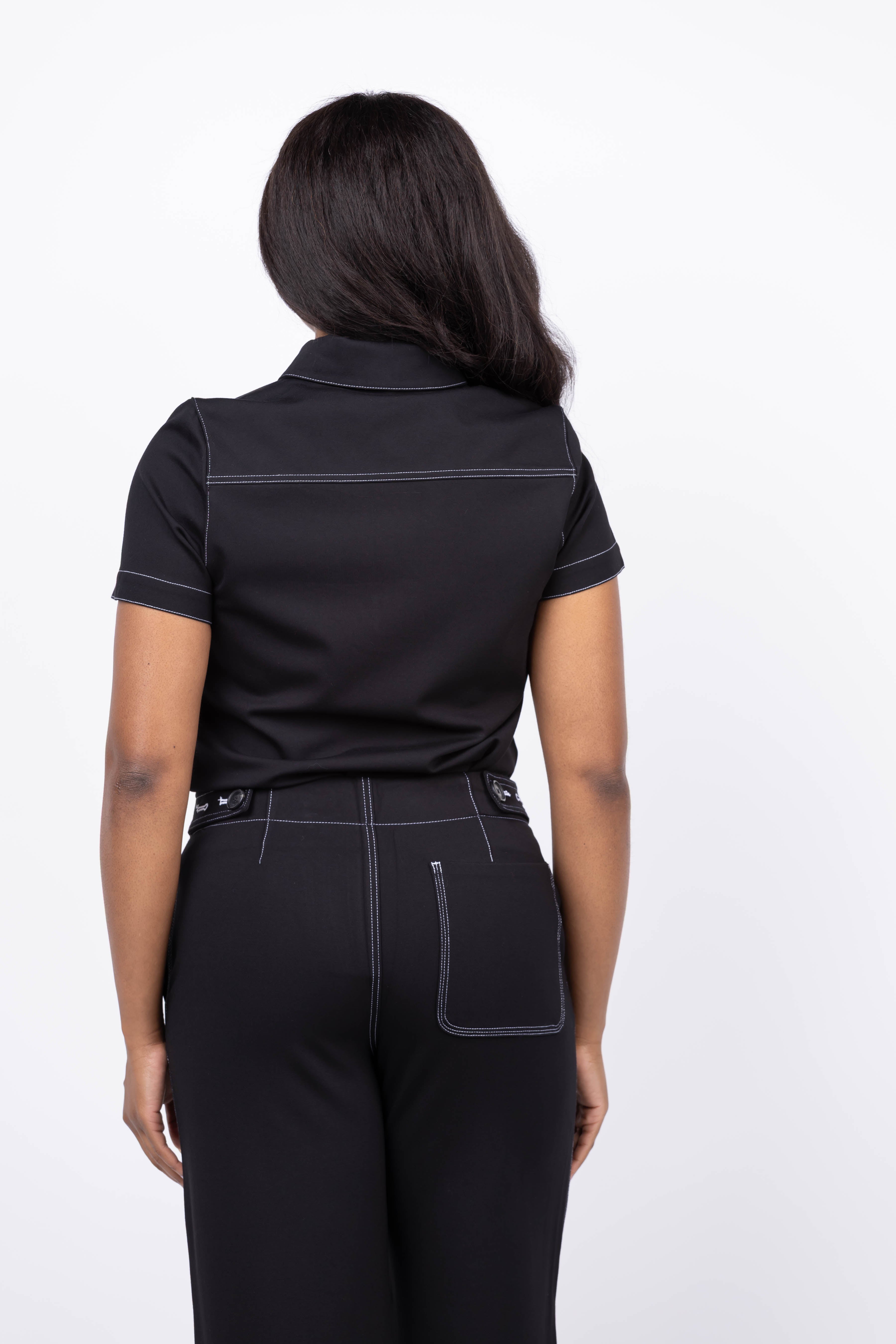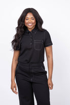 The Rag & Bone Irina Contrast Stitch Polo Top in Black combines timeless style with modern details. Featuring a spread collar and a convenient pullover design with a partial button front, this top offers effortless wearability. Its short sleeves keep you comfortable and cool, while the left chest pocket adds a subtle, functional accent. Perfect for elevating both casual and smart-casual looks, this polo brings a refined edge to your wardrobe.