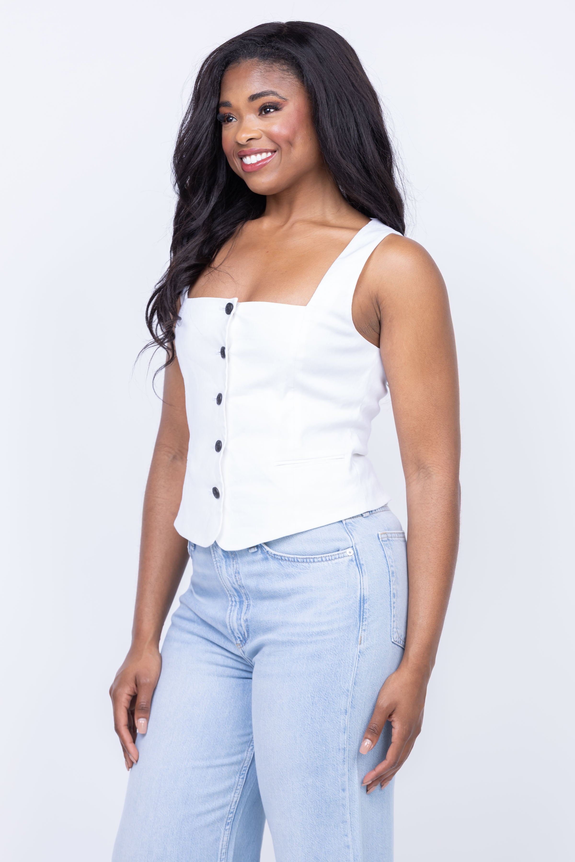 Elevate your summer style with Rag & Bone's Mariana Linen Vest in White. Crafted from a lightweight linen blend, this tailored vest features a square-neck and slim fit for a flattering silhouette. The metal-rimmed buttons add a touch of elevated contrast to this must-have piece.