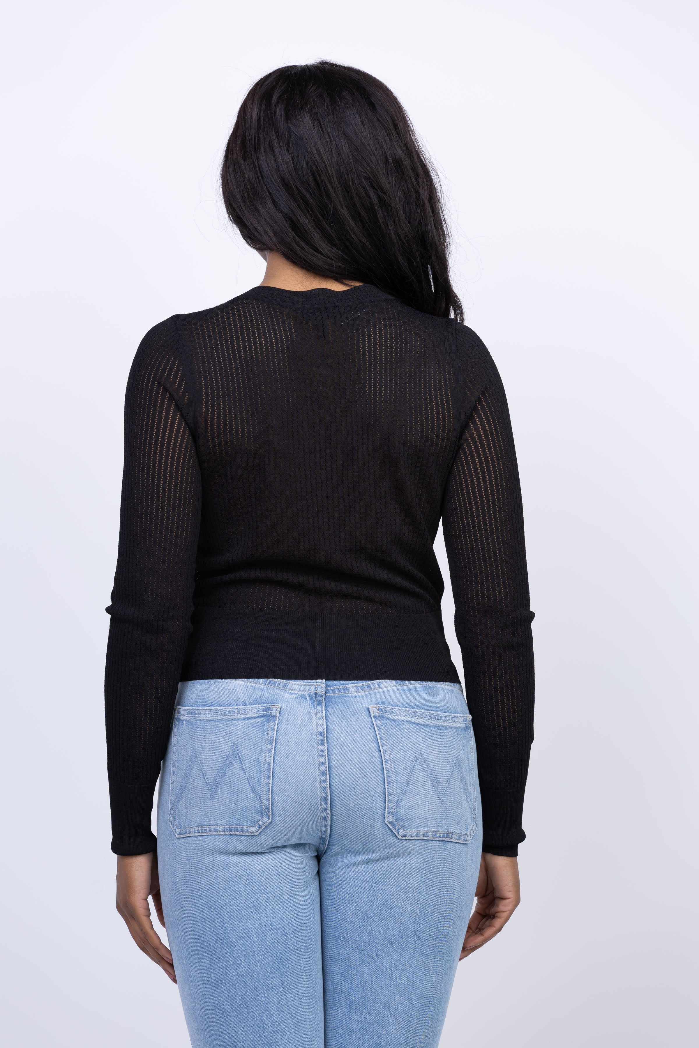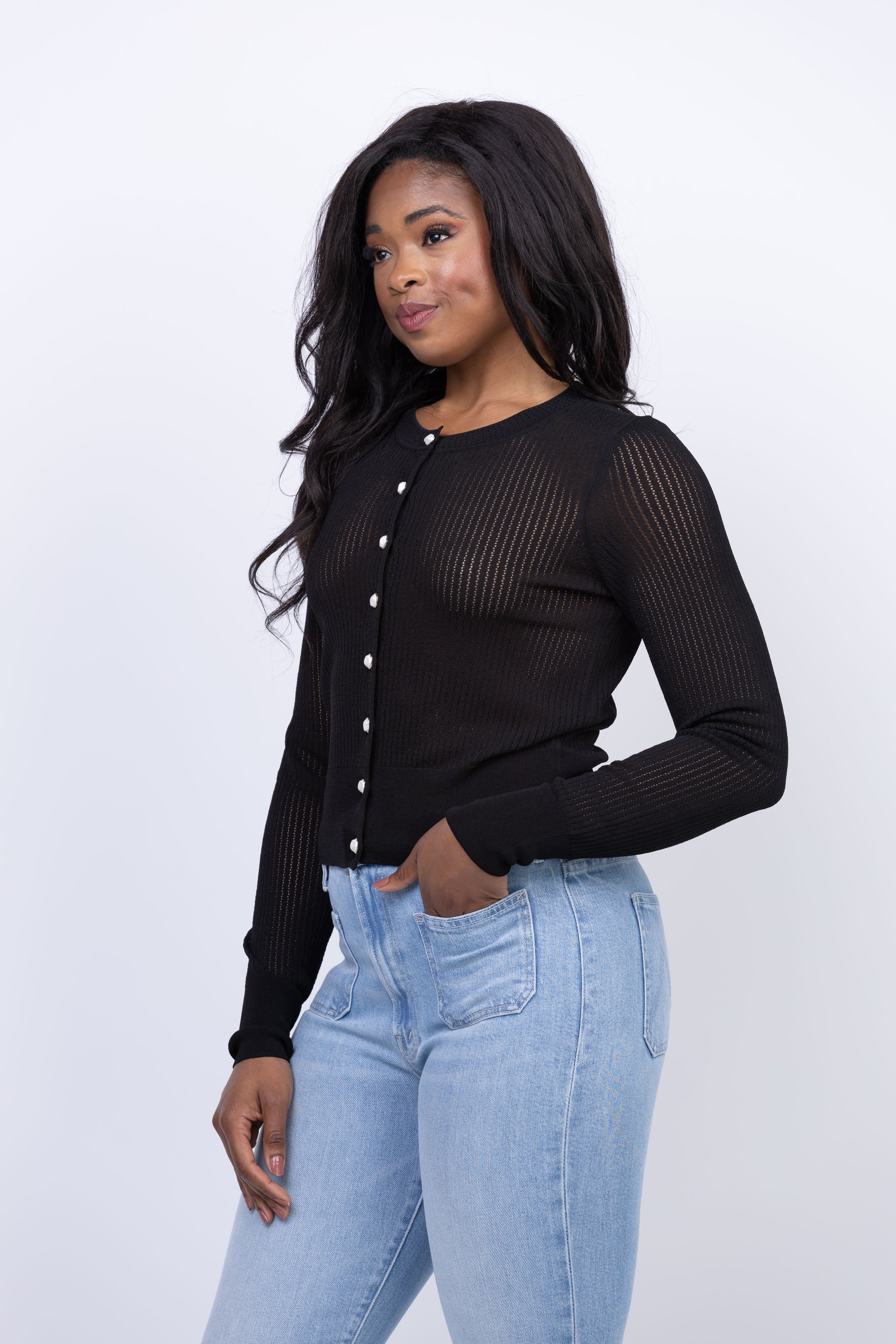 Elevate your wardrobe with the Rag & Bone Molly Cardigan in Black. Light and breathable, this versatile sweater is perfect for any season or occasion. Its classic fit and open-knit texture offer year-round comfort, while the sculptural faux-pearl buttons add a touch of sophistication. Complete your looks with this must-have layer!