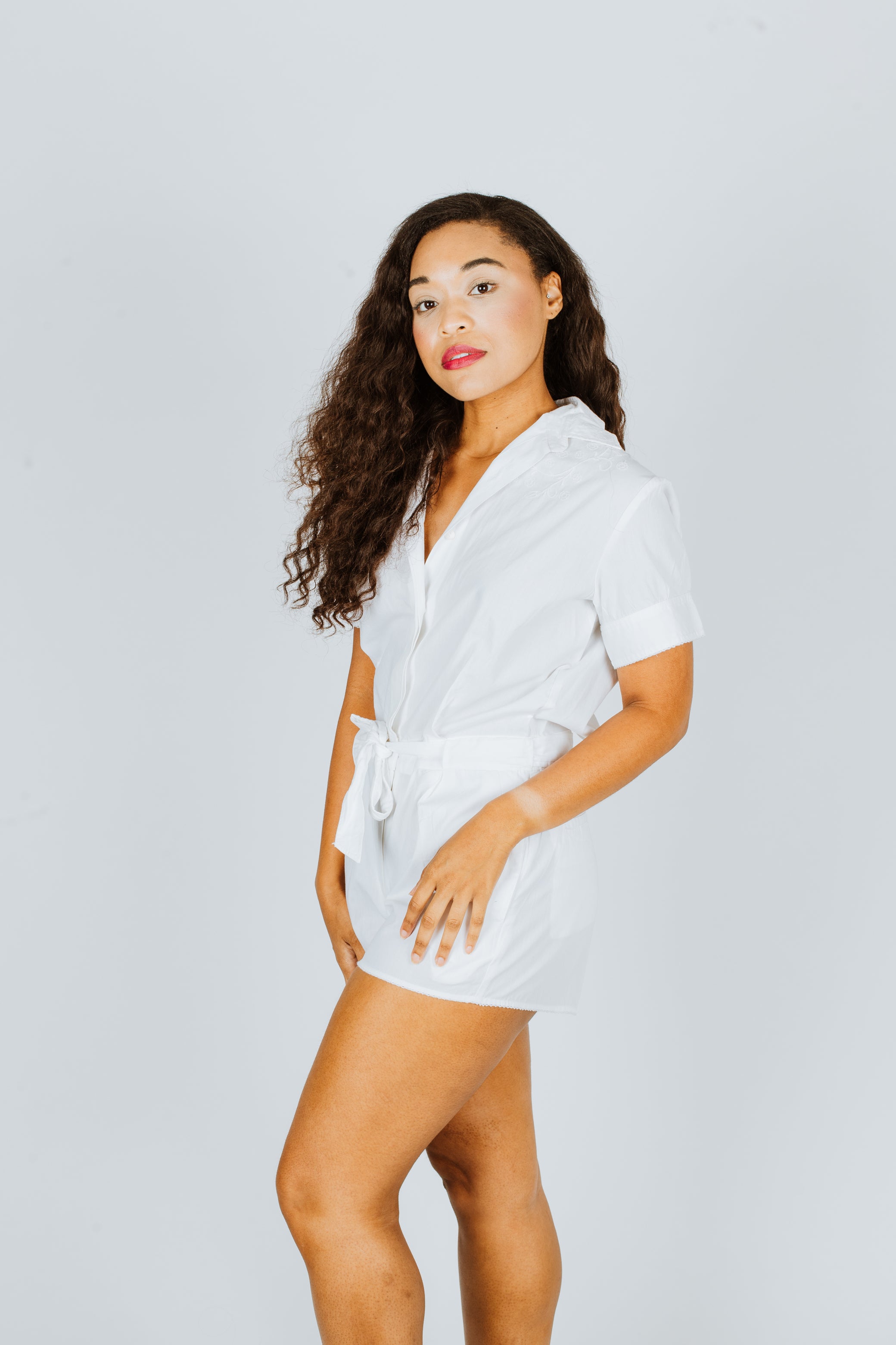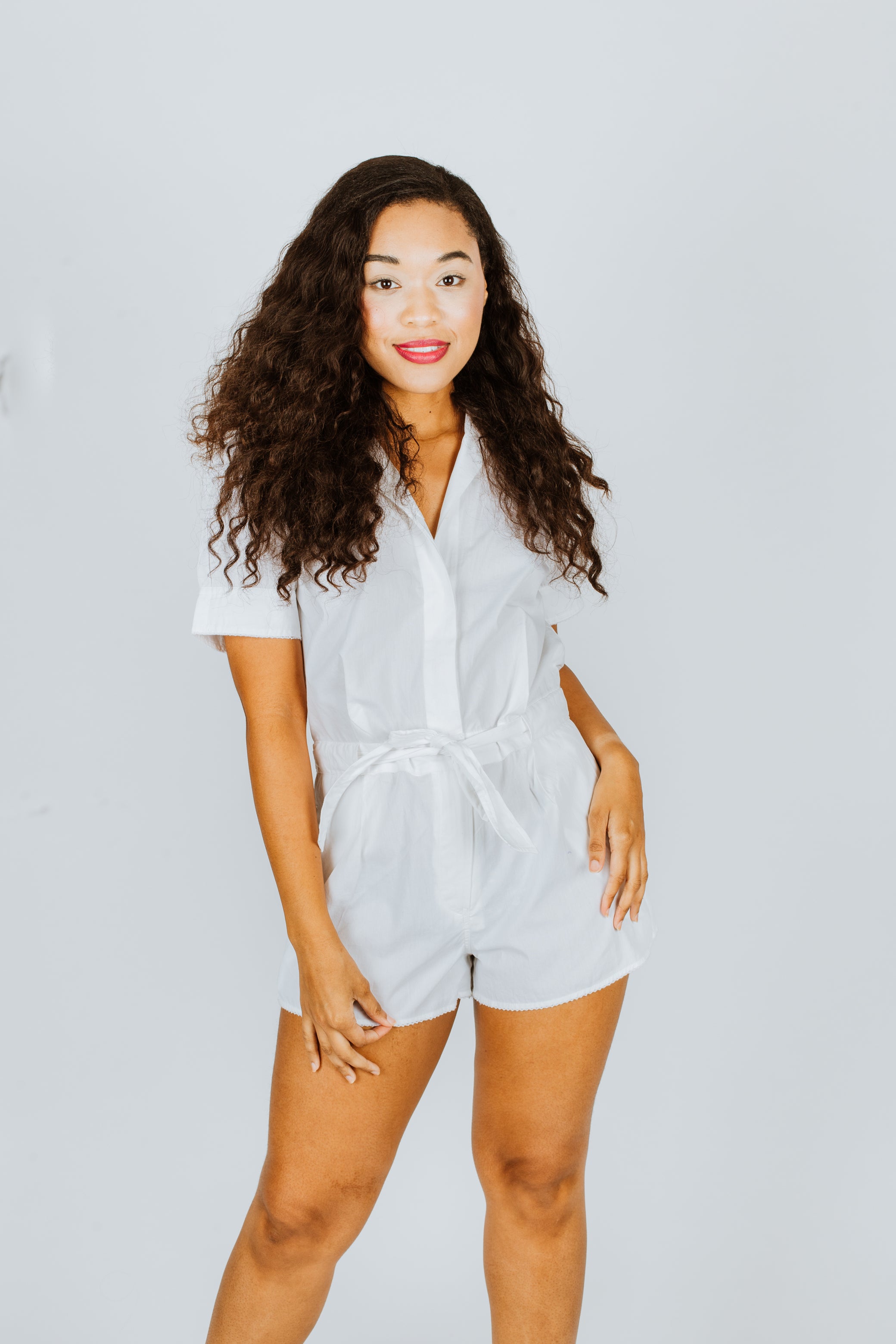 Cinched with a knotted belt, rag & bone's Surplus romper is designed with tonal embroidery.
