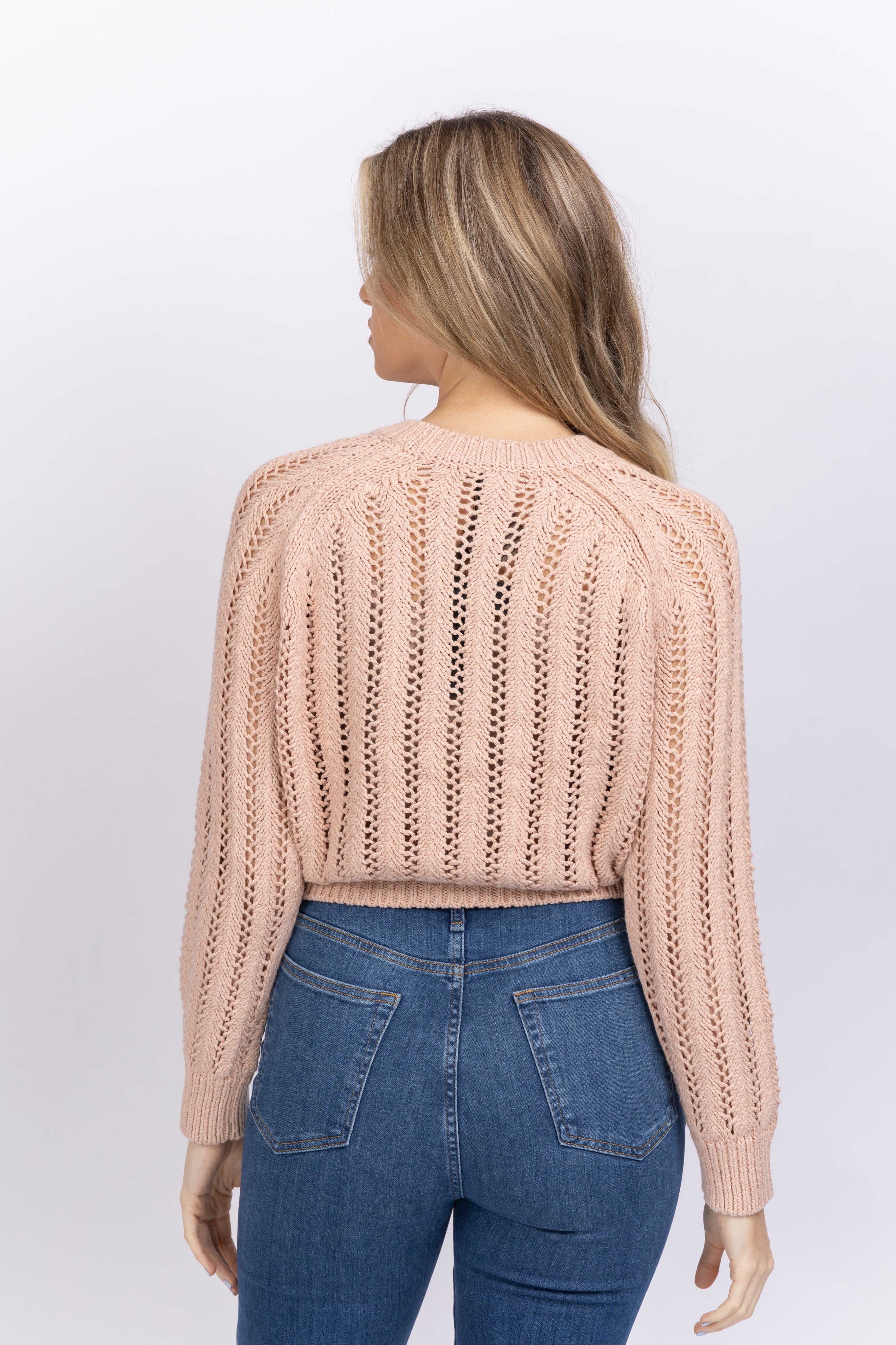 A relaxed fit sweater, crafted with a feminine novelty open knit stitch. This pullover crewneck makes for the perfect layering piece.