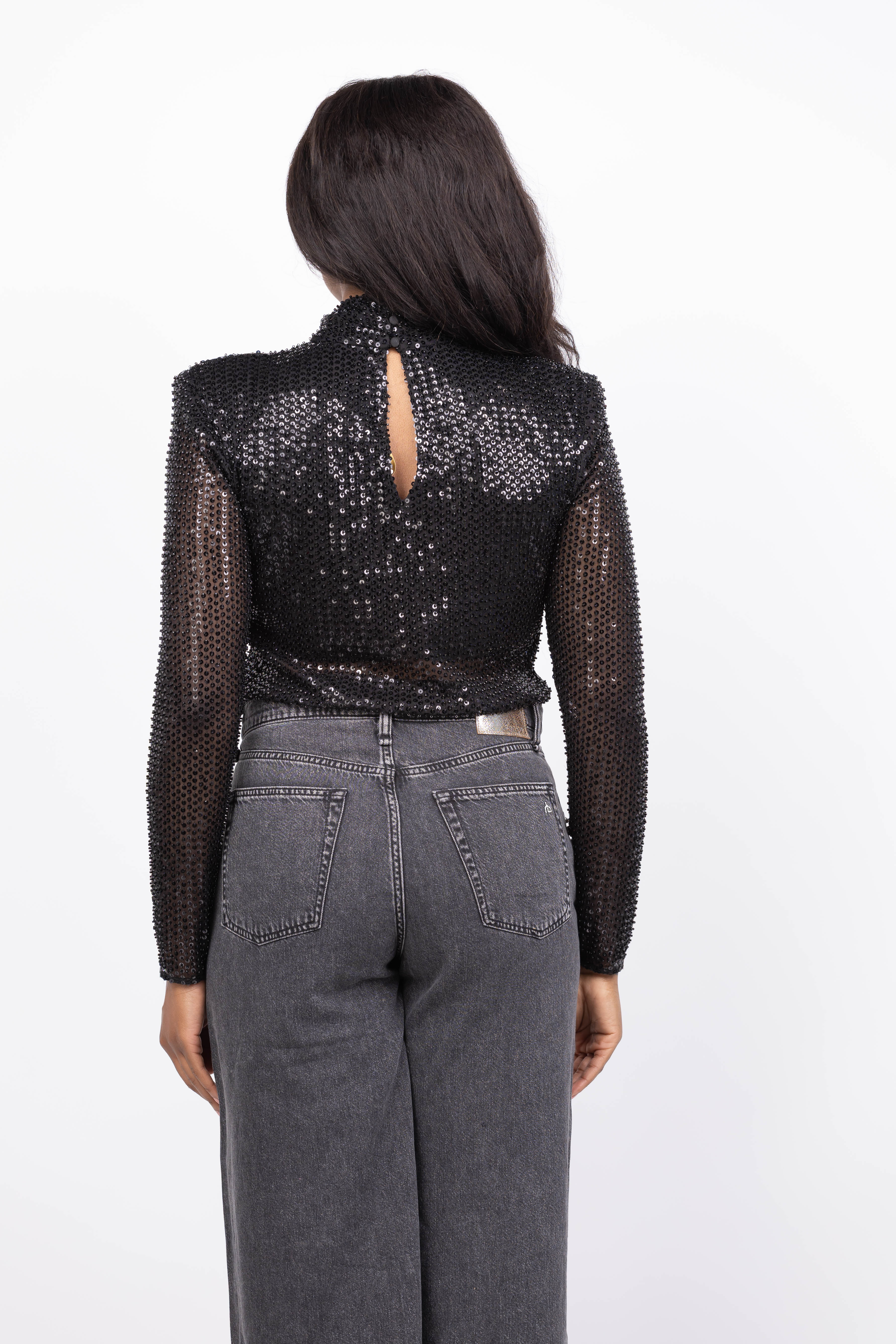 Elevate your wardrobe with the Ramy Brook Amber in Black Beaded Mesh. Its striking beaded mesh and bold shoulder pads create an effortlessly edgy look. The mock neck's high neckline and cropped fit complement high-waisted styles perfectly, offering versatile styling whether layered under a blazer or worn solo. Make a statement and embrace endless outfit possibilities with this standout piece.