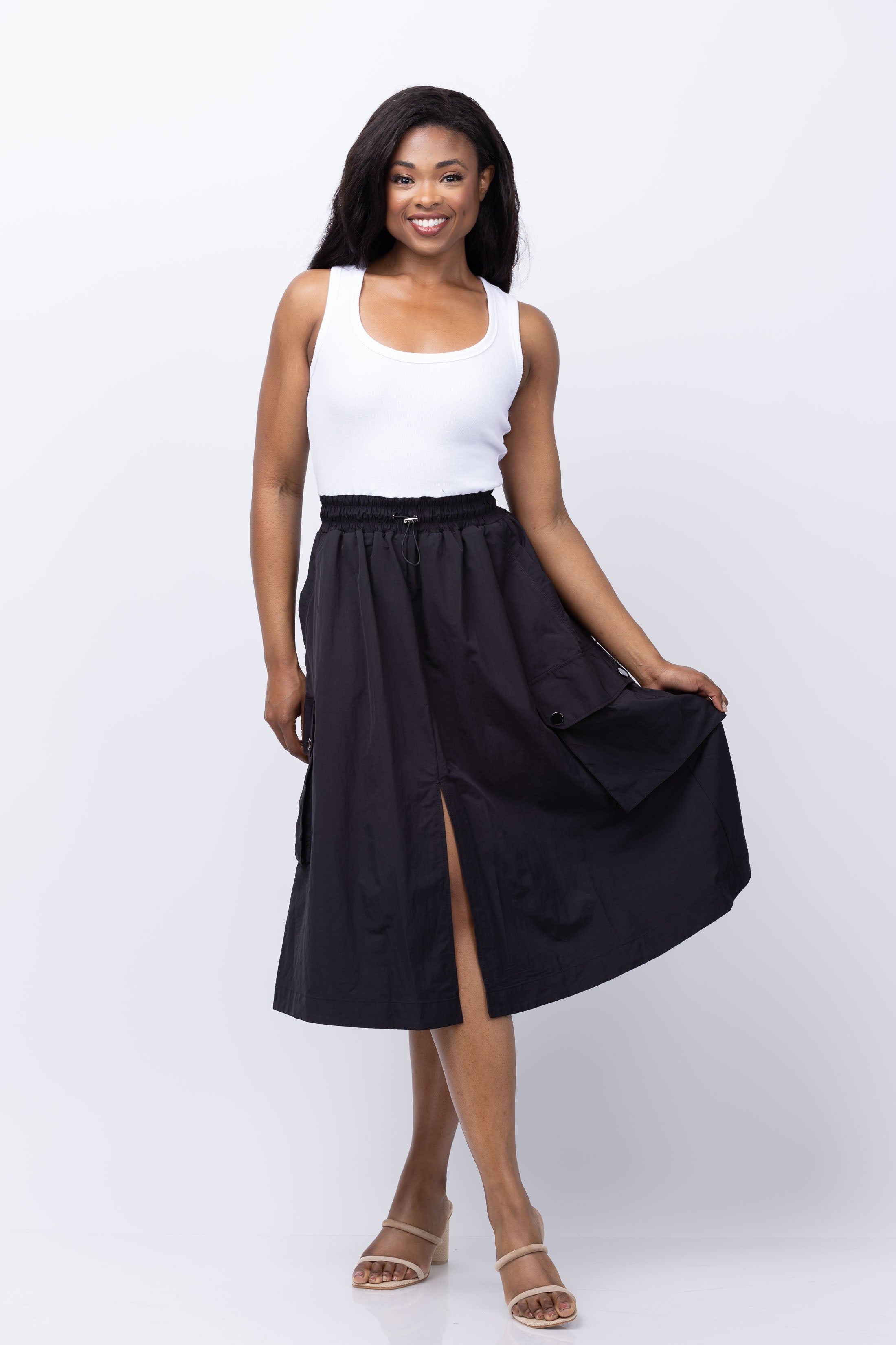 Bringing the statement of separates but with the ease of one piece, get the best of both worlds with the Giovanna. Strong from the start with a classic tank, the attached skirt brings a utilitarian touch with the side pockets and adjustable waist.