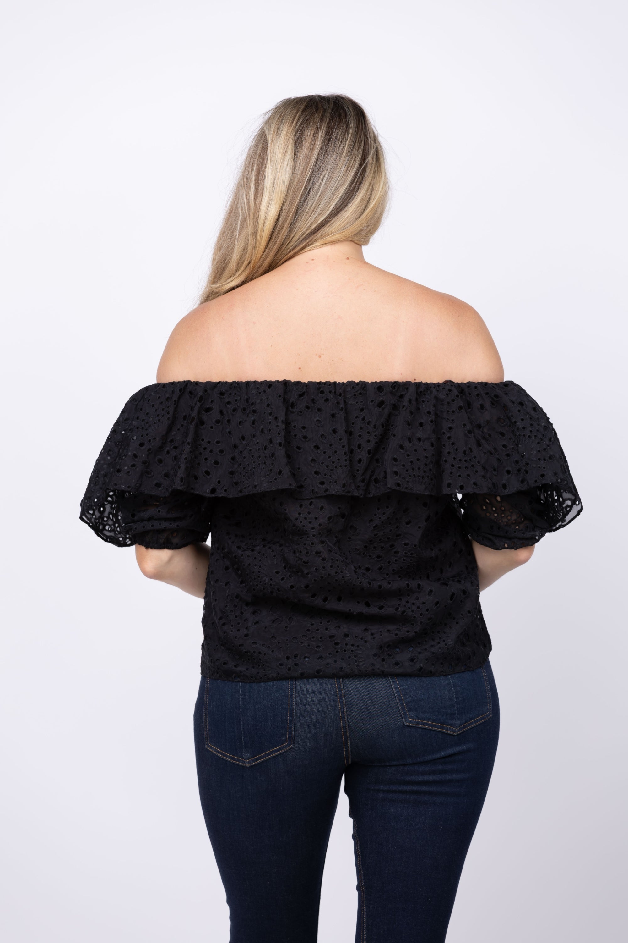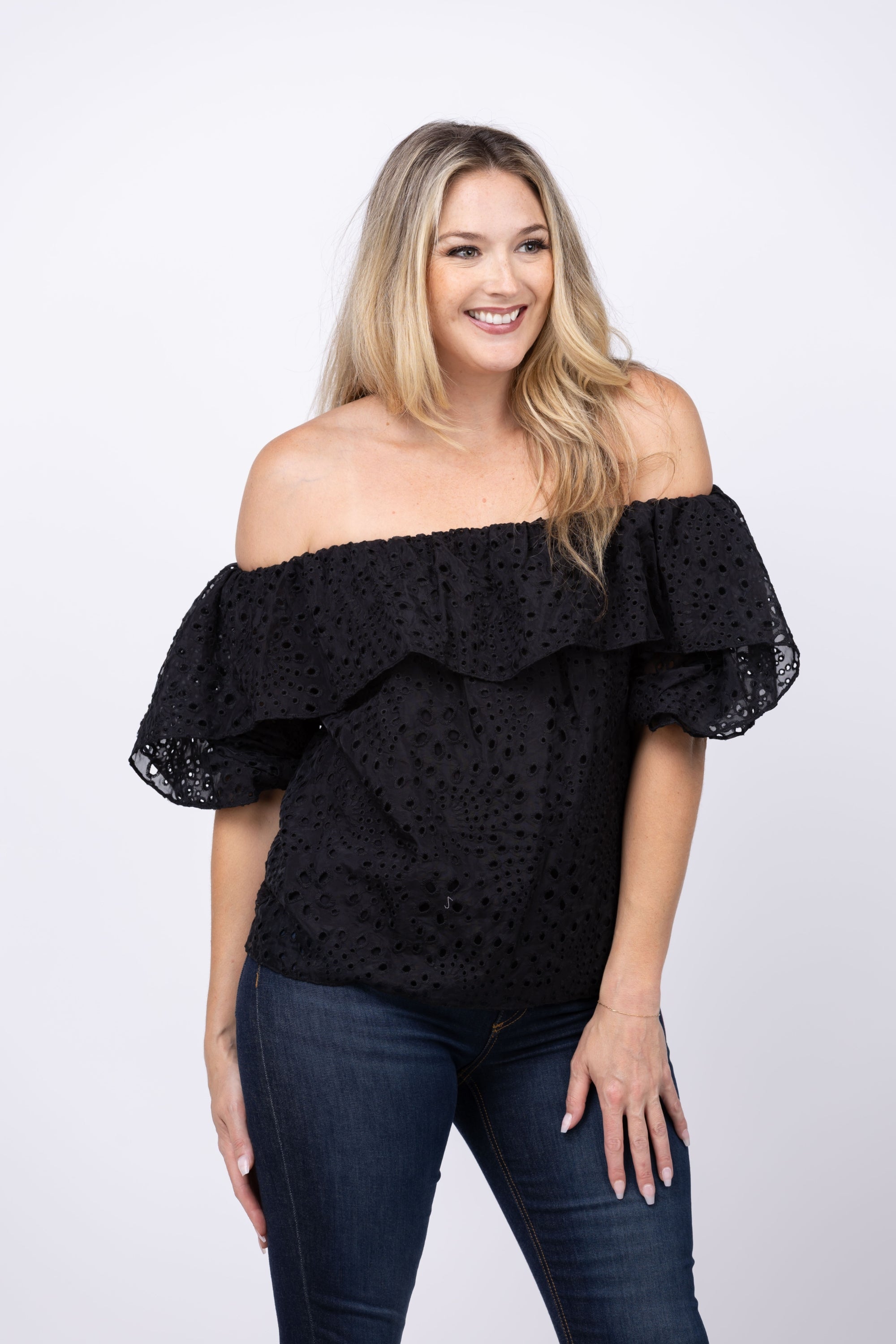 The Salma blouse by Ramy Brook boasts an off-the-shoulder neckline and cascading ruffled tier, adding a touch of playful elegance. Constructed of eyelet-embroidered fabric, this relaxed fit blouse is hip-length and features 3/4 balloon sleeves with elastic cuffs. Slip it on effortlessly and elevate your style!