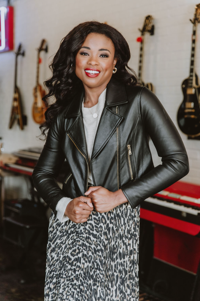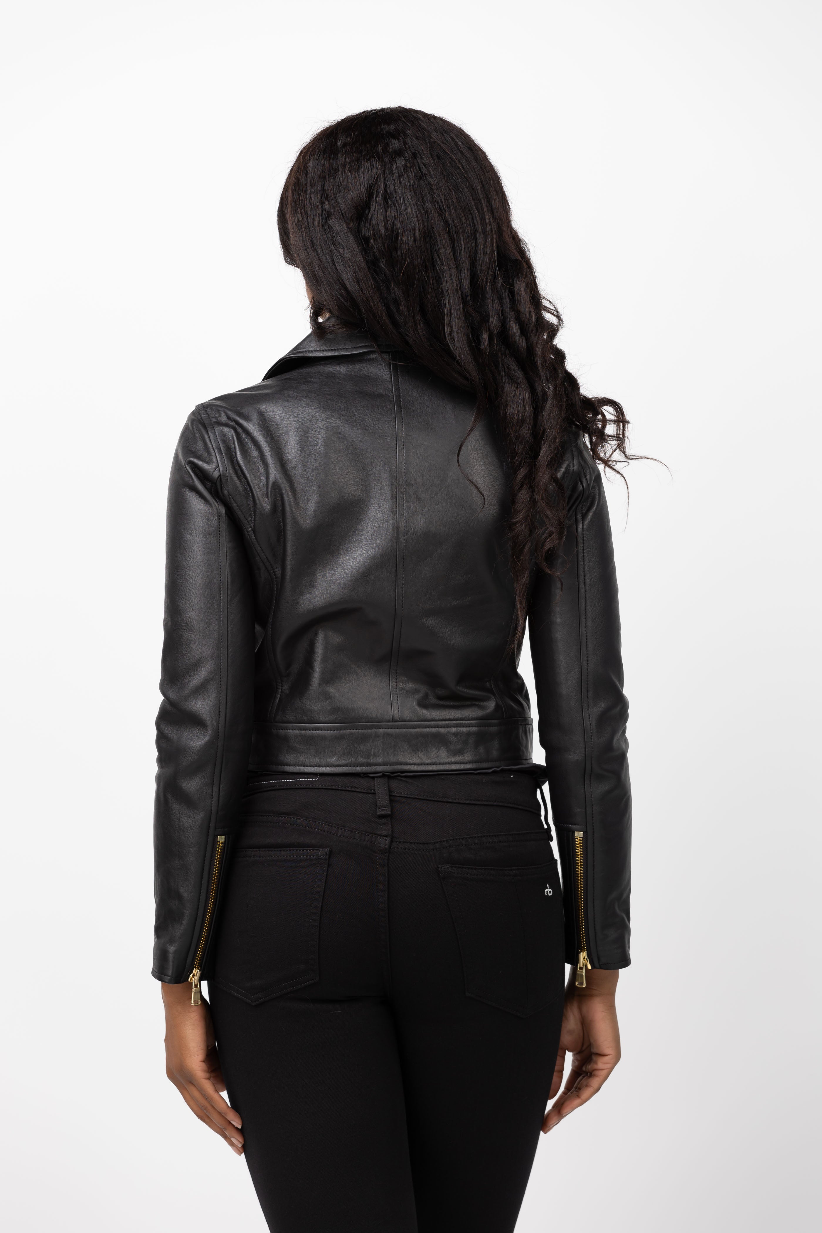 This luxe black leather jacket from L'Agence is the perfect blend of edge and sophistication. With a fitted design featuring gold zipper and zippered pockets, you'll look polished yet daring. Its tapered silhouette from shoulder to waist creates a flattering silhouette. You'll feel chic and confident every time you slip it on.