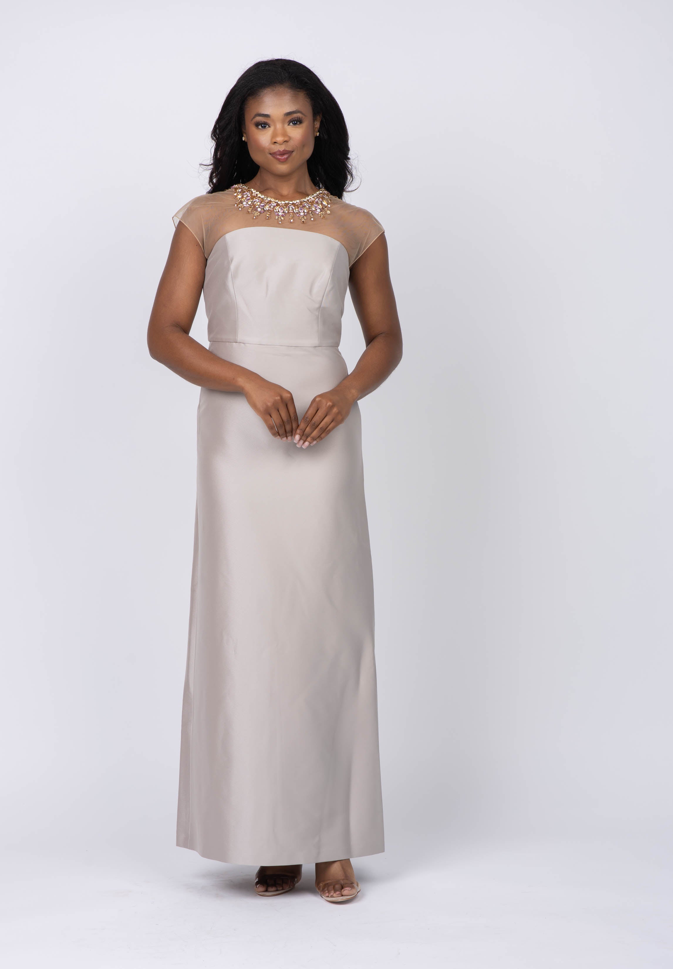Experience timeless elegance in the Irina Gown in Frosty Pewter. This exquisite gown is crafted from stretch mikado fabric for a truly luxurious feel. A beautiful illusion neckline adorned with intricately beaded embellishments adds an air of sophistication. Showcase your style with this elegant column gown - perfect for special occasions.