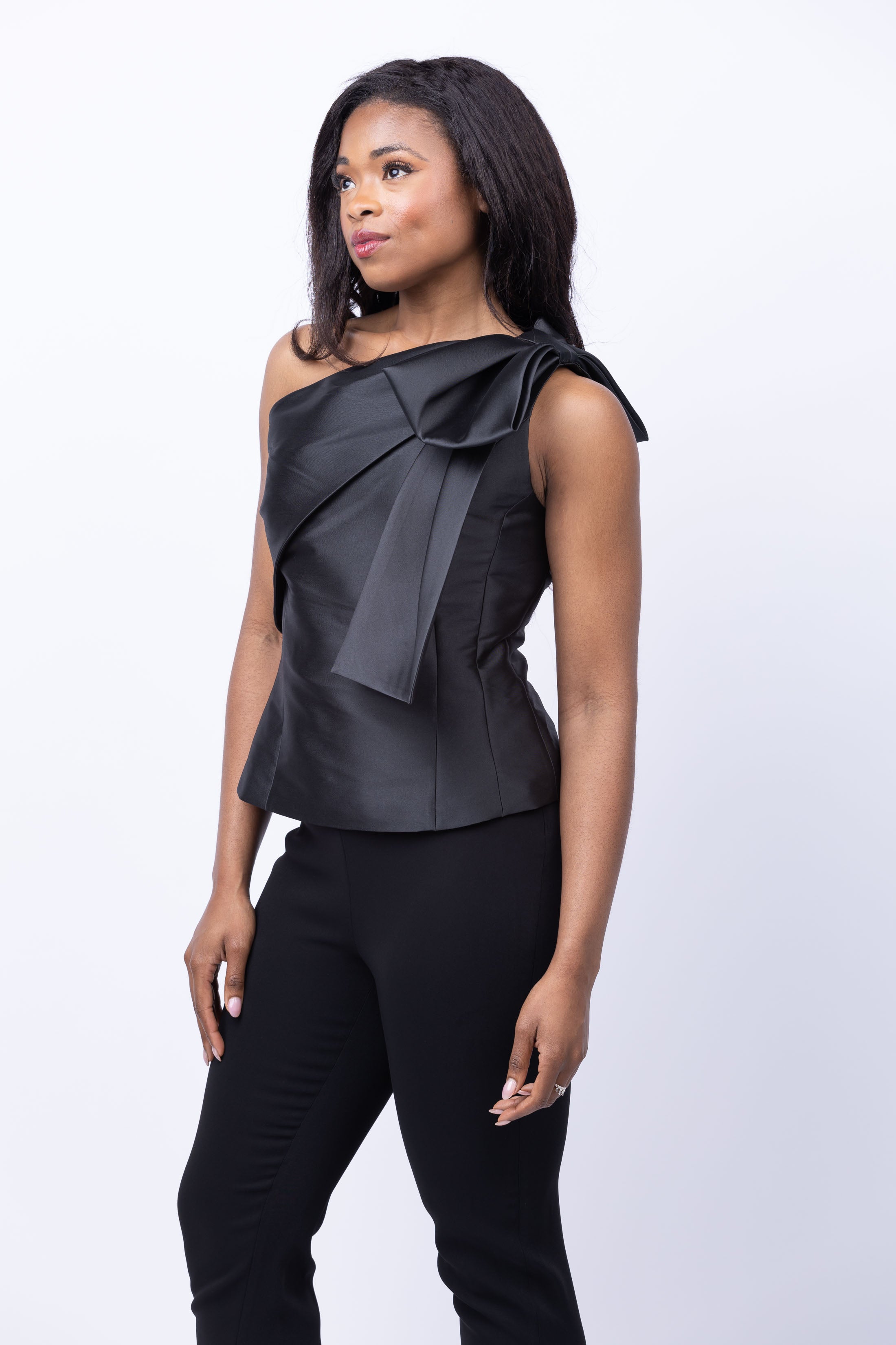 Introducing the Sachin & Babi Bebe Top in Black. Make a statement with this staple piece featuring a one shoulder silhouette and bow detail. Made with signature stretch Mikado, this top offers both style and comfort, making it a go-to piece in your wardrobe.