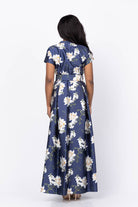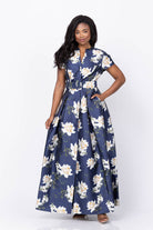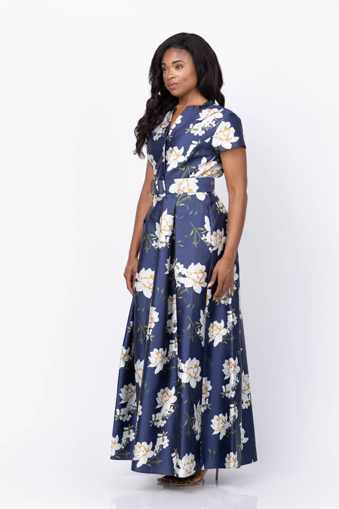 The Sachin & Babi Marta Gown in Navy Narcissus combines timeless sophistication with modern tailoring. This floor-length dress features a shirt-style fit highlighted by a banded collar and delicate tonal crystal embellishments along the center placket. With a concealed button closure, self-belt, and hidden micro elastic at the waist, it offers both elegance and comfort. The exclusive Navy Narcissus print adds a unique touch, making this gown a perfect choice for elevating your personal style with effortless grace.