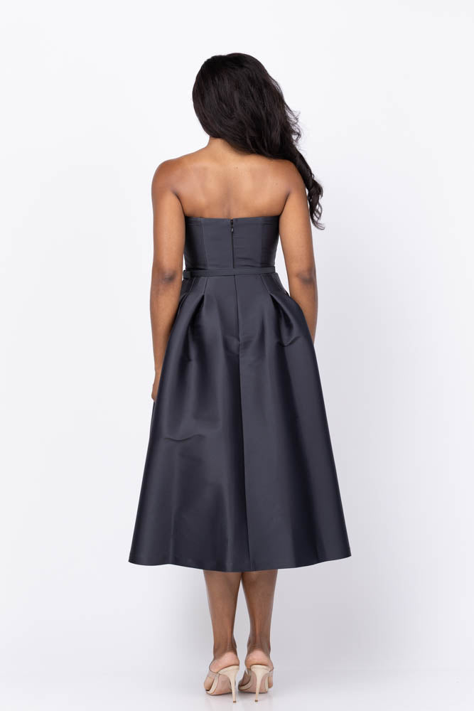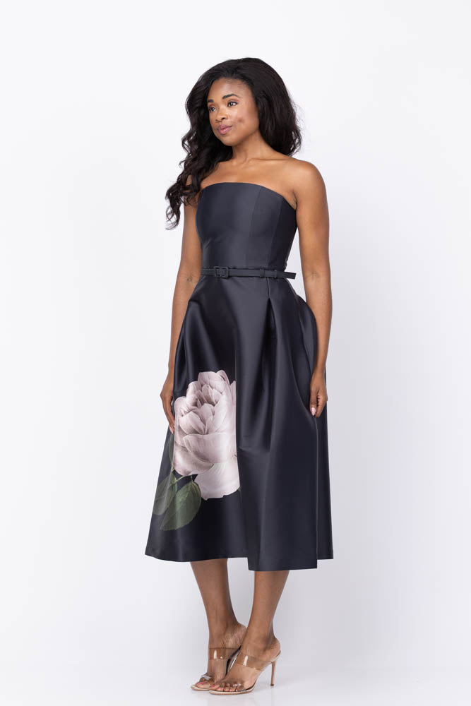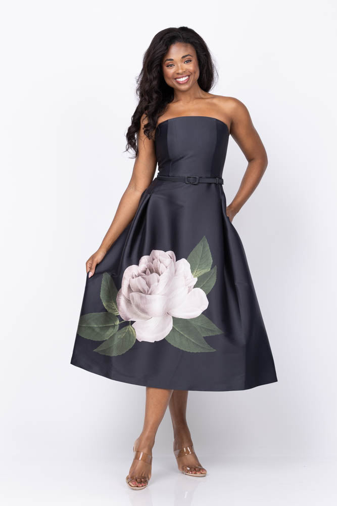 The Sachin & Babi Shay Dress in Blooming Rose is a strapless, tea-length masterpiece designed to impress. Its fitted bodice flows gracefully into an A-line skirt, enhanced by an optional skinny belt for added definition. The oversized blooming rose print, exclusive to Sachin & Babi, transforms this elegant silhouette into a true work of art, perfect for making a memorable statement at any event.
