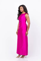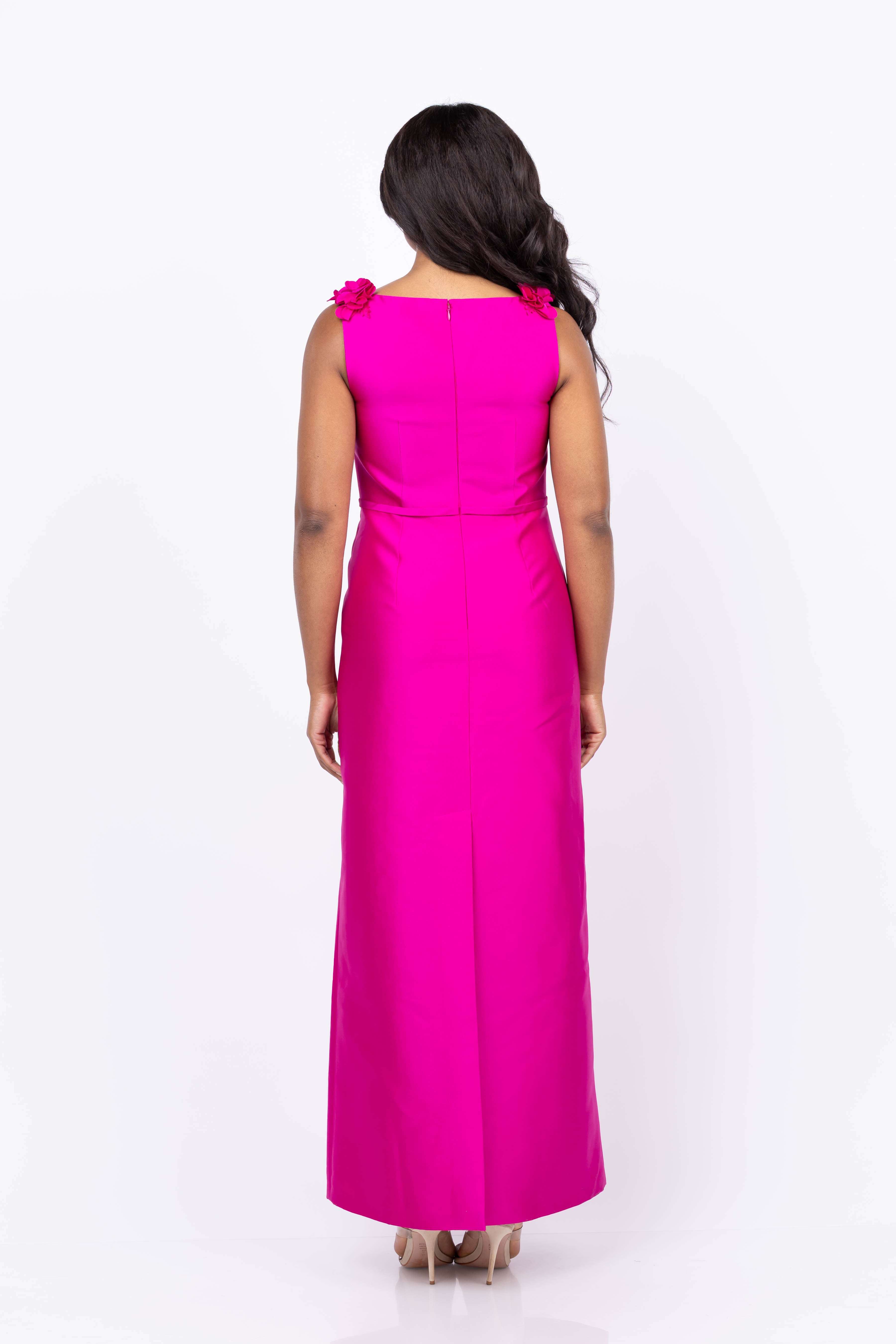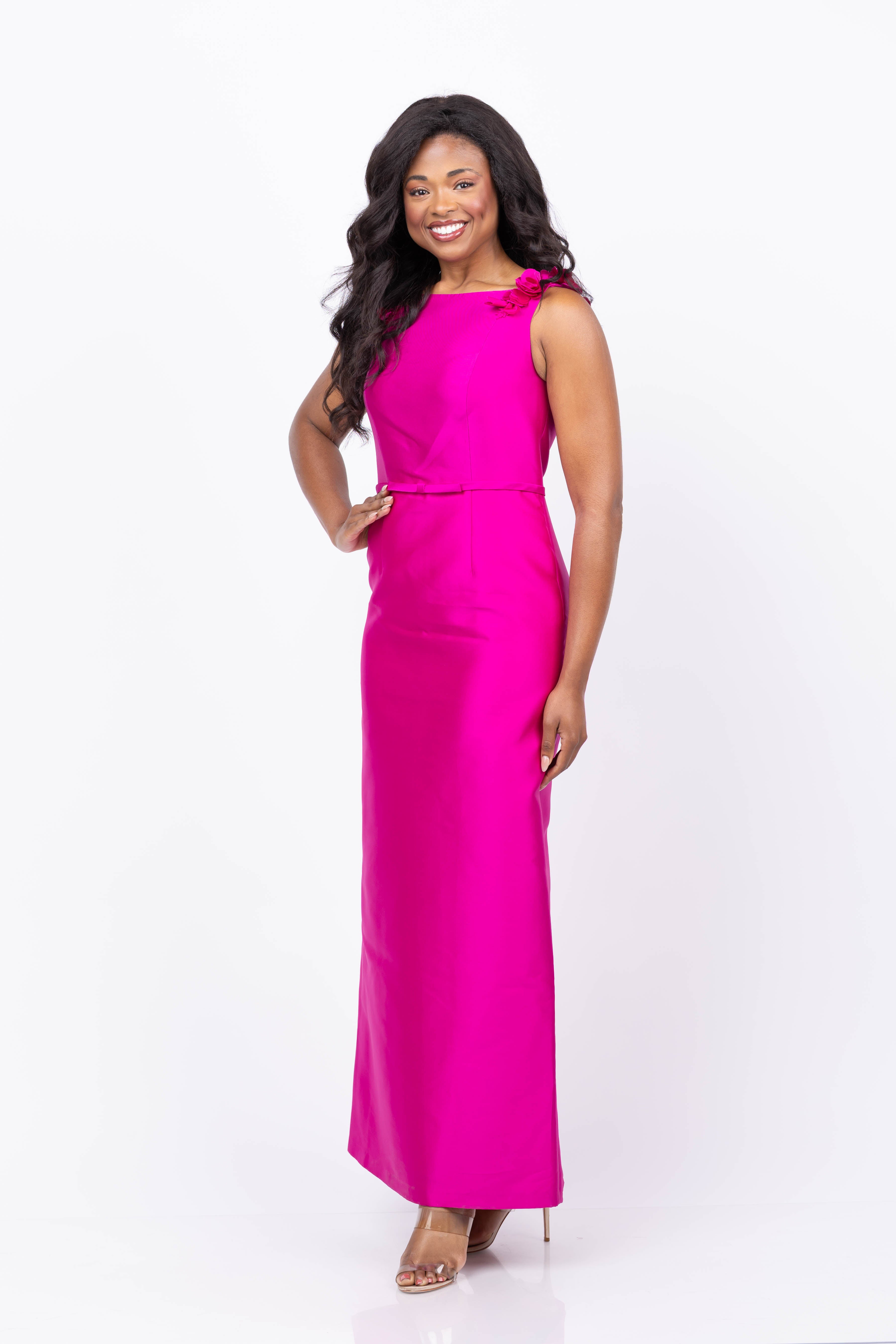 Celebrate elegance with the Sachin & Babi Thea Gown in Magenta. Featuring delicate floral appliqués at the shoulders, this gown combines soft, feminine details with a sleek, structured column silhouette. The slim bow belt cinches the waist, creating a flattering shape that exudes timeless sophistication with a modern twist. Perfect for making a statement at any special occasion.