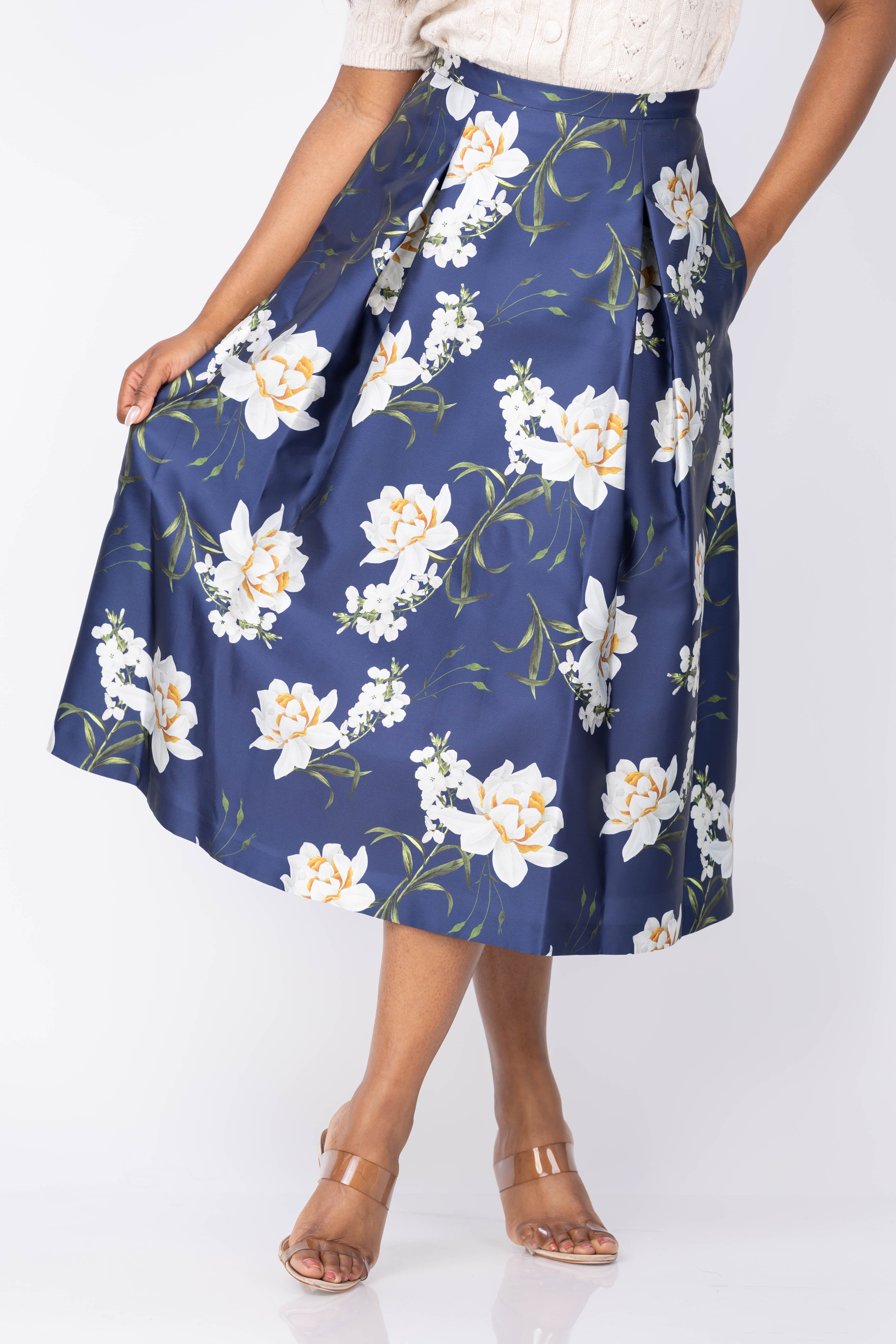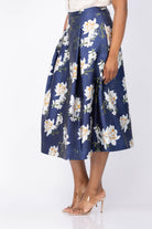 The Sachin & Babi Tippy Skirt in Navy Narcissus blends bold floral prints with elegant volume for a striking look. Crafted from luxurious Mikado fabric, its high-waisted, full A-line shape flows into a graceful midi length, perfect for making a memorable impression at garden parties, luncheons, or daytime events. Elevate your wardrobe with this romantic skirt that balances feminine charm and confident style.