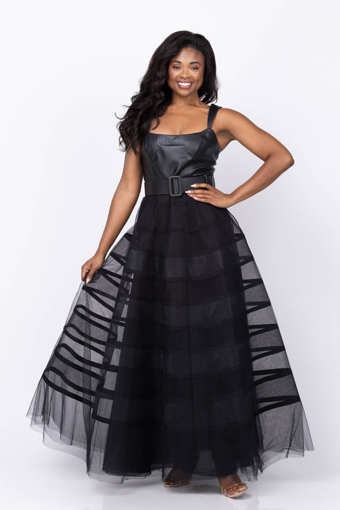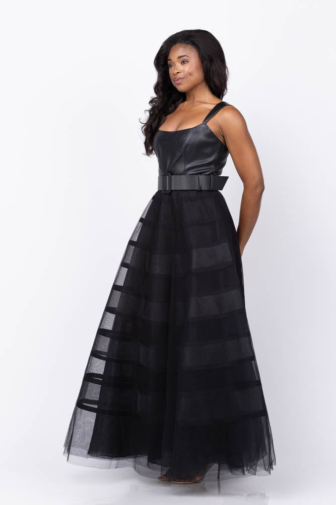 Step into the spotlight with the Sachin & Babi Veruca Gown in Black. Crafted from bold faux leather, this ball gown enhances your silhouette while making a striking statement. Ideal for any event where you want to be unforgettable, it combines glamour and edge to create a fun, flirty look that commands attention.