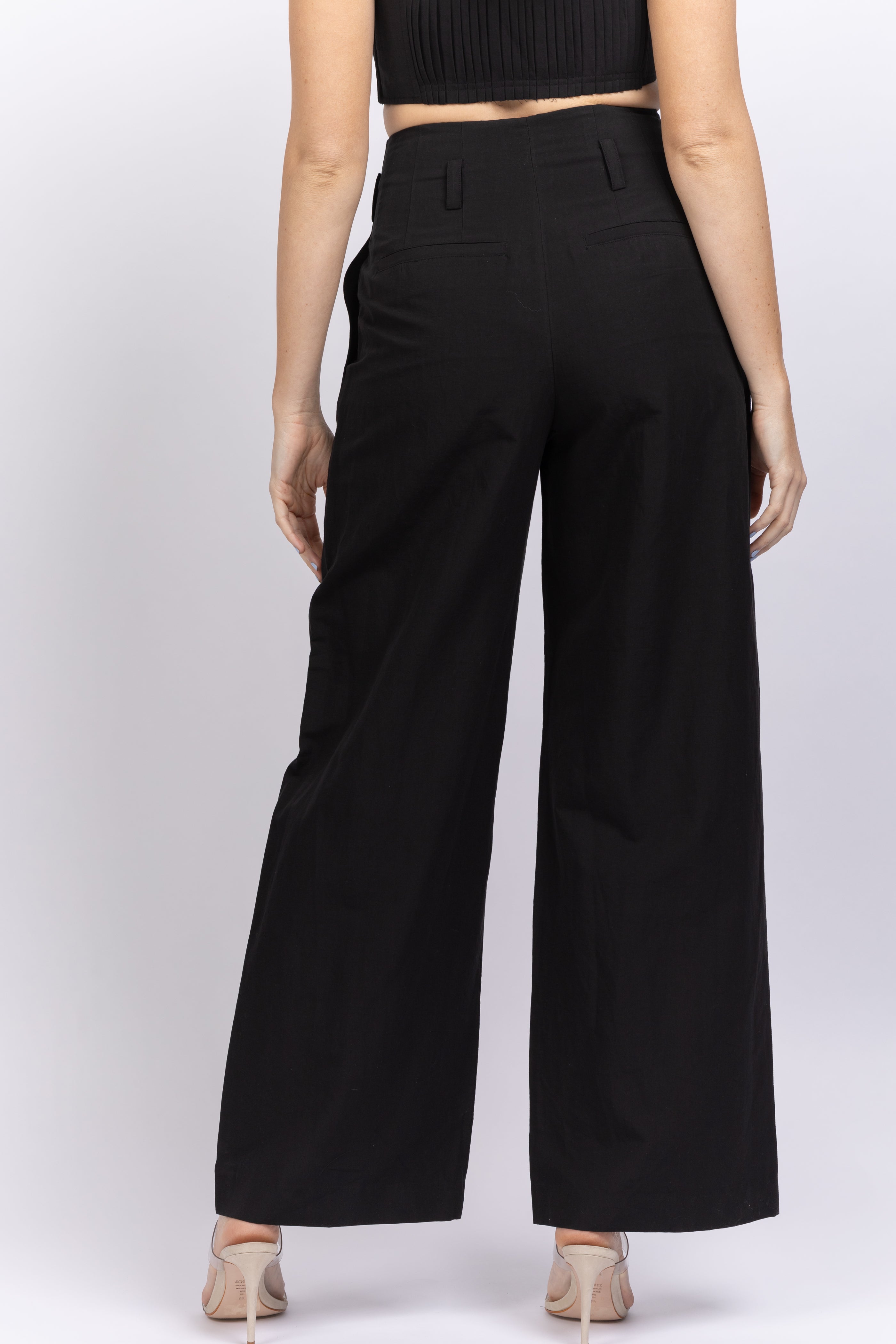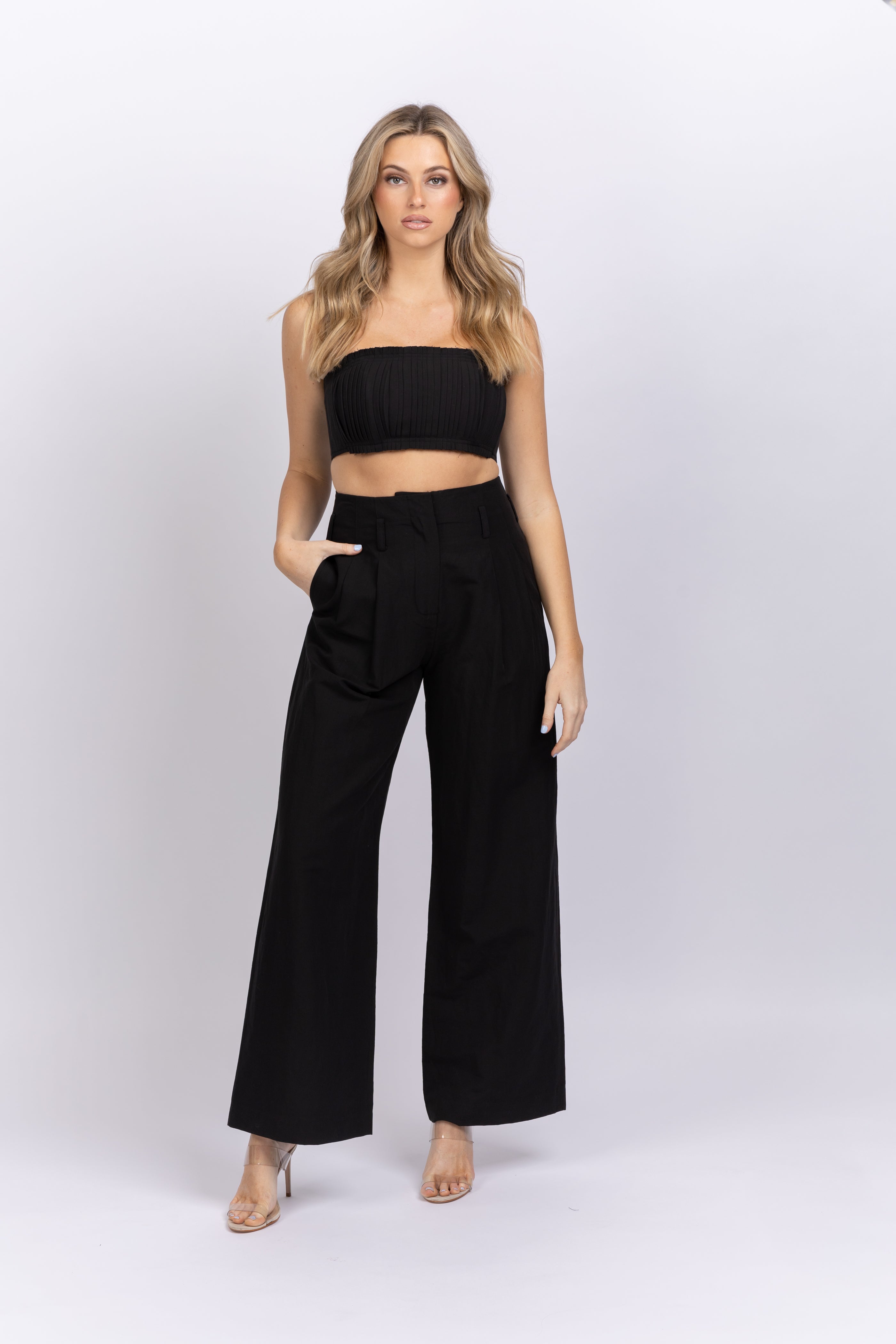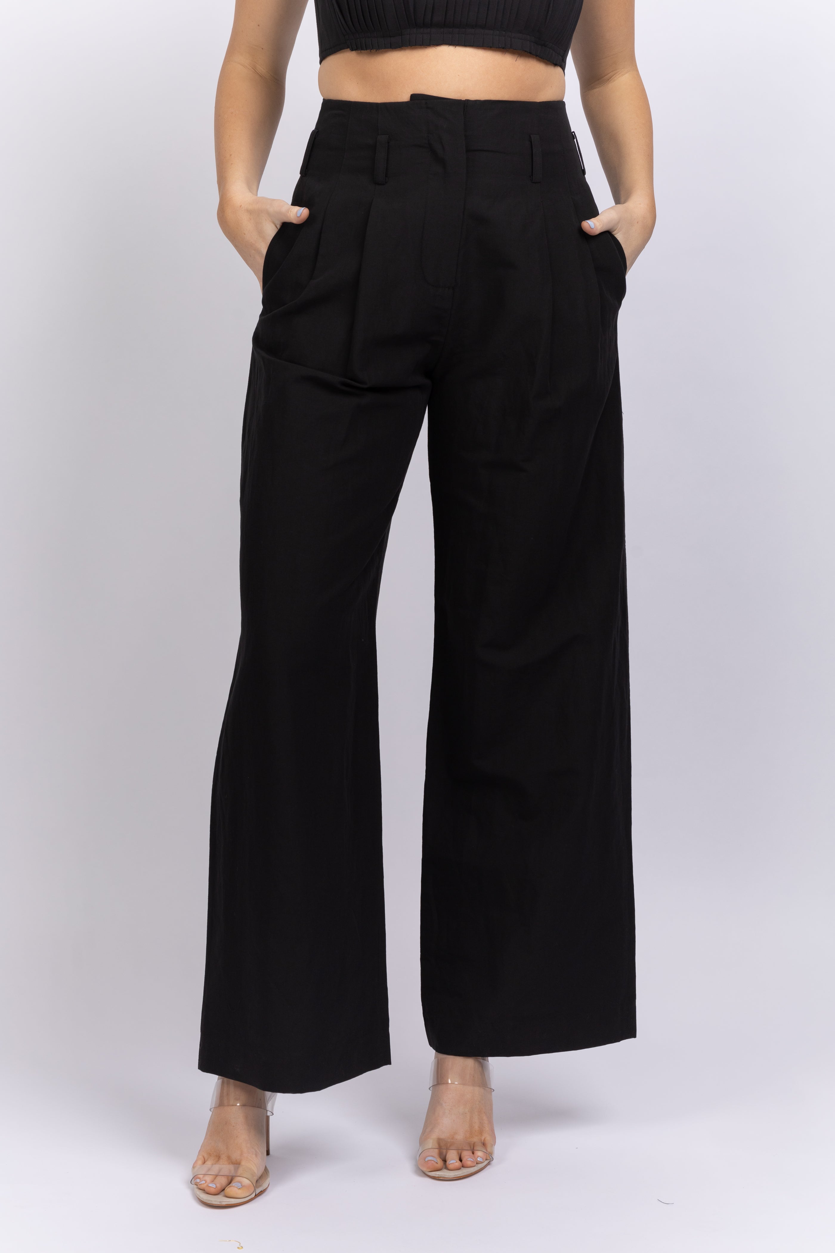 The Pascale Pant is made from our new suiting fabrication, a softly textured blend of cotton, linen, and silk. Sitting at the high-waist, these black trousers are super wide-leg and feature a sleek waistline, thin belt loops, and side-seam pockets.