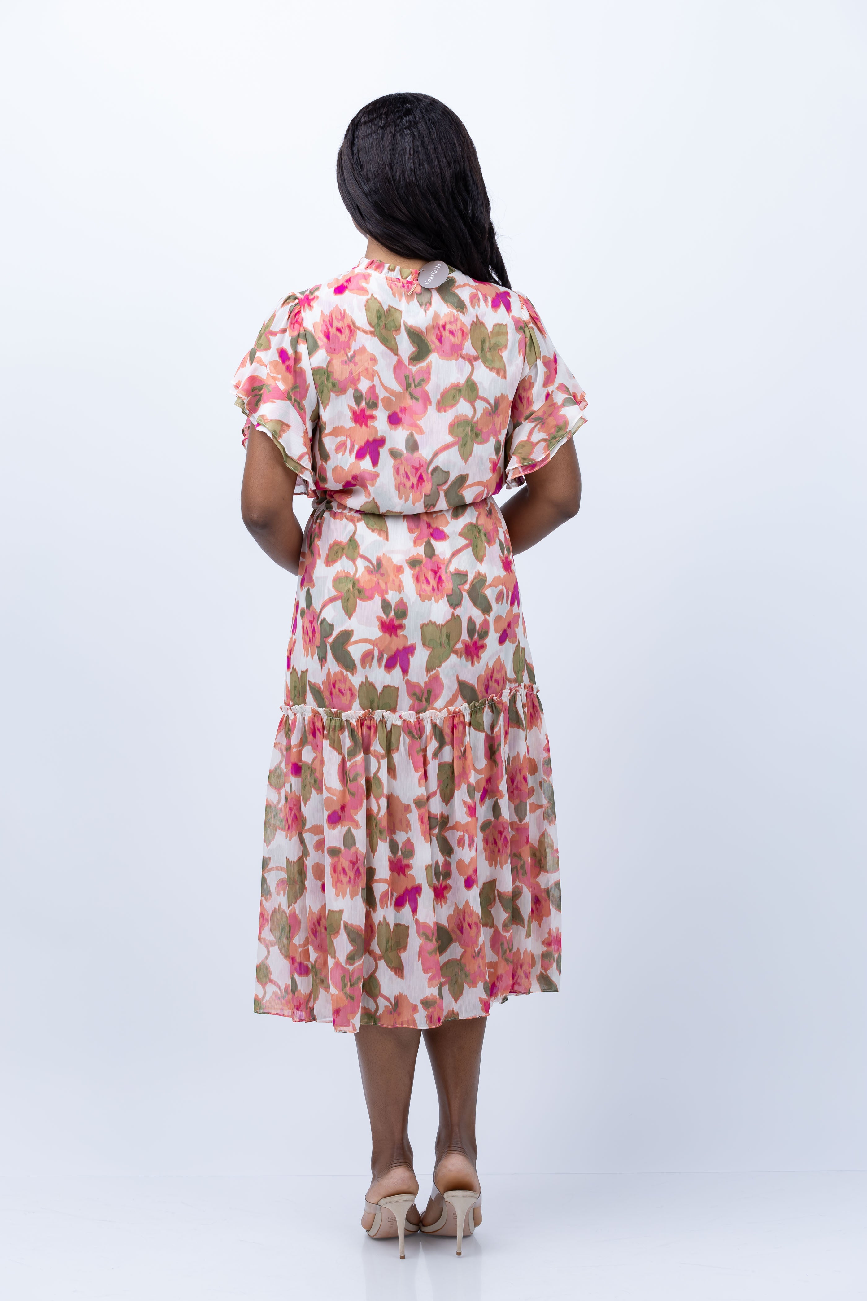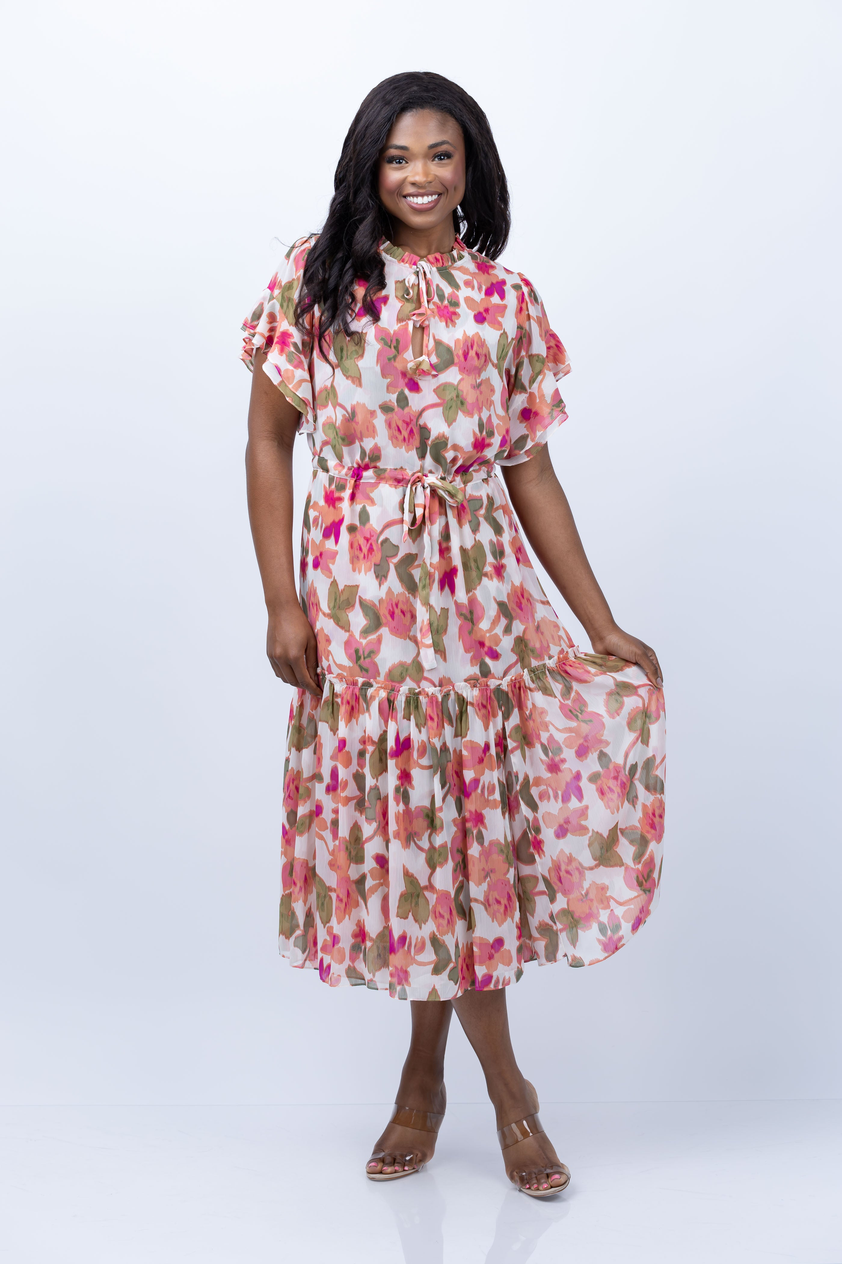Introducing the Misa Ranjana Dress, crafted with a beautiful Sonoran Flora printed chiffon. Designed with an elegant midi silhouette, featuring a v-neckline, flutter sleeves, and an elasticized tie waist for a perfect fit. Complete with petal tassel ties and a split ruffle hem, this MISA classic will elevate your style all year long!