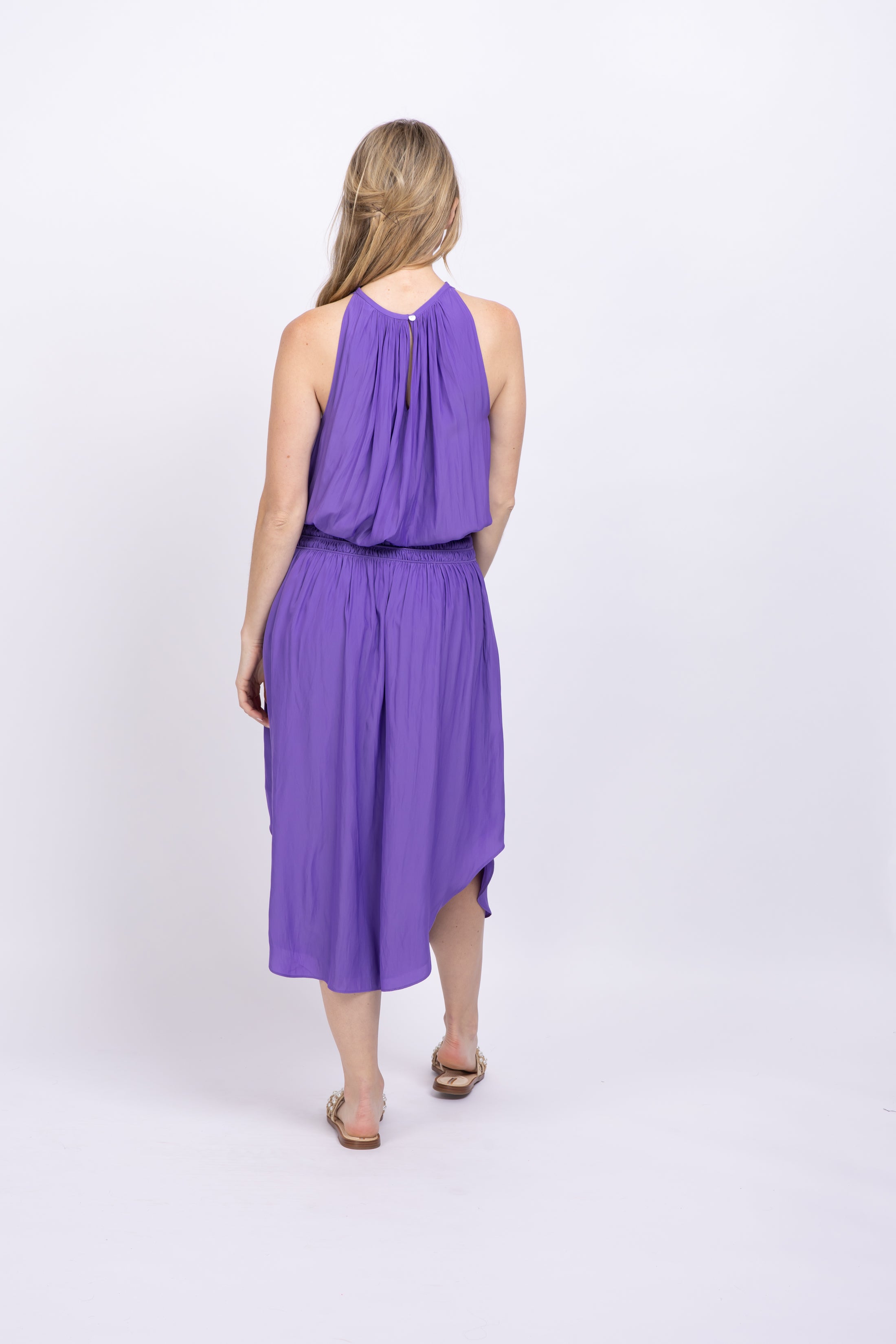 From Ramy Brook, the Audrey midi-dress features a rounded hem, a blouson-style bodice, and a wide smocked waistband. This fluid piece is styled with a keyhole detail at the neck, wearable in front or back.