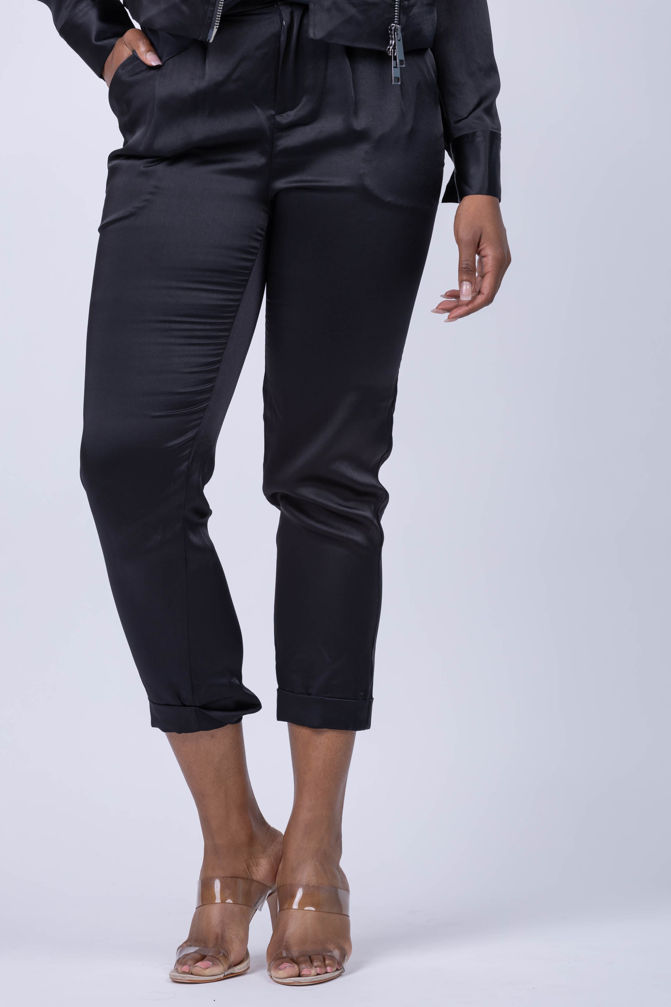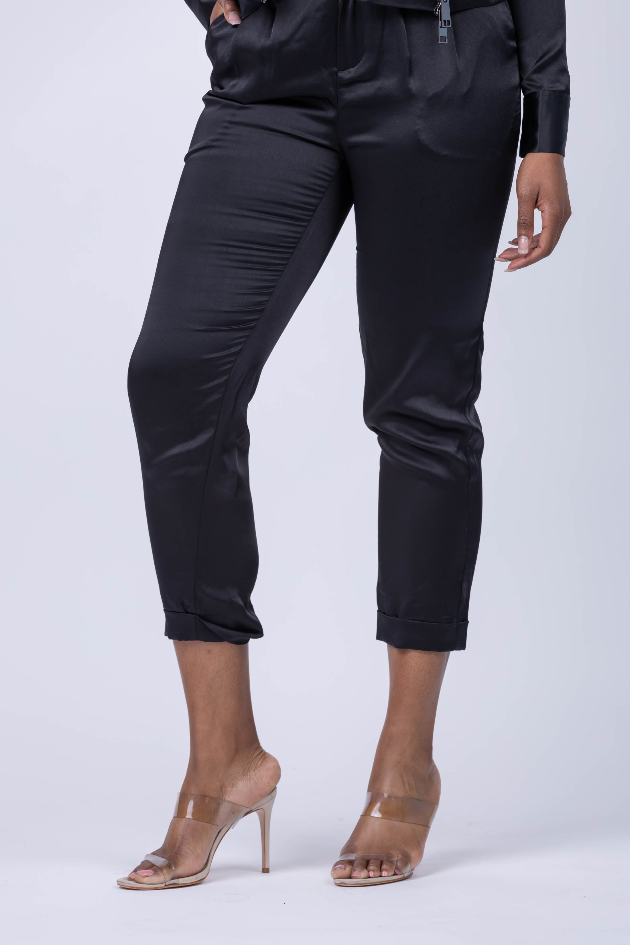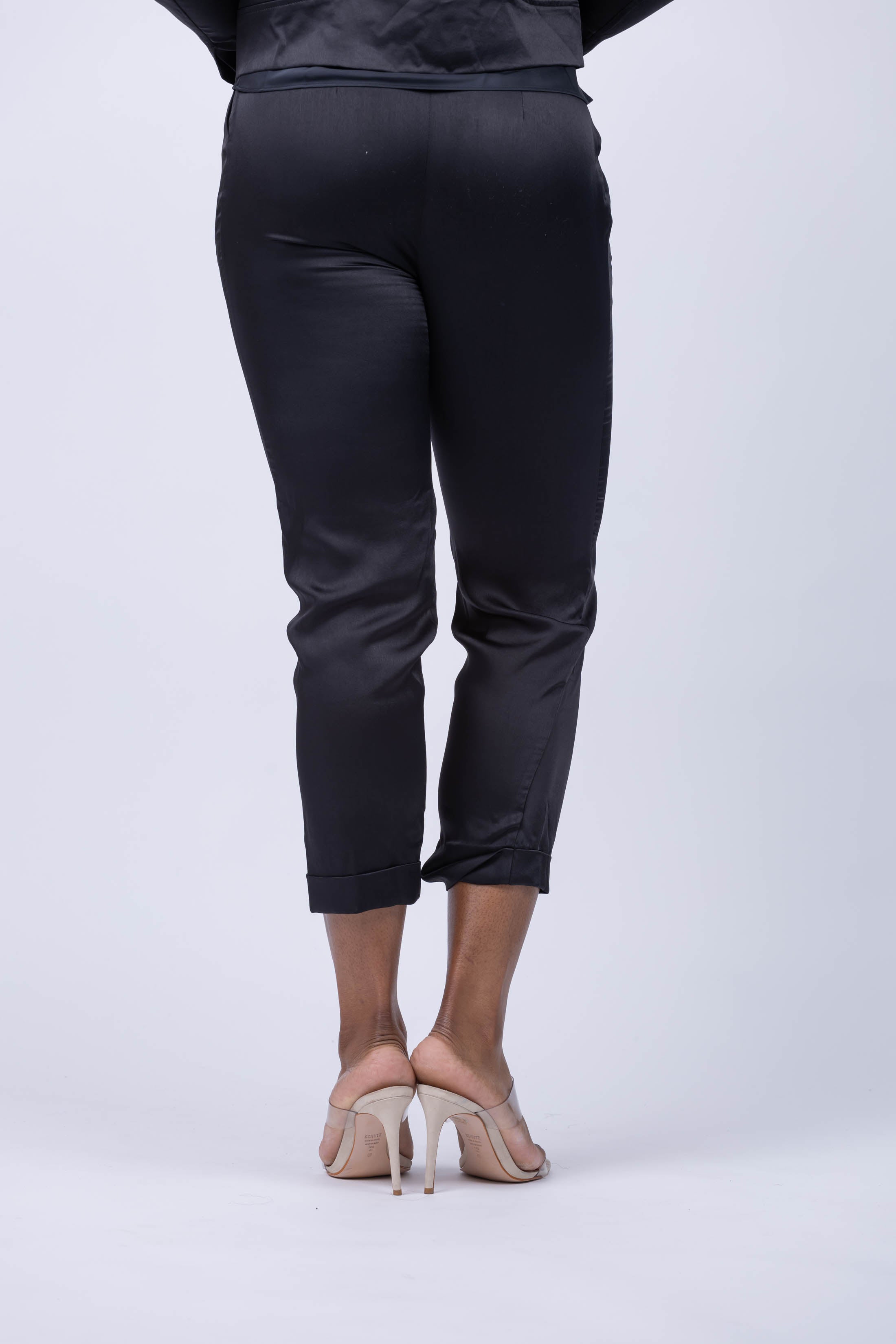 Look your best in these slim-fit, sophisticated Ramy Brook Madelyn pant! Woven from silky satin fabric, these stylish pants feature slanted side pockets, pleating details on the front and cropped legs with rolled cuffs. With a 28" inseam and a midrise fit that sits high on the hip, these stylish trousers are an effortless addition to every wardrobe.