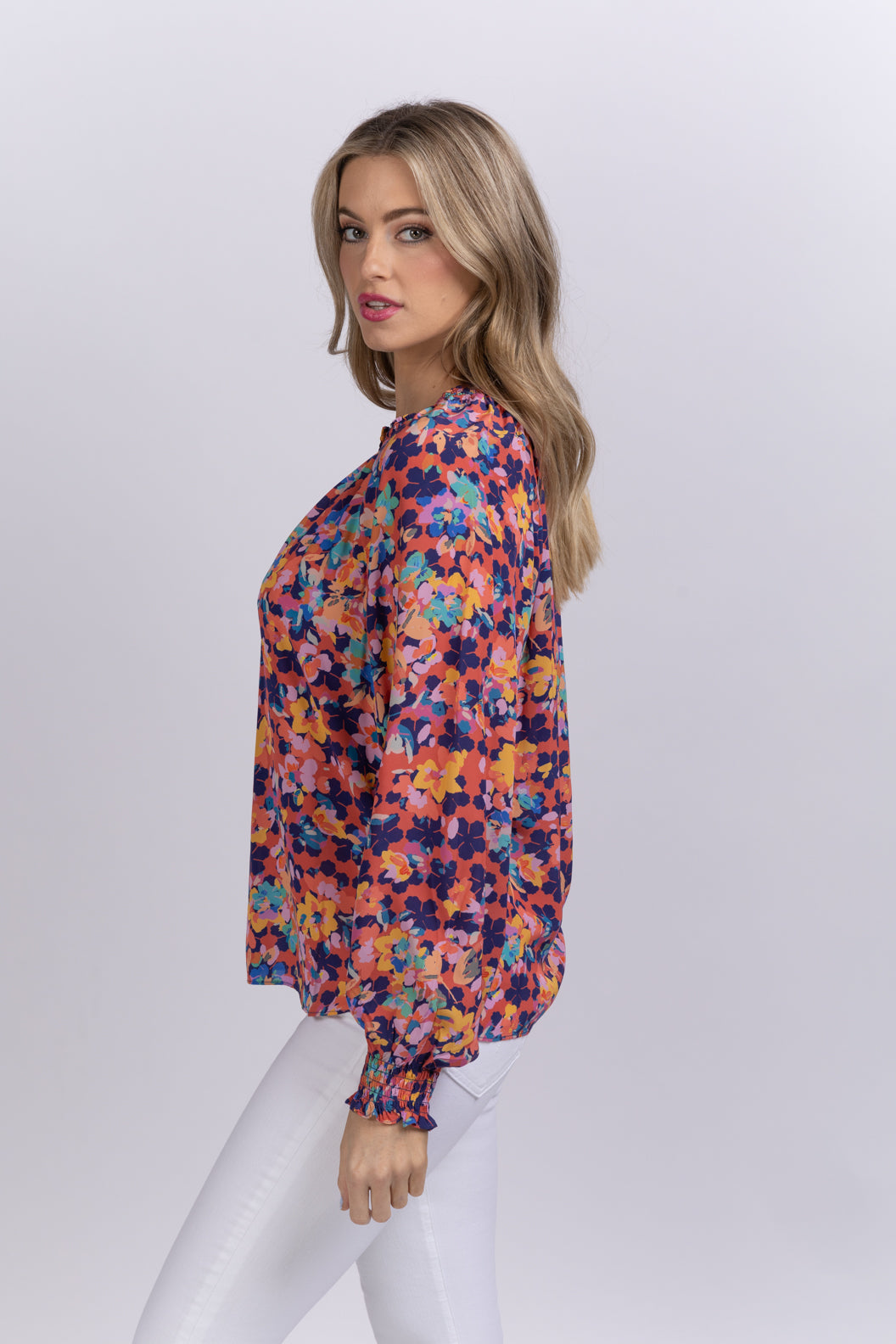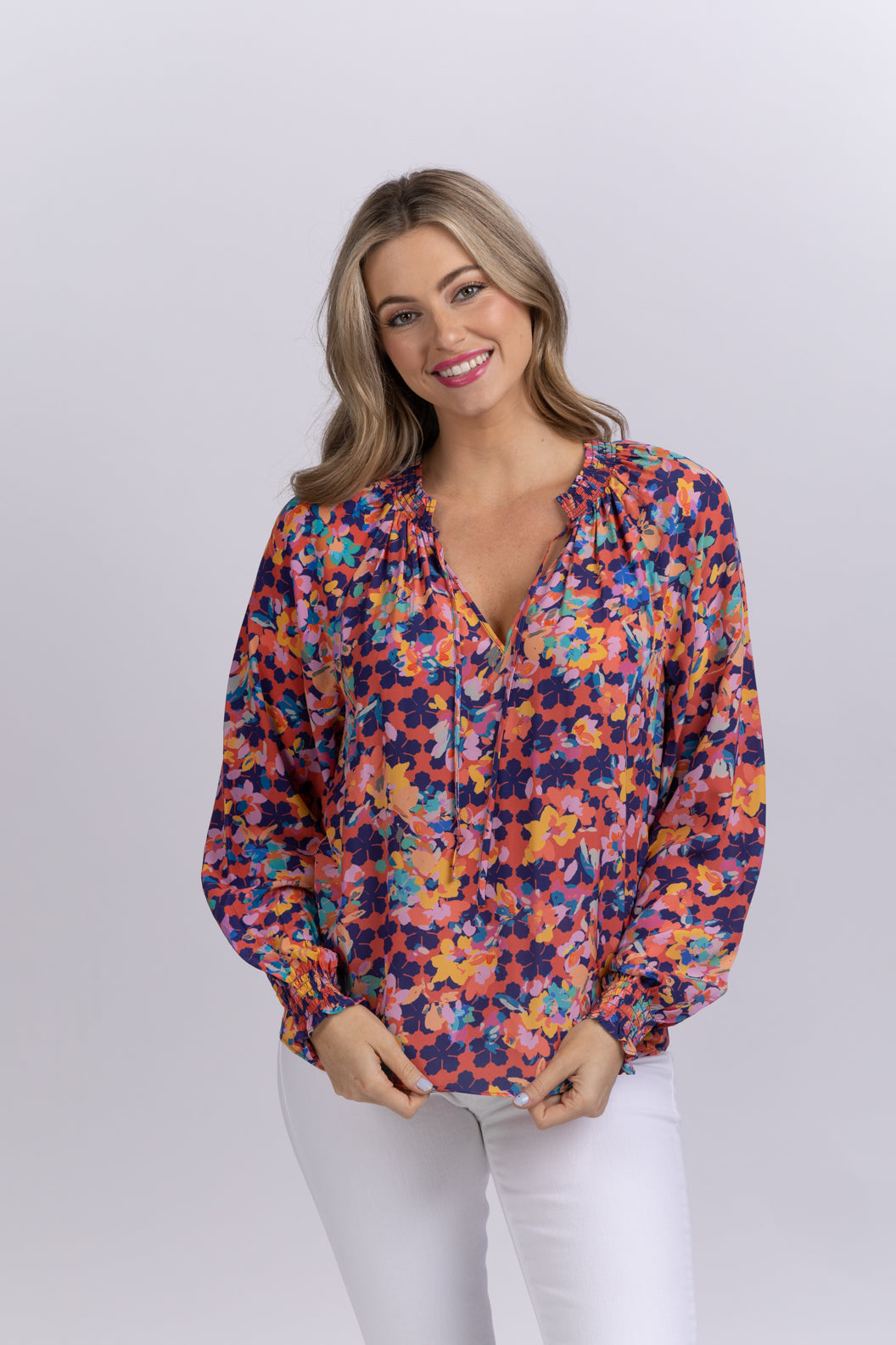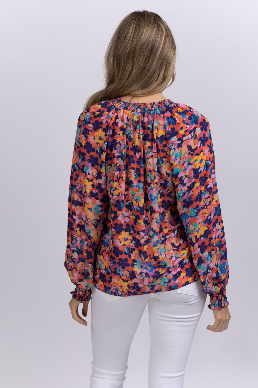 Meet your flowery daydream. Our Crystal top based off of our best-selling Miki top. With a shirried, standing ruffle neckline, blush elastic sleeves, and self ties, this colorful top plays well with other hues, as well as your favorite any-wash jeans. Wear tucked in or grazing your hip.