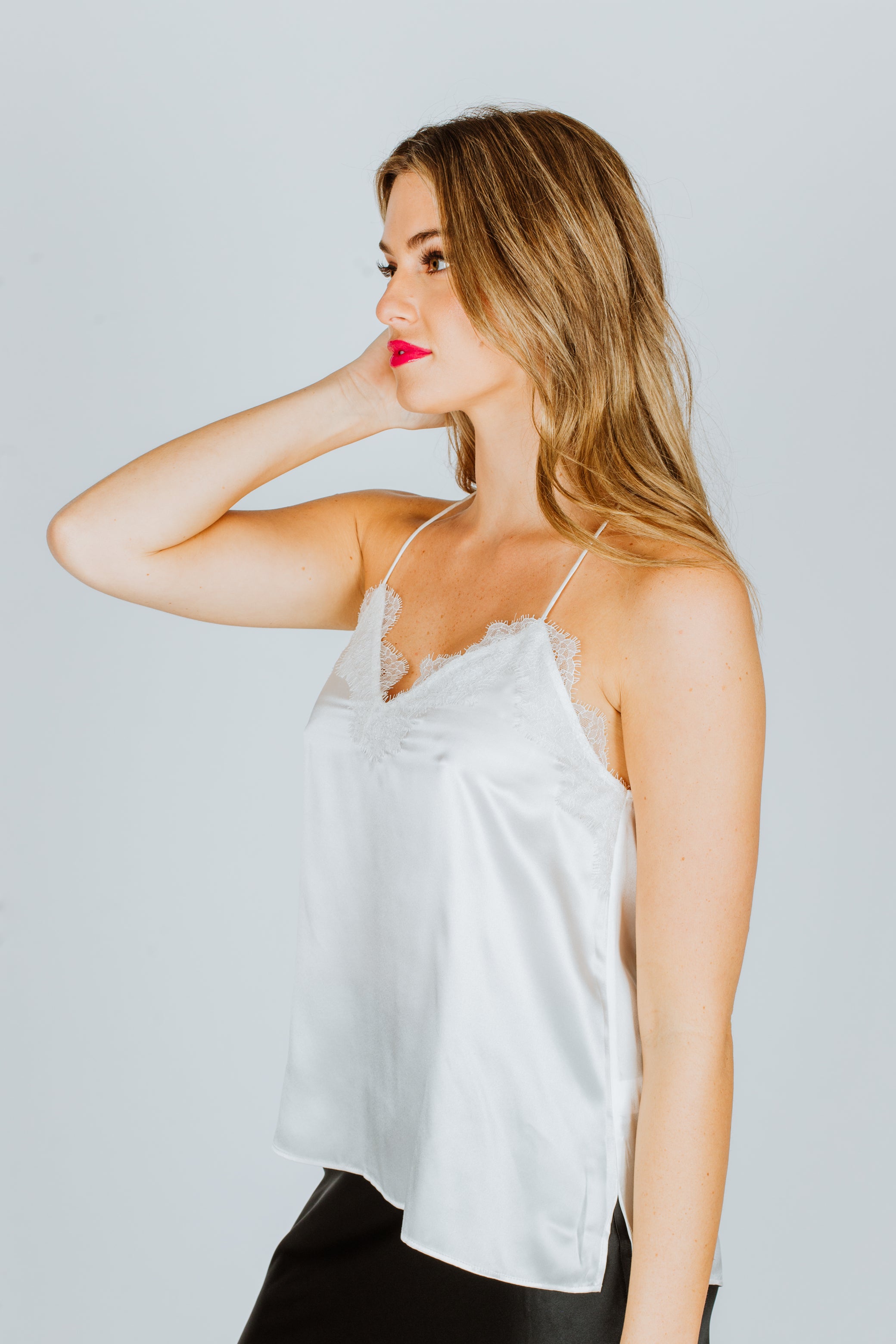 - Slinky silk camisole with scalloped eyelash lace trim
