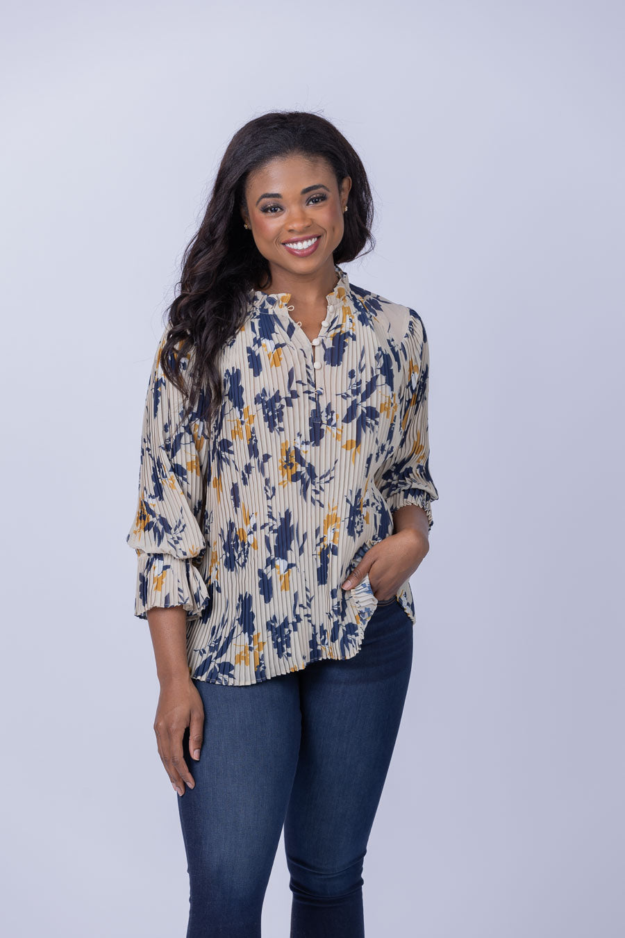 Feel feminine and sophisticated in the Christy Lynn Naomi Blouse. This piece features beautiful pleated poly georgette fabric with unique pleated details. The perfect autumn look for professional workplace settings, this blouse will give you a timeless and classic look that will easily take you from day to night. Create a statement with Inkblot Ivory!