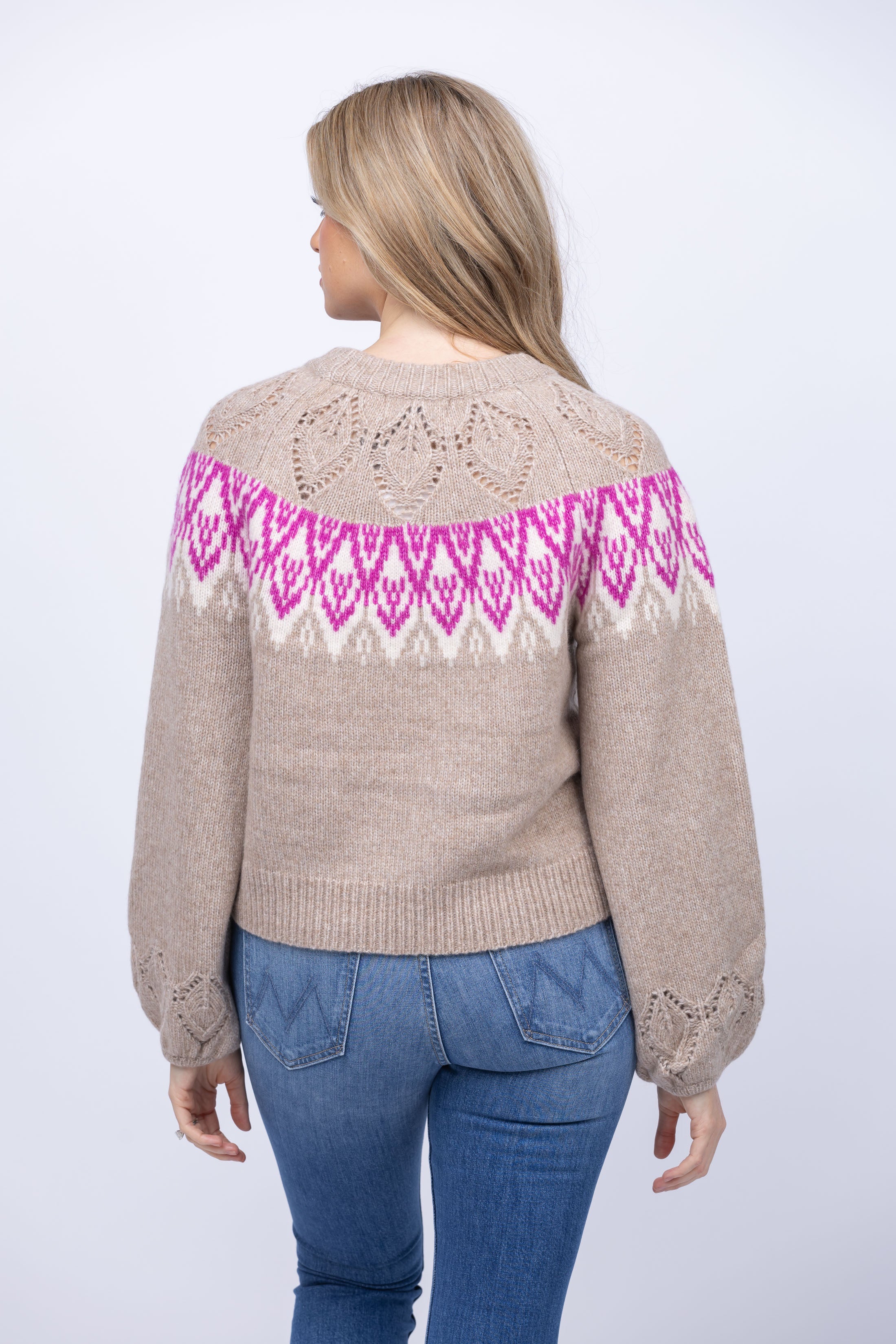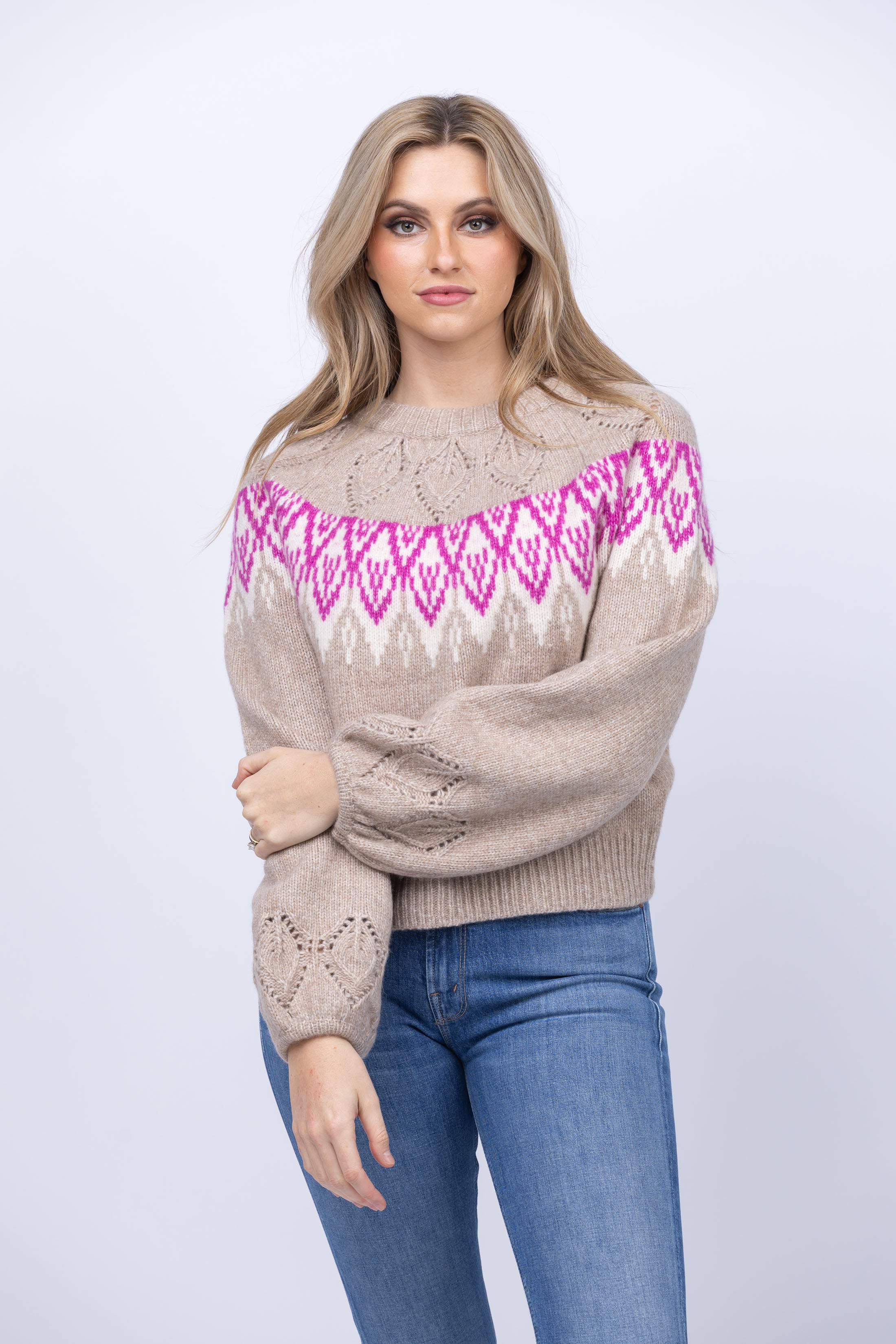 Warm and stylish, the DH New York Hannah Sweater is the perfect way to liven up your winter wardrobe. A neutral sweater with hot pink accents, it lends an elegant feminine touch that you’ll love! From holiday parties to ski trips, this beautiful piece will be the perfect addition to any outfit.