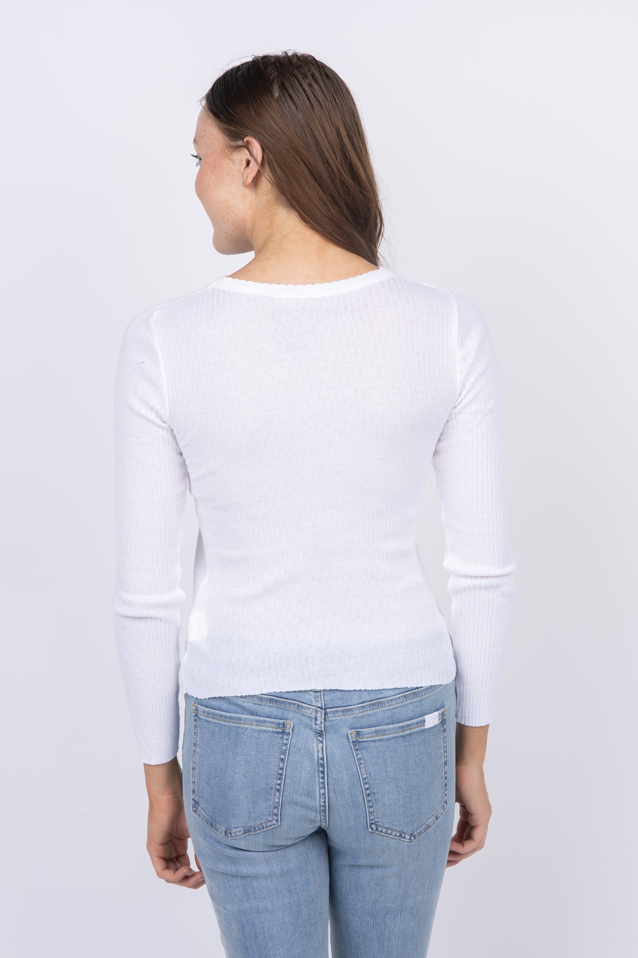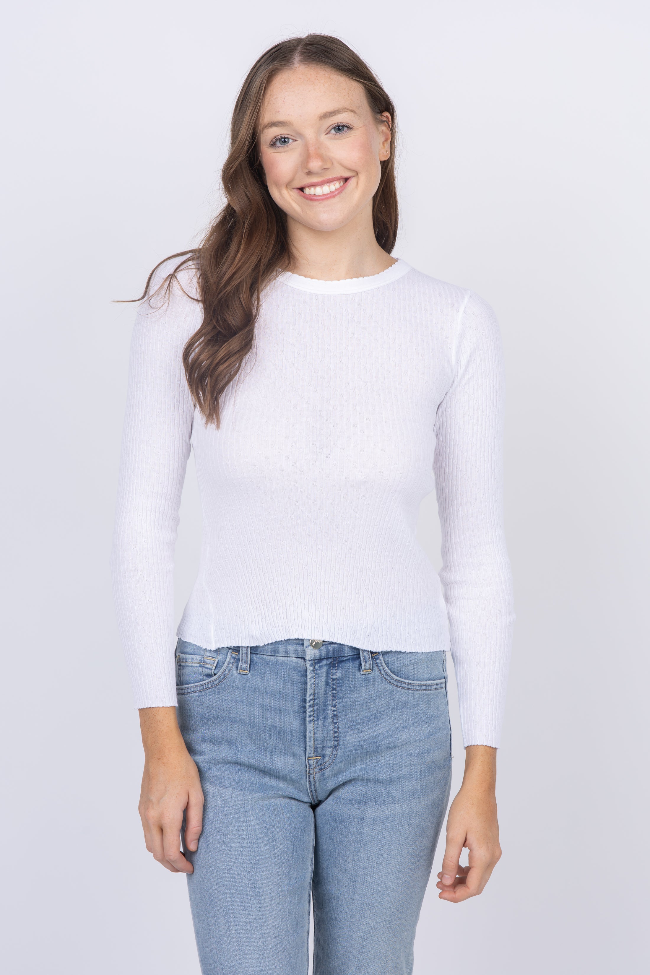 Make a statement in Enza Costa's Scalloped Long Sleeve Crew! Crafted from lightweight jersey fabric and 100% cotton, you'll feel comfortable yet stylish all day long. Made in the USA and machine washable, this timeless piece is perfect for any occasion. Get ready to turn heads with this modern classic!