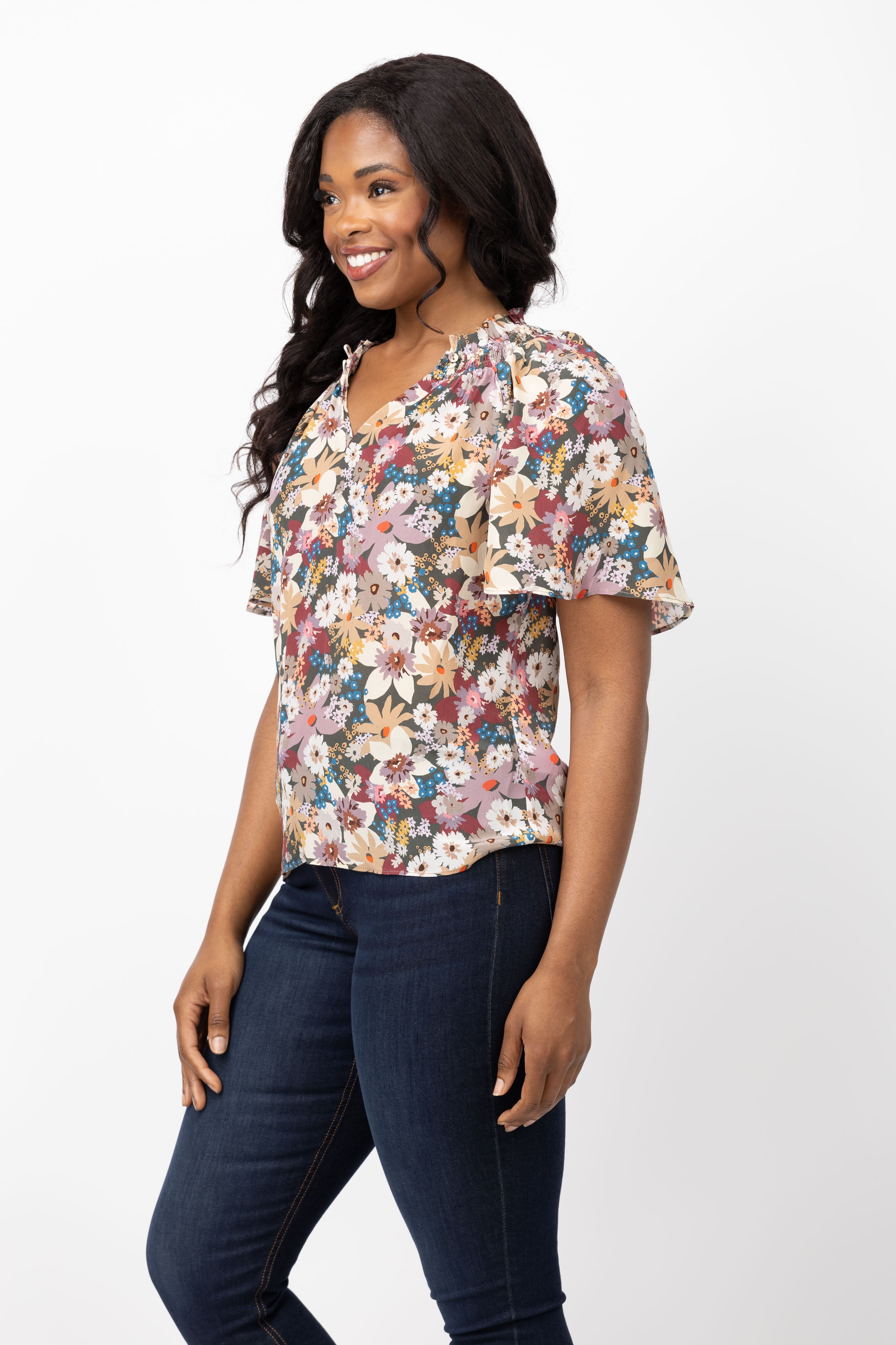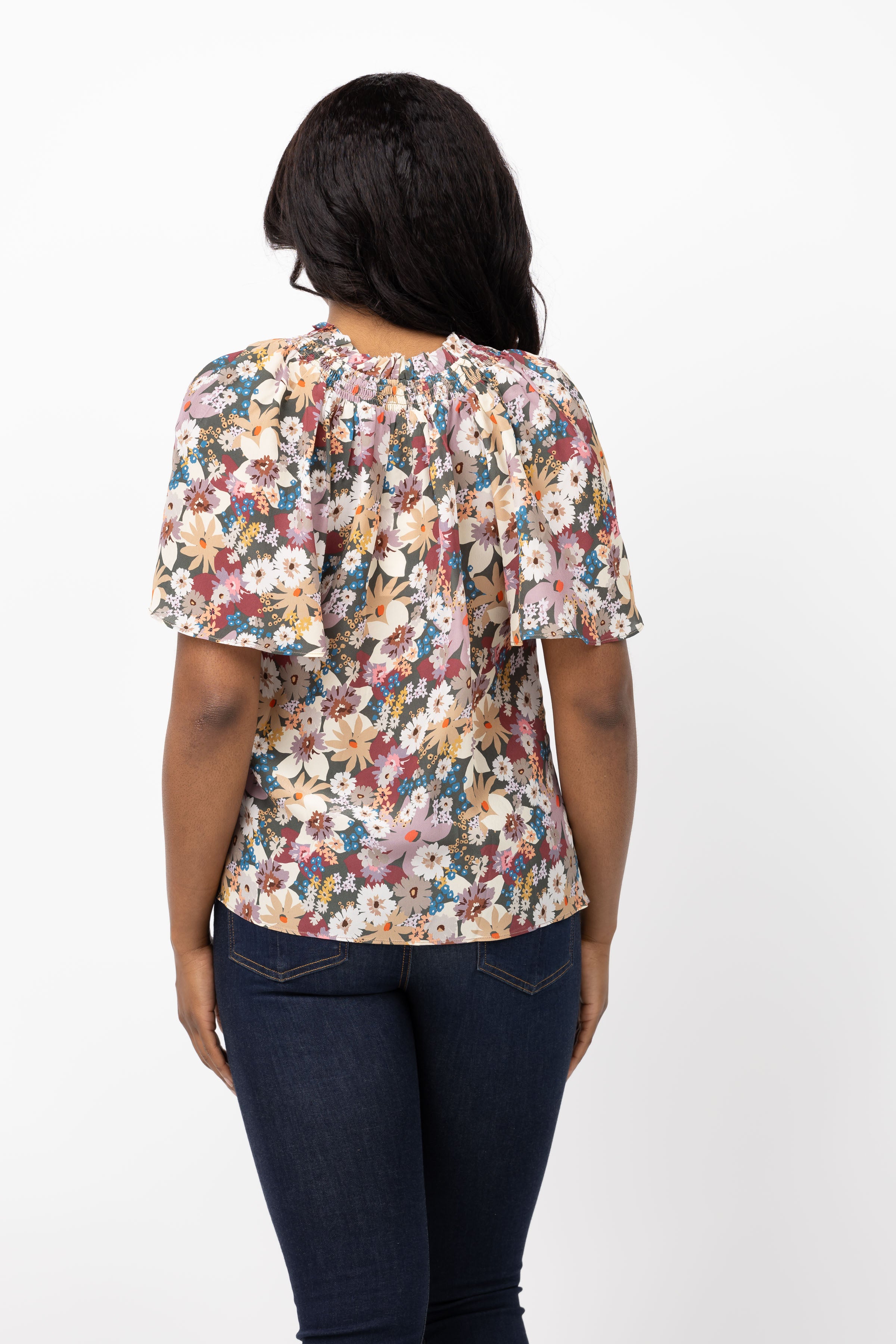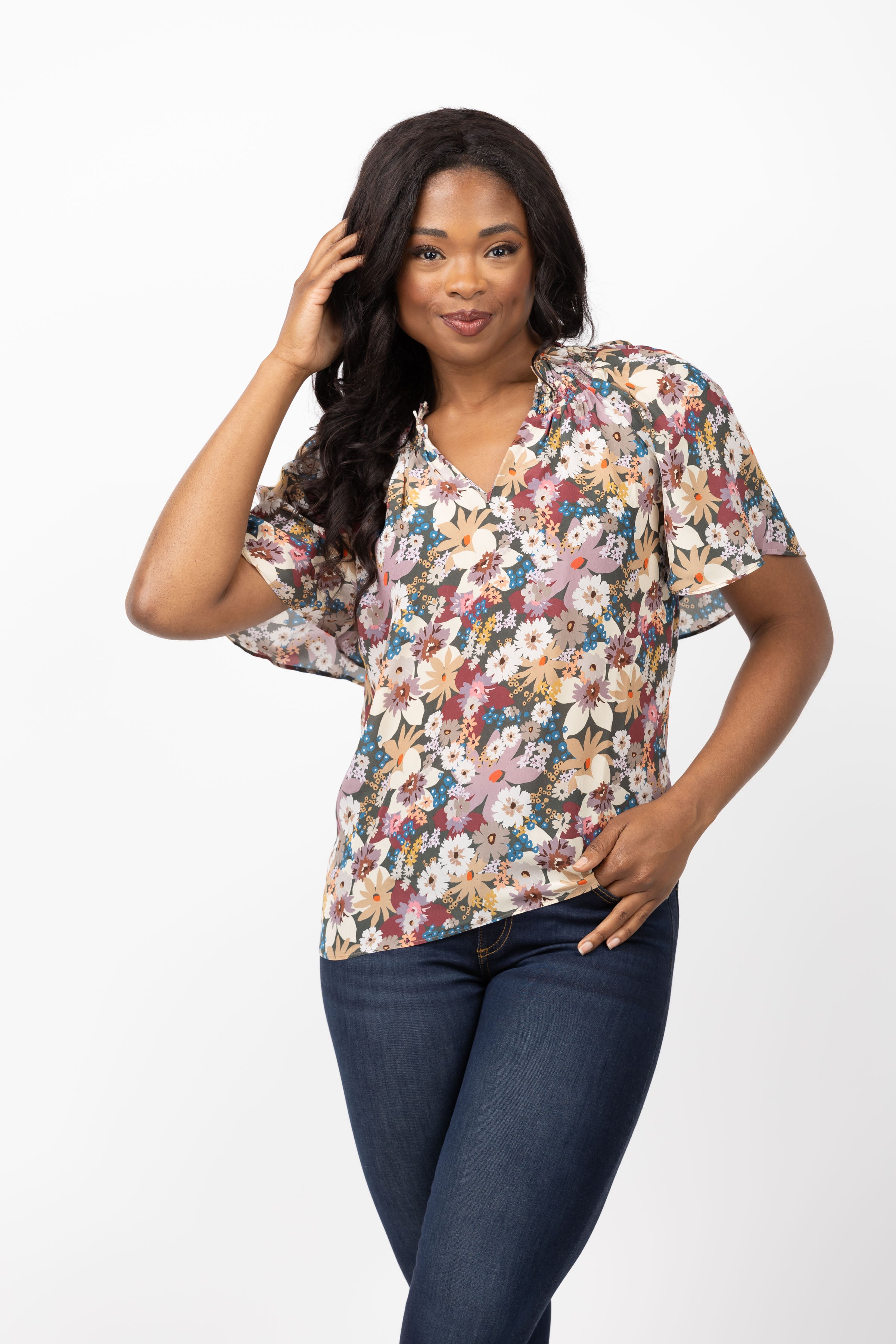 Introducing the Gilner Farrar Arabella Blouse in Flower Power, the perfect blend of style and comfort. This short sleeve blouse features smocking detail and a button front closure. With its vibrant fall hues, it pairs perfectly with leather pants or denim, making it a must-have for any fashion-forward wardrobe!