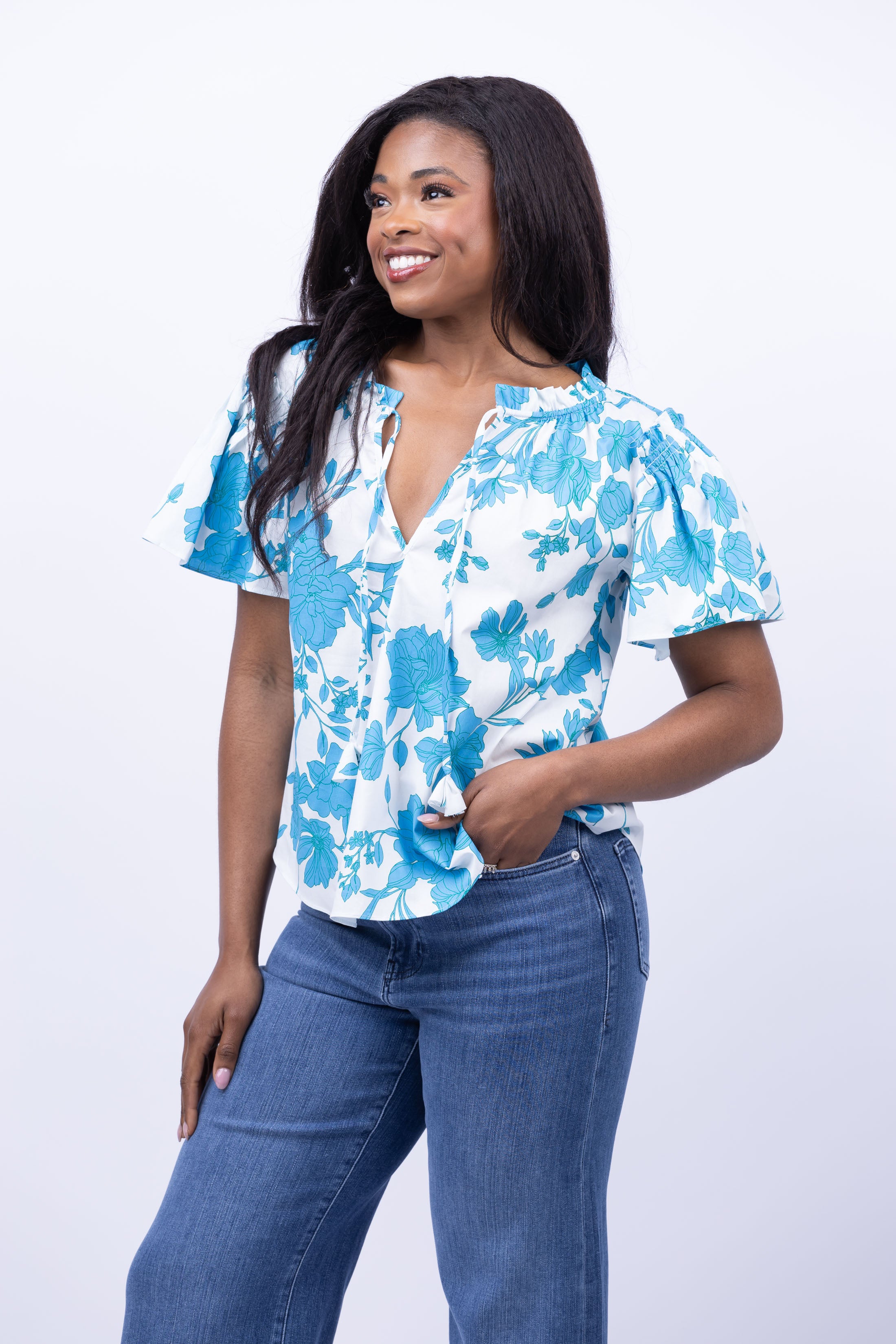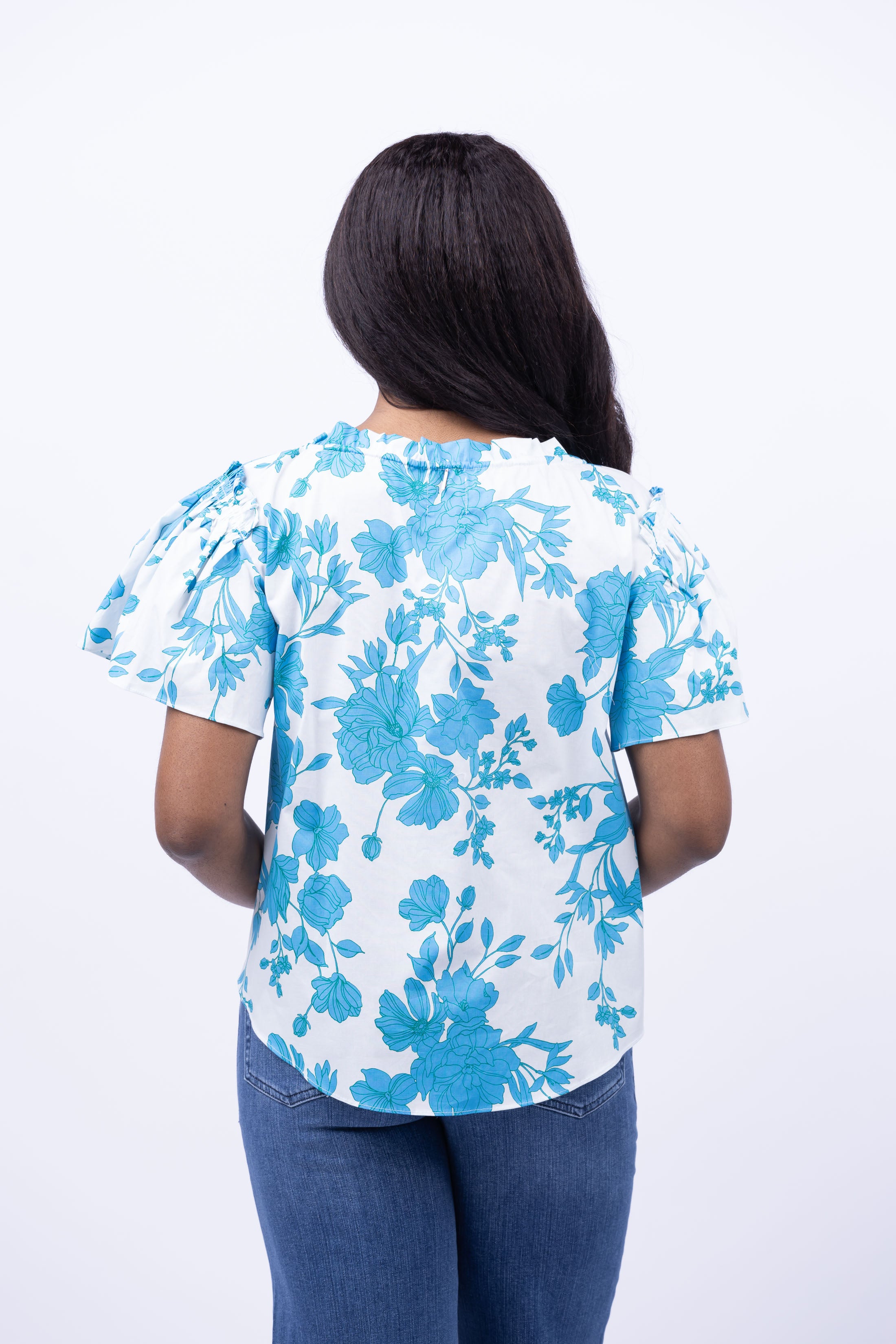 The Misa Los Angeles Suparna Top in Turquoise Flora is a stunning blue and white floral top. Its high open pleating frames the v-neckline and can be tied for added detail. The wide ruffle sleeves bring a touch of elegance to this beautiful top. Elevate your wardrobe with this must-have piece!