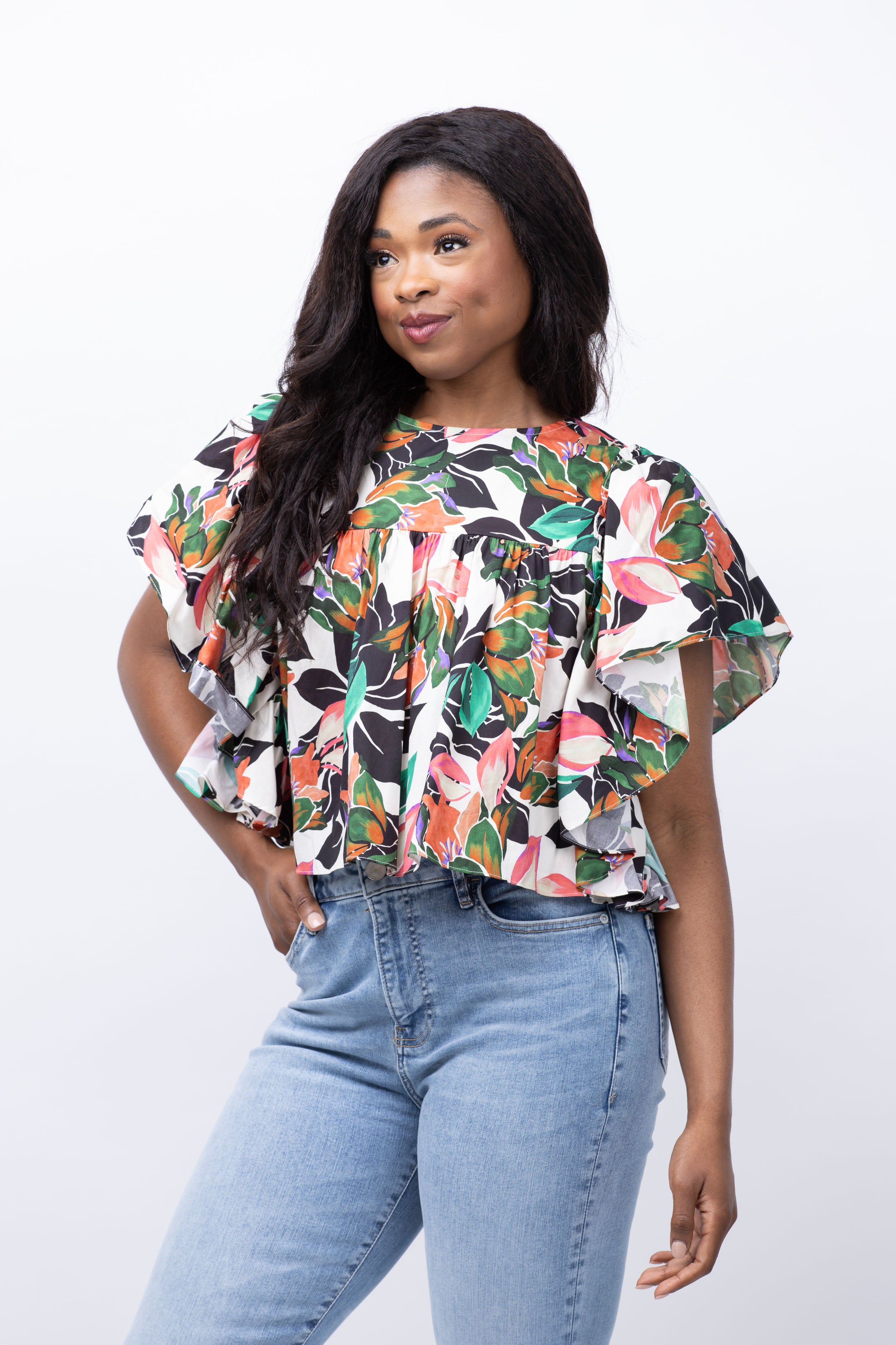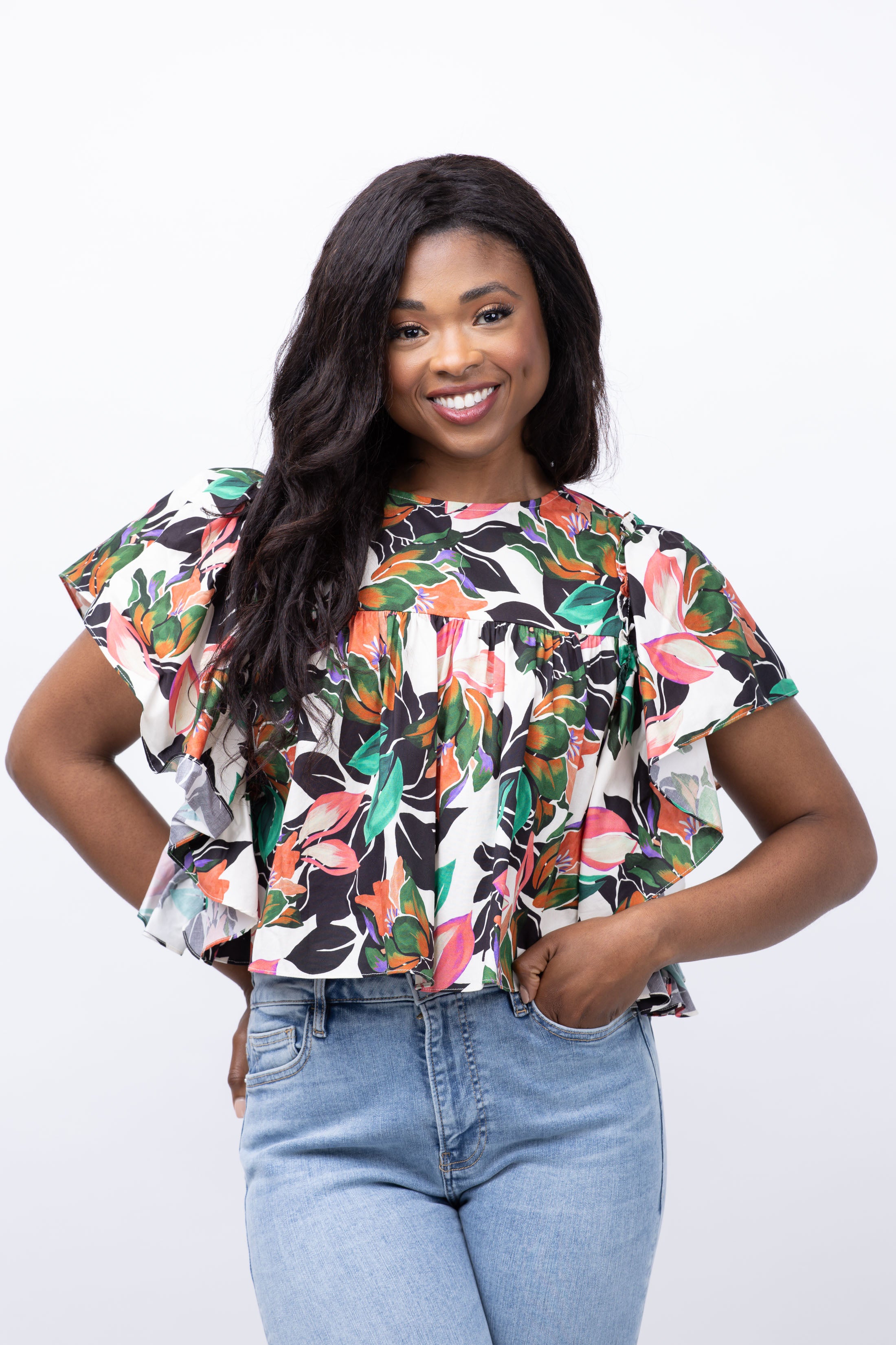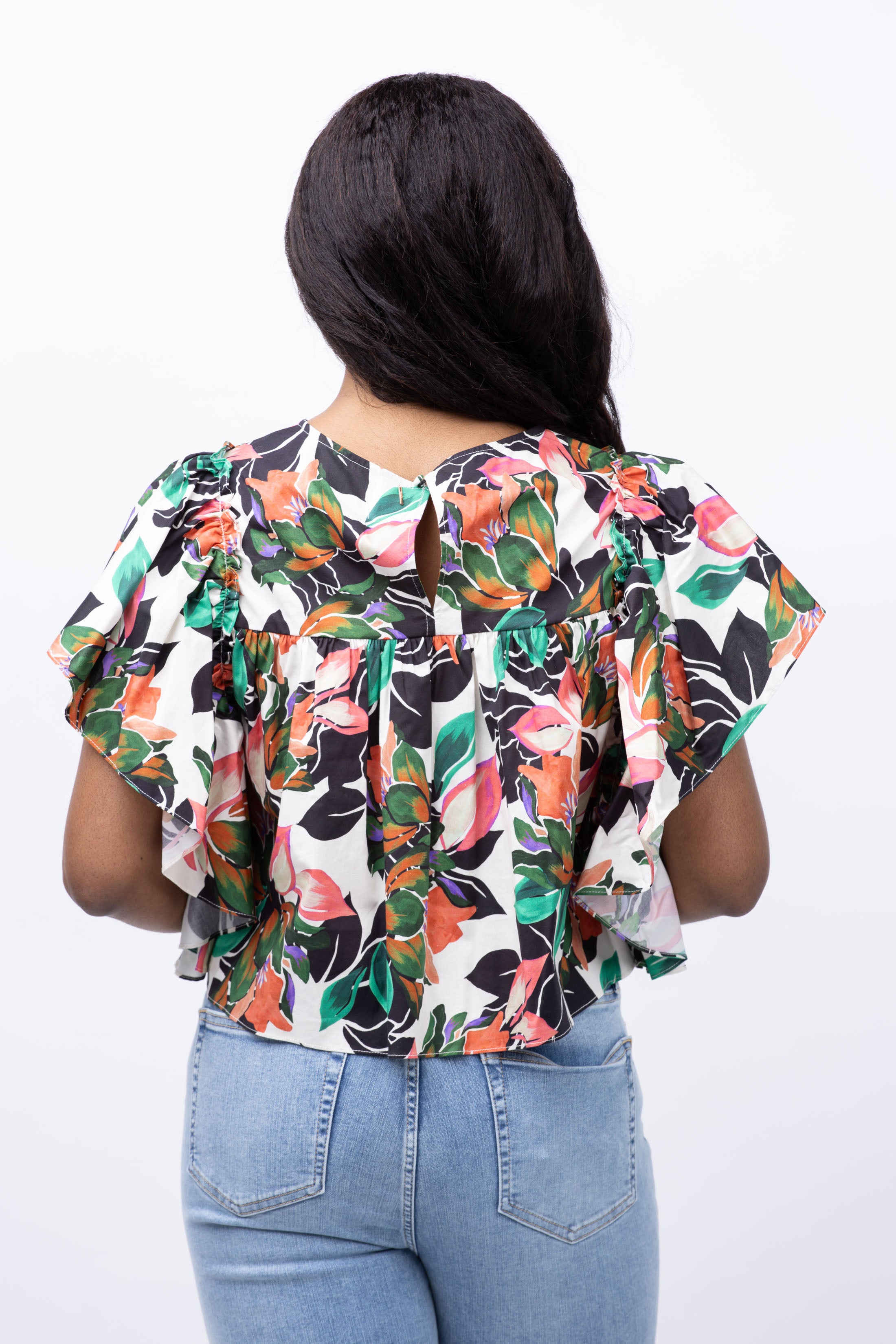Penelope is an easy cropped blouse cut from a Las Palmas tropical printed cotton poplin. Featuring a high neckline and pleated above the bust. Short wide ruffle sleeves and a back hook closure finish off this easy style that will carry you through this season into the next.