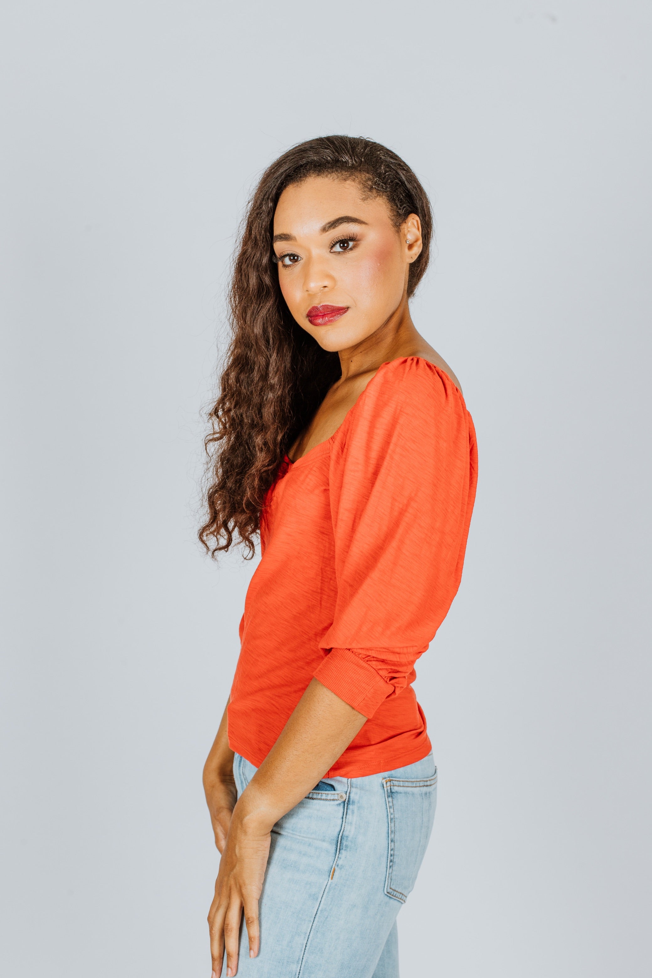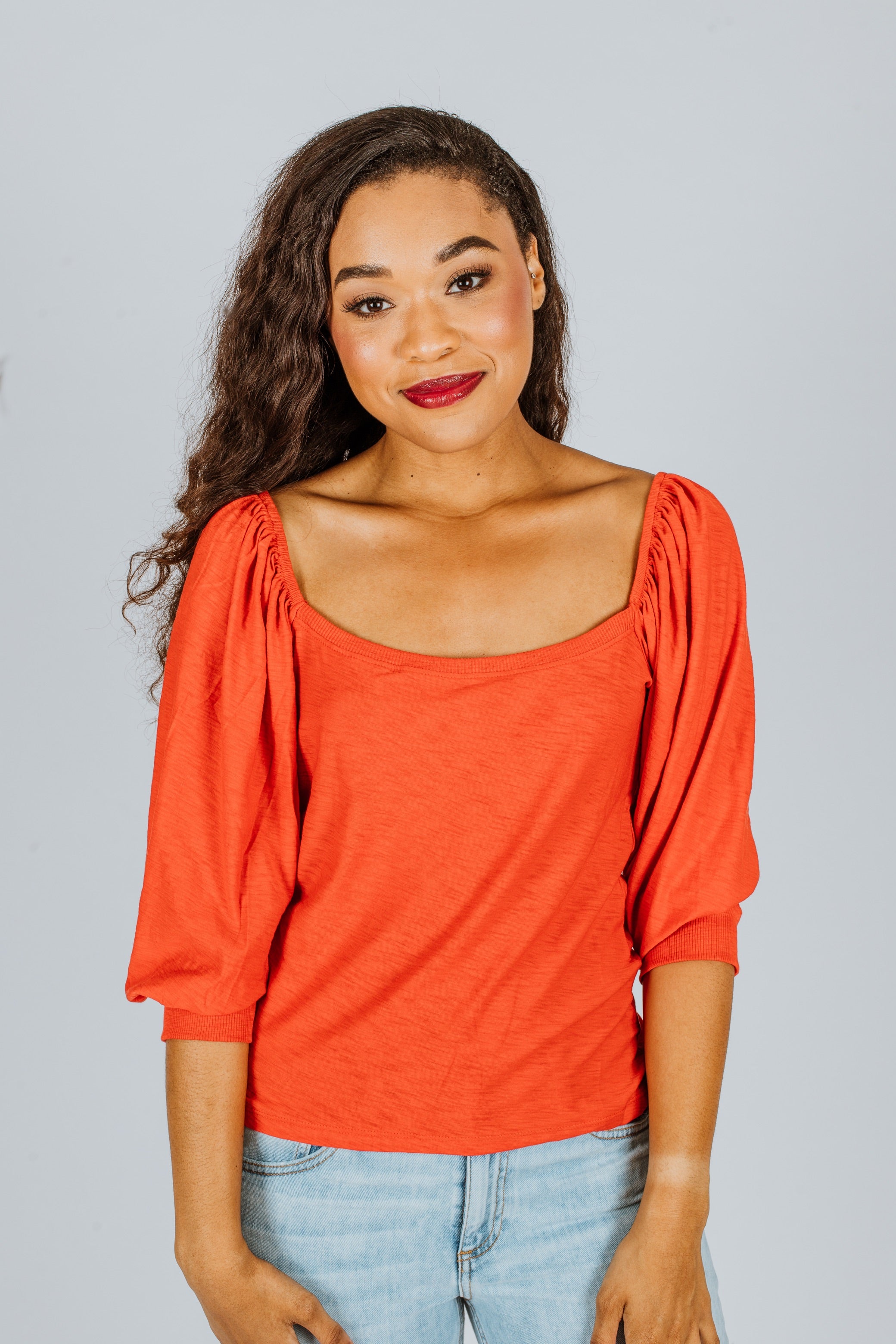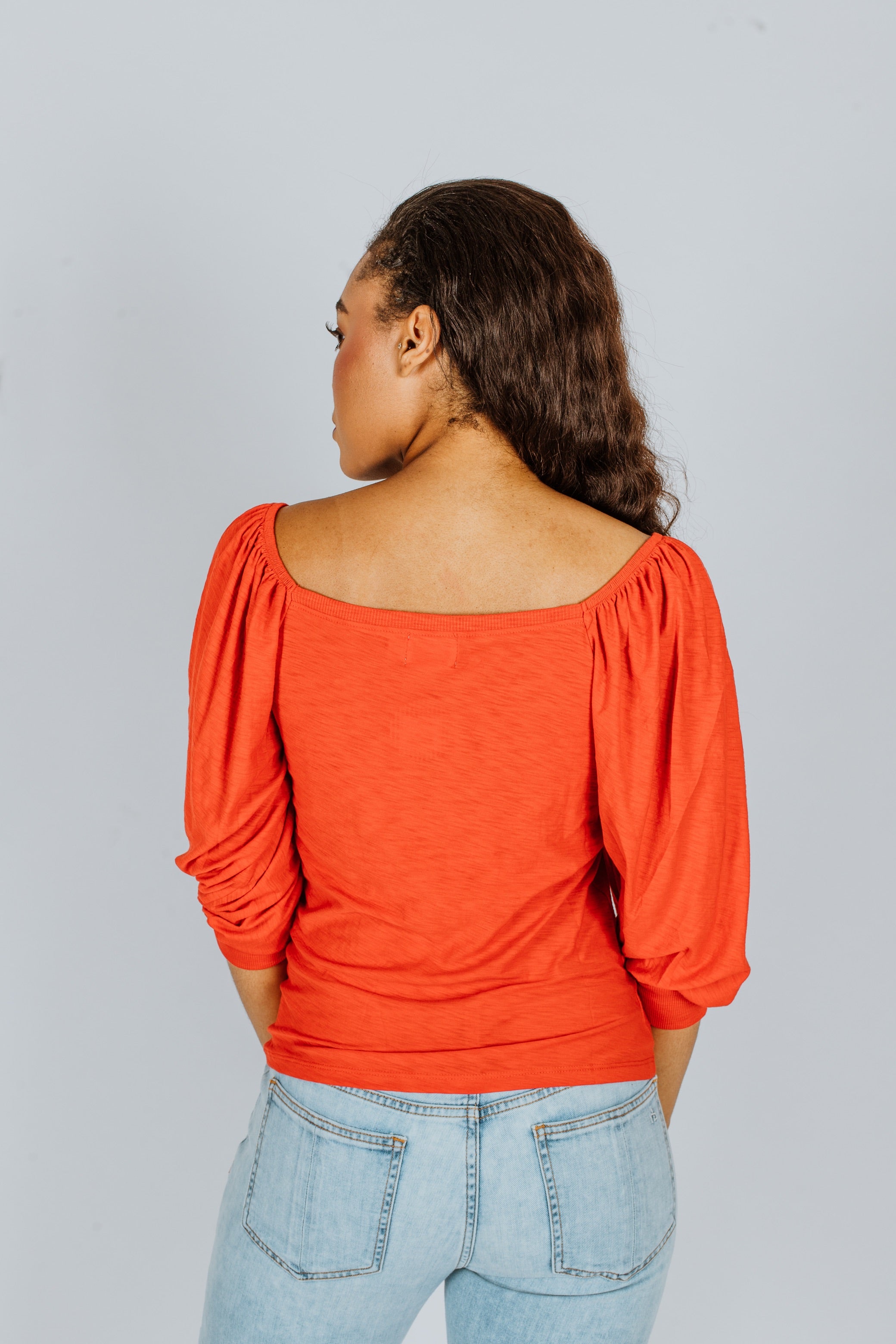 A flattering open neckline and the perfectly puffed balloon sleeves add a dash of romance to your new favorite, jet black tee.