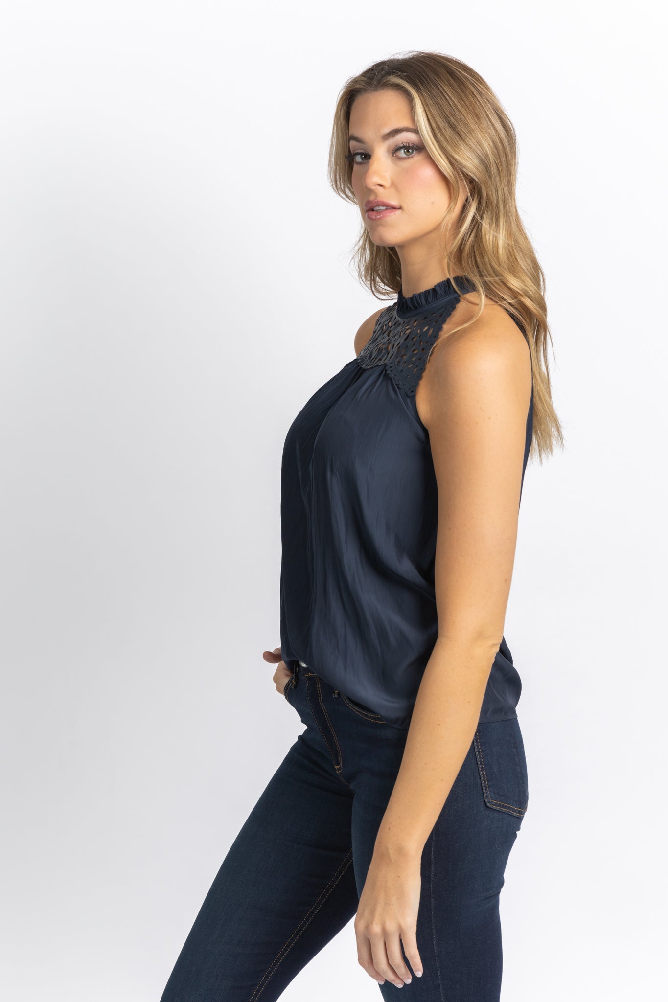 A cut above the rest, look no further than the Caroline High-Neck Tank Top to elevate your blouse collection. The scalloped high neck descends into a contrasting faux leather panel, fresh with floral laser cuts for a feminine flair. Perfect for tucking thanks to the slim fit design, consider this piece your new wardrobe must have.