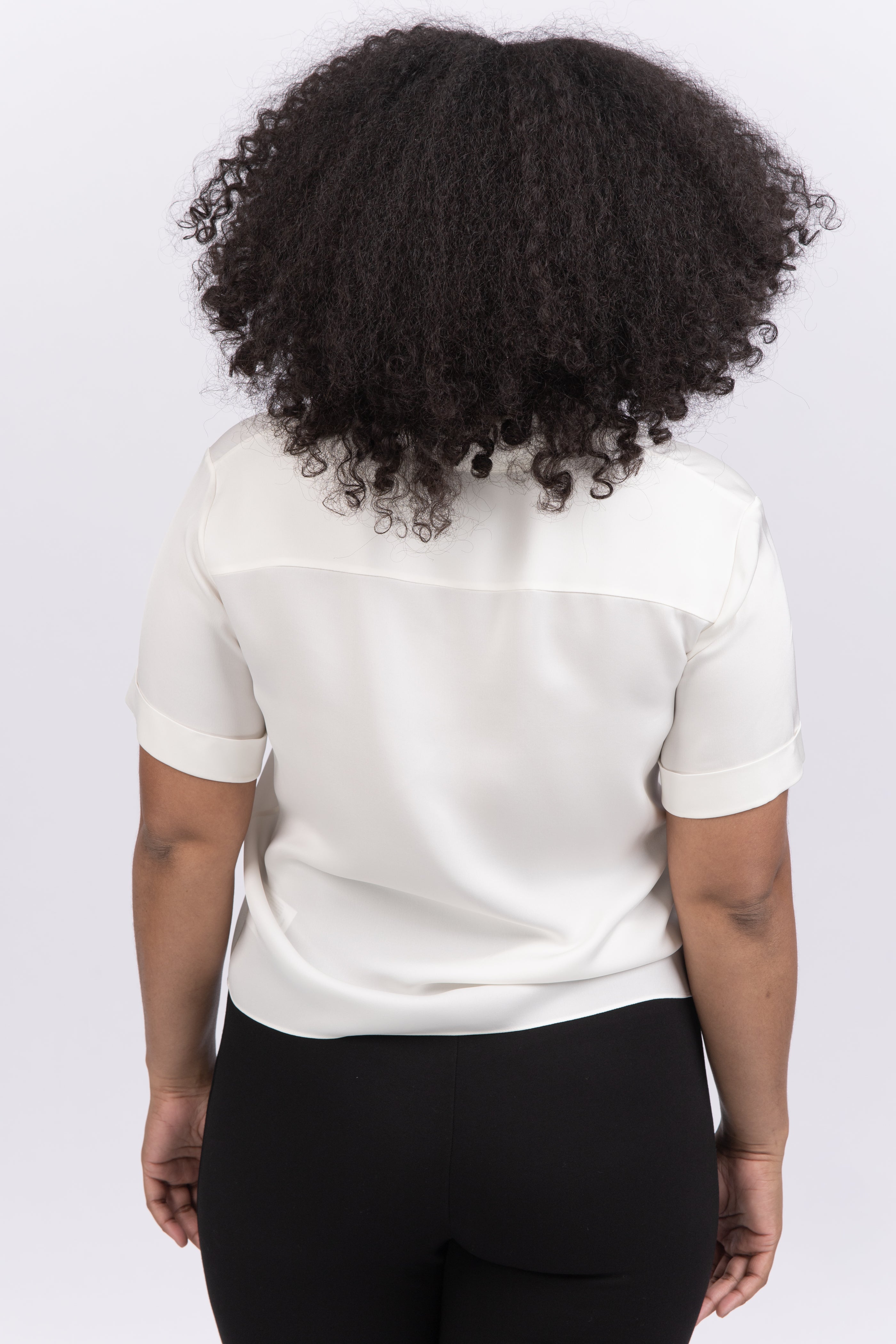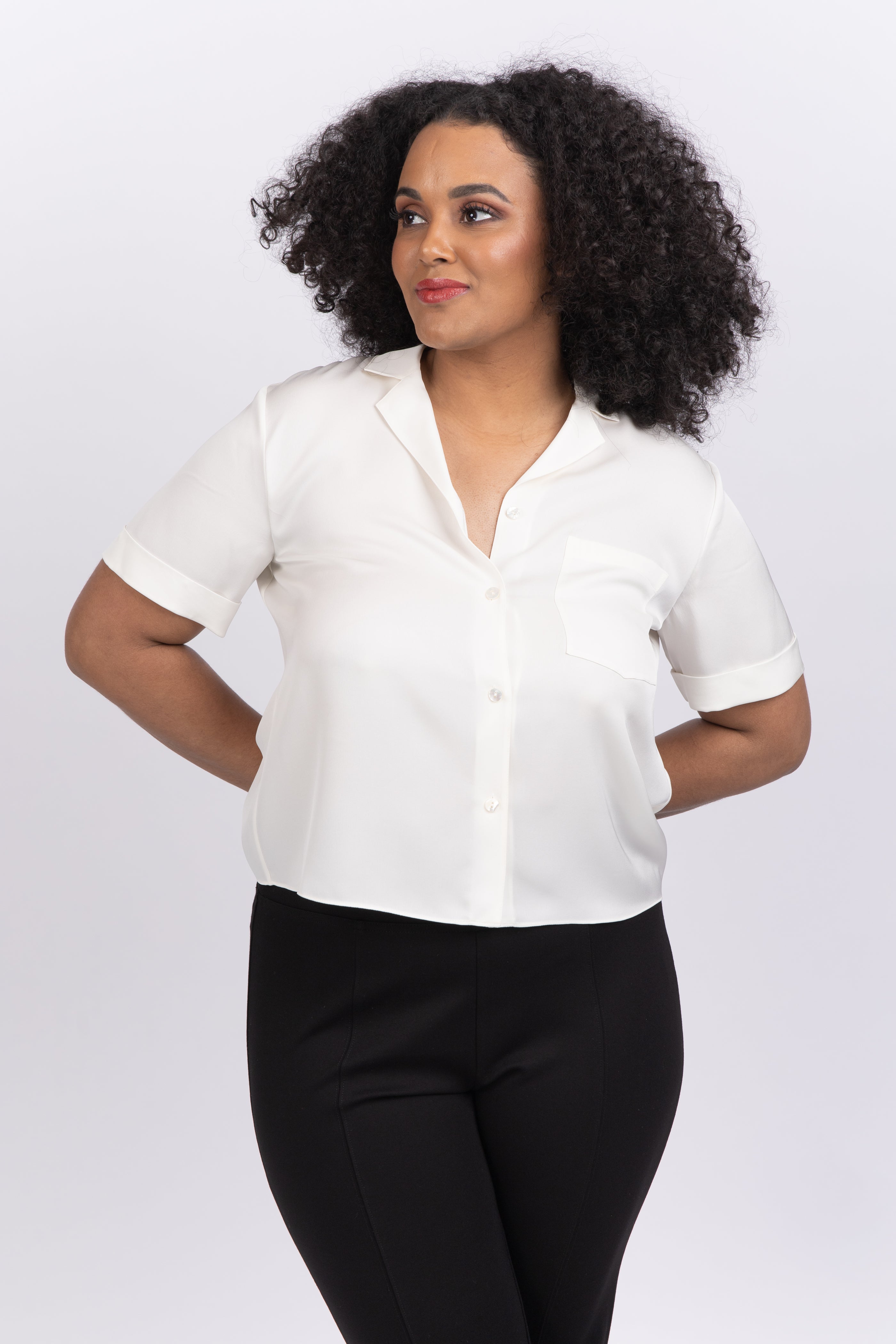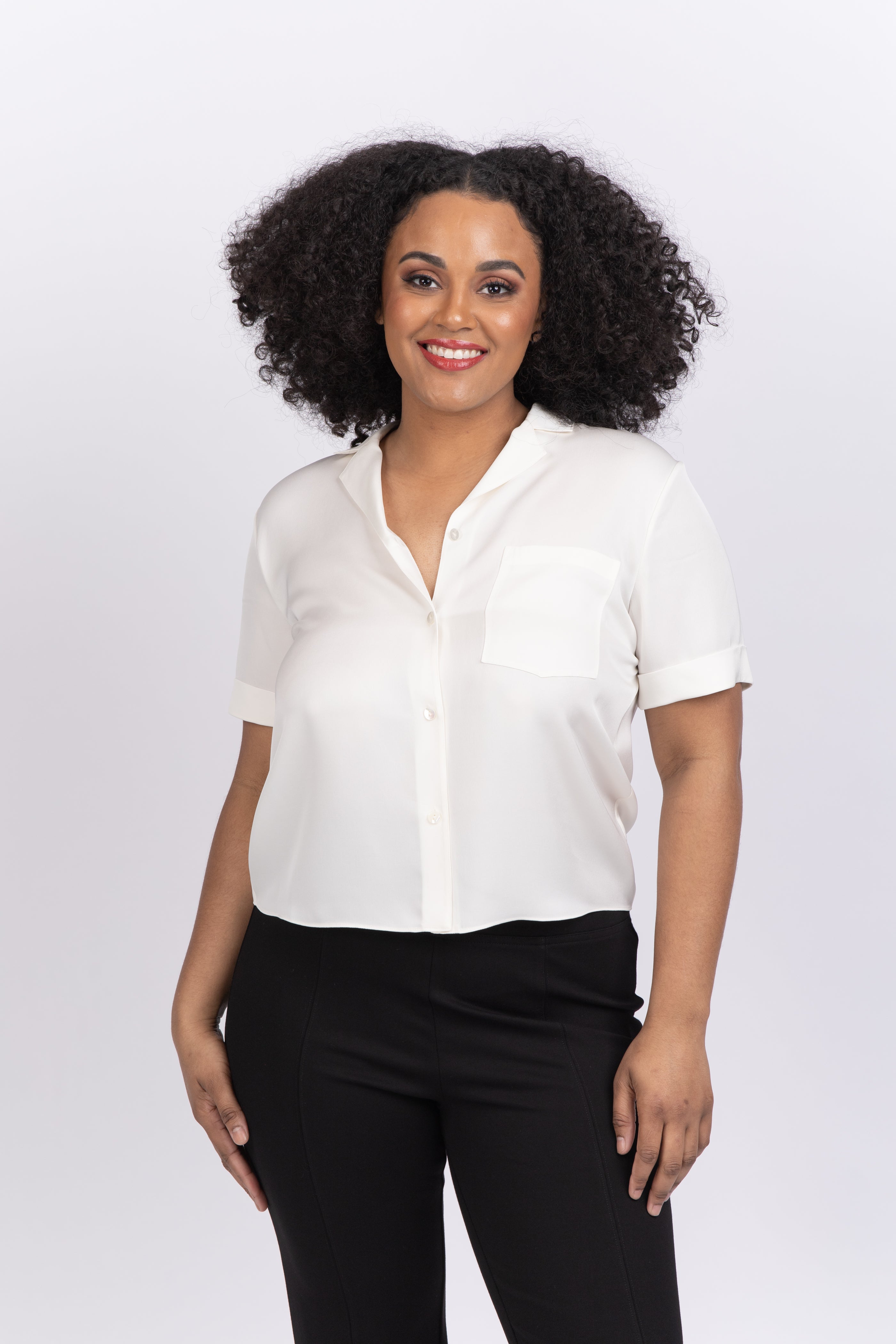 Theory's camp shirt is crafted of luxurious silk and cut in a slightly cropped boxy fit. This top is finished with notch lapels, front buttons, and a chest patch pocket.