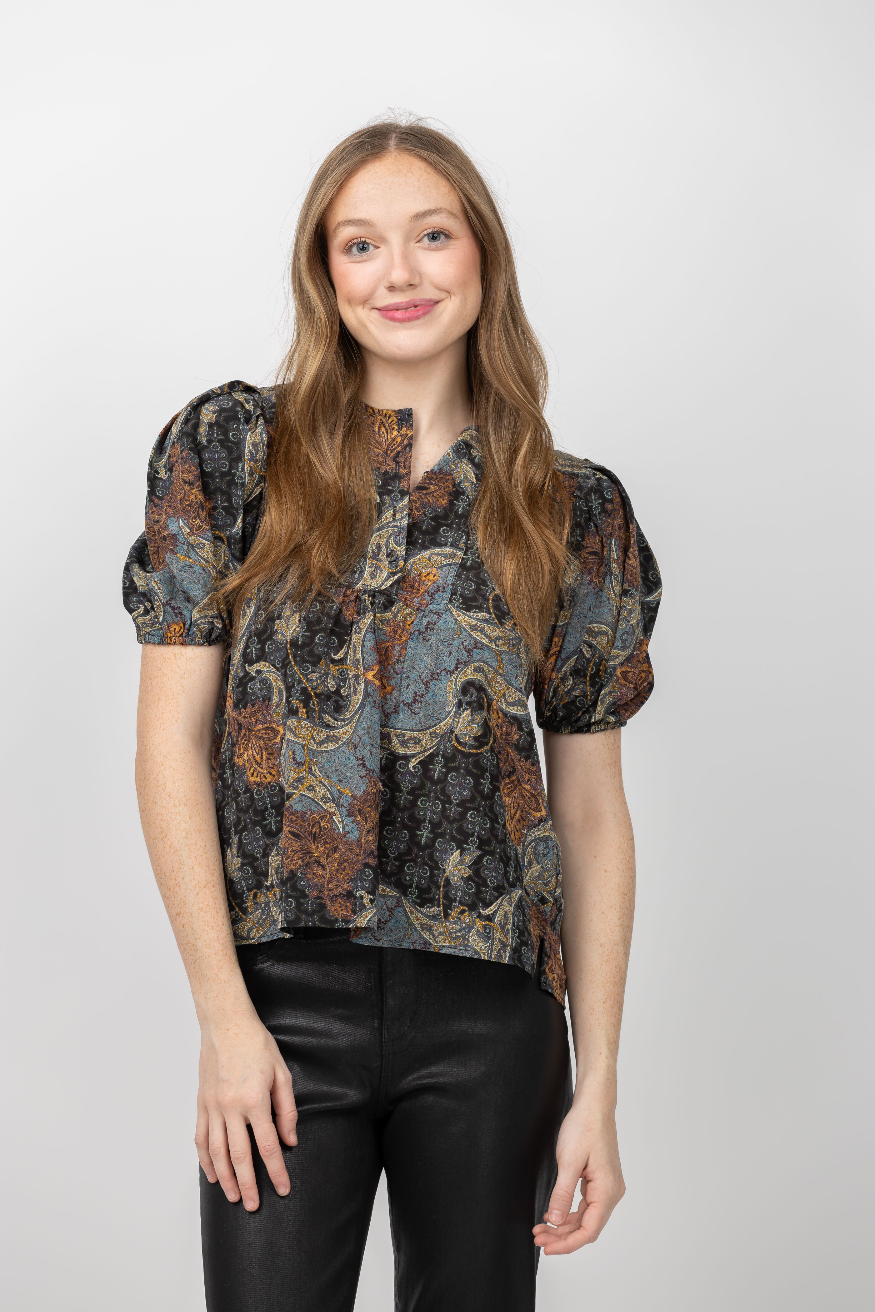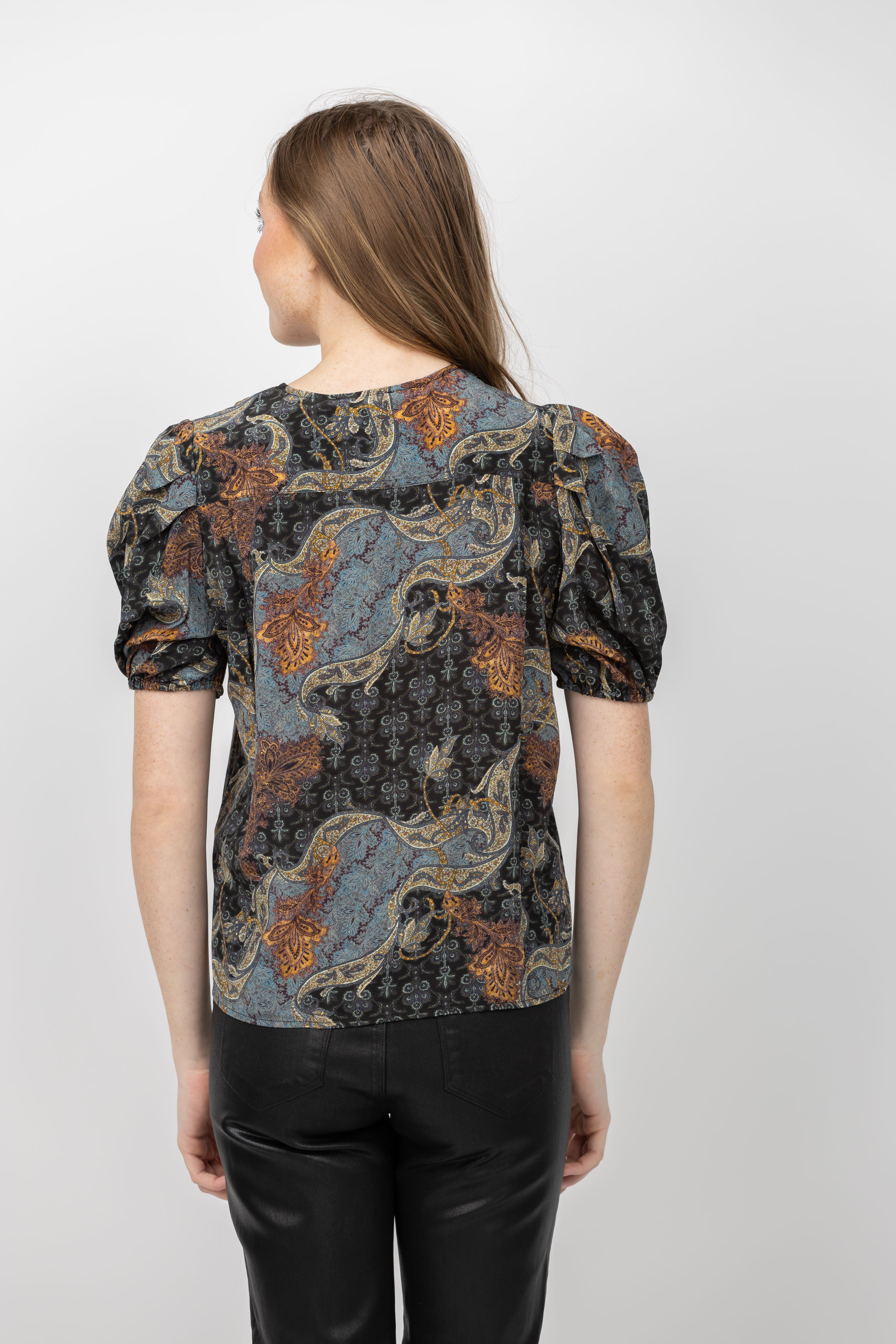 Indulge in luxurious style with the Ulla Johnson Lila Top in Azure. Cut from silk crepe de chine, this top boasts intricate paisley motifs in vibrant blue, yellow, and gold. Elevate any outfit with statement puff sleeves and a flowy silhouette, accented by a partial button-front placket. Perfect for pairing with denim or tailored separates for a bold and stylish look.