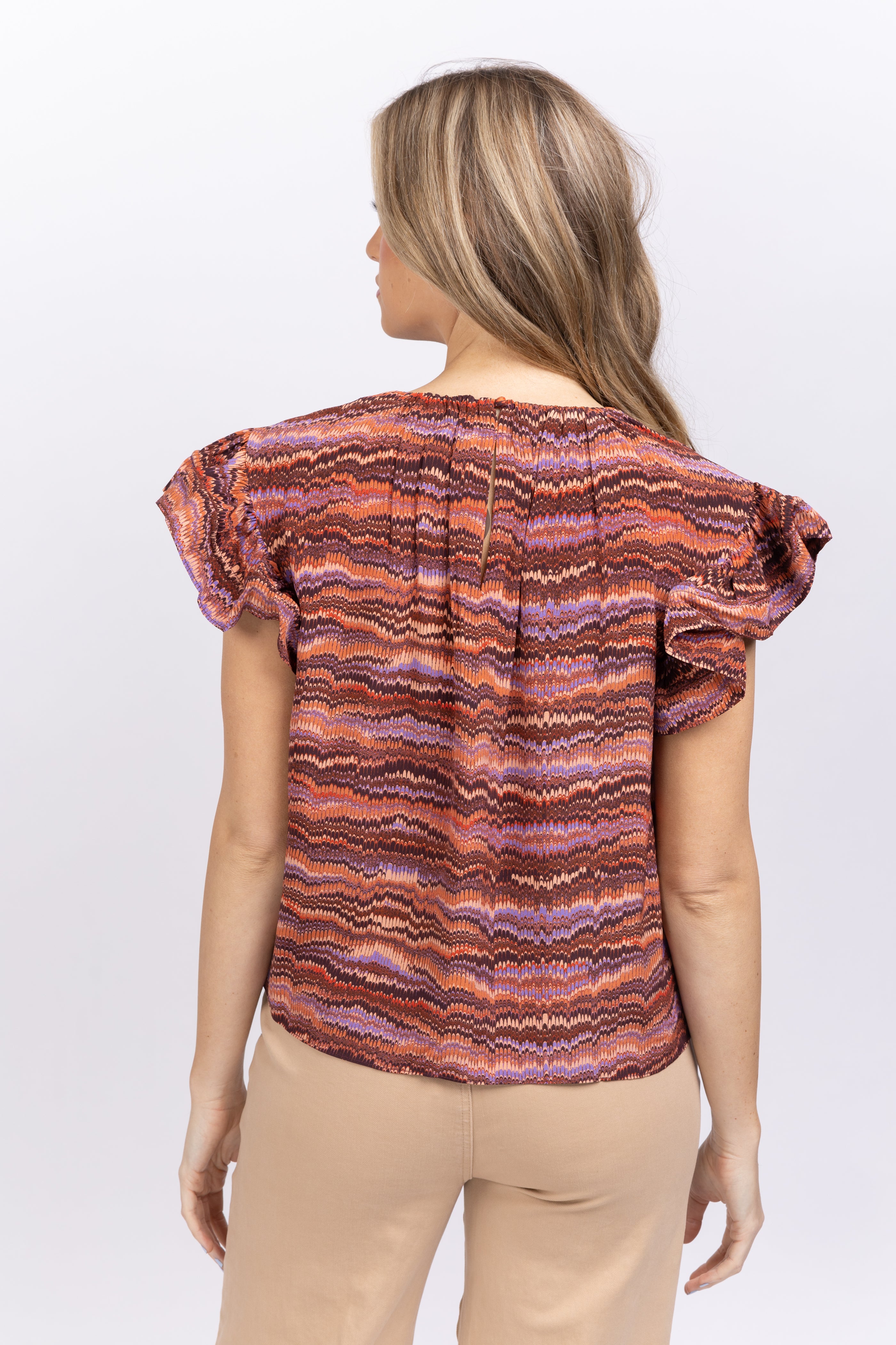 The Marjorie Top is made from 100% silk, printed in a gradient pattern of purple and orangey reds. This top is defined by layered flutter sleeves which emerge beautifully from the airy bodice. It is finished with a high-neckline and single button closure at the center back.
