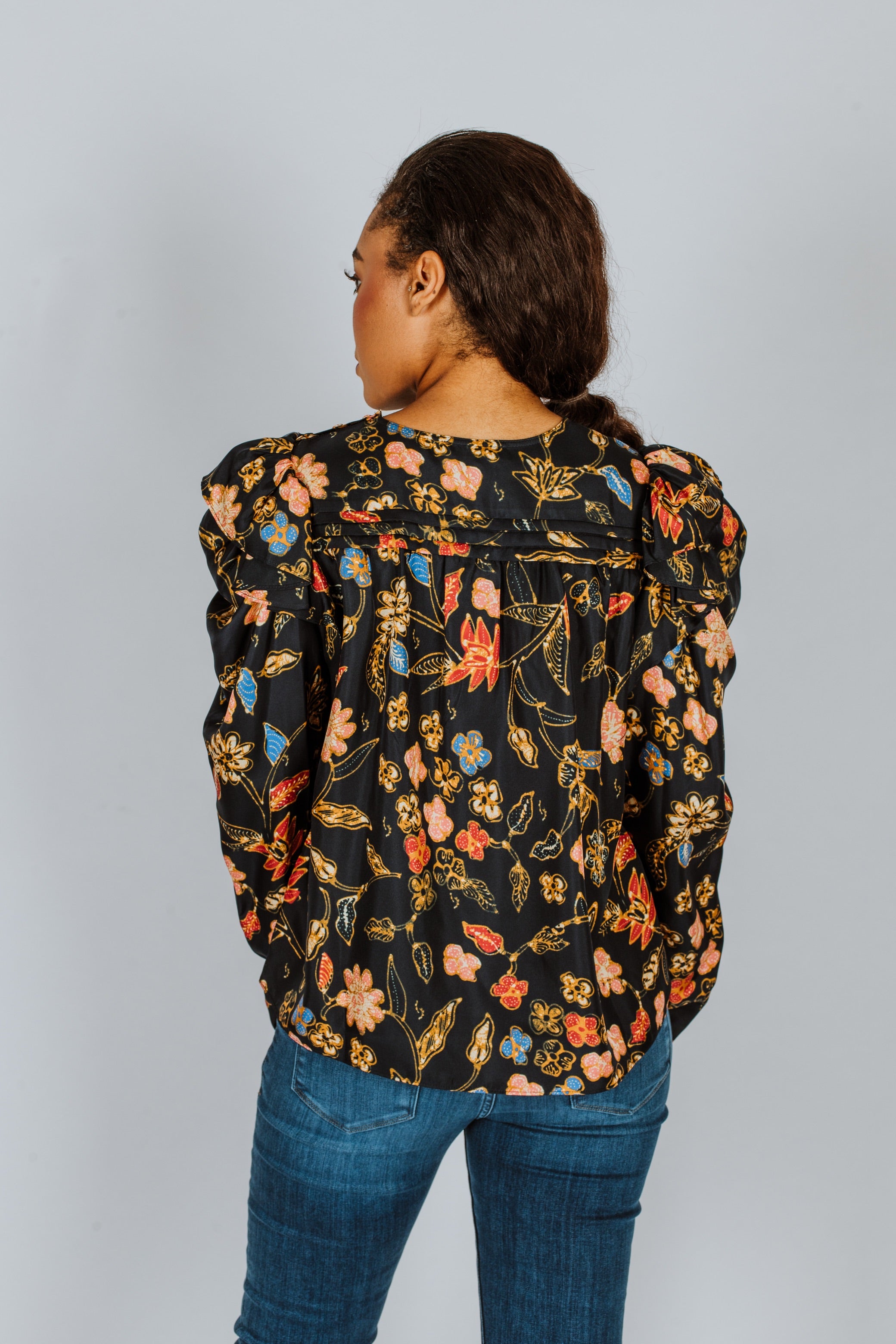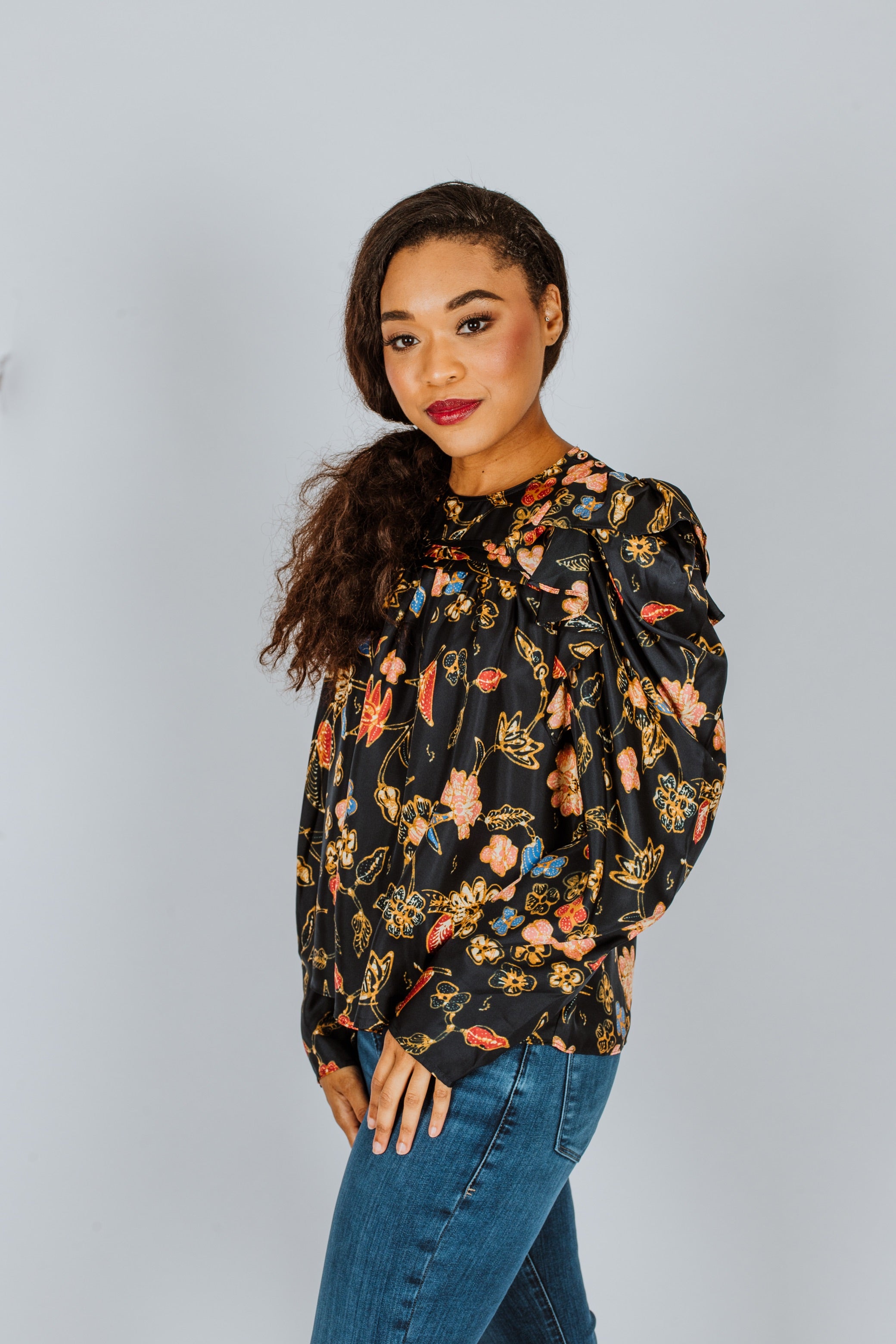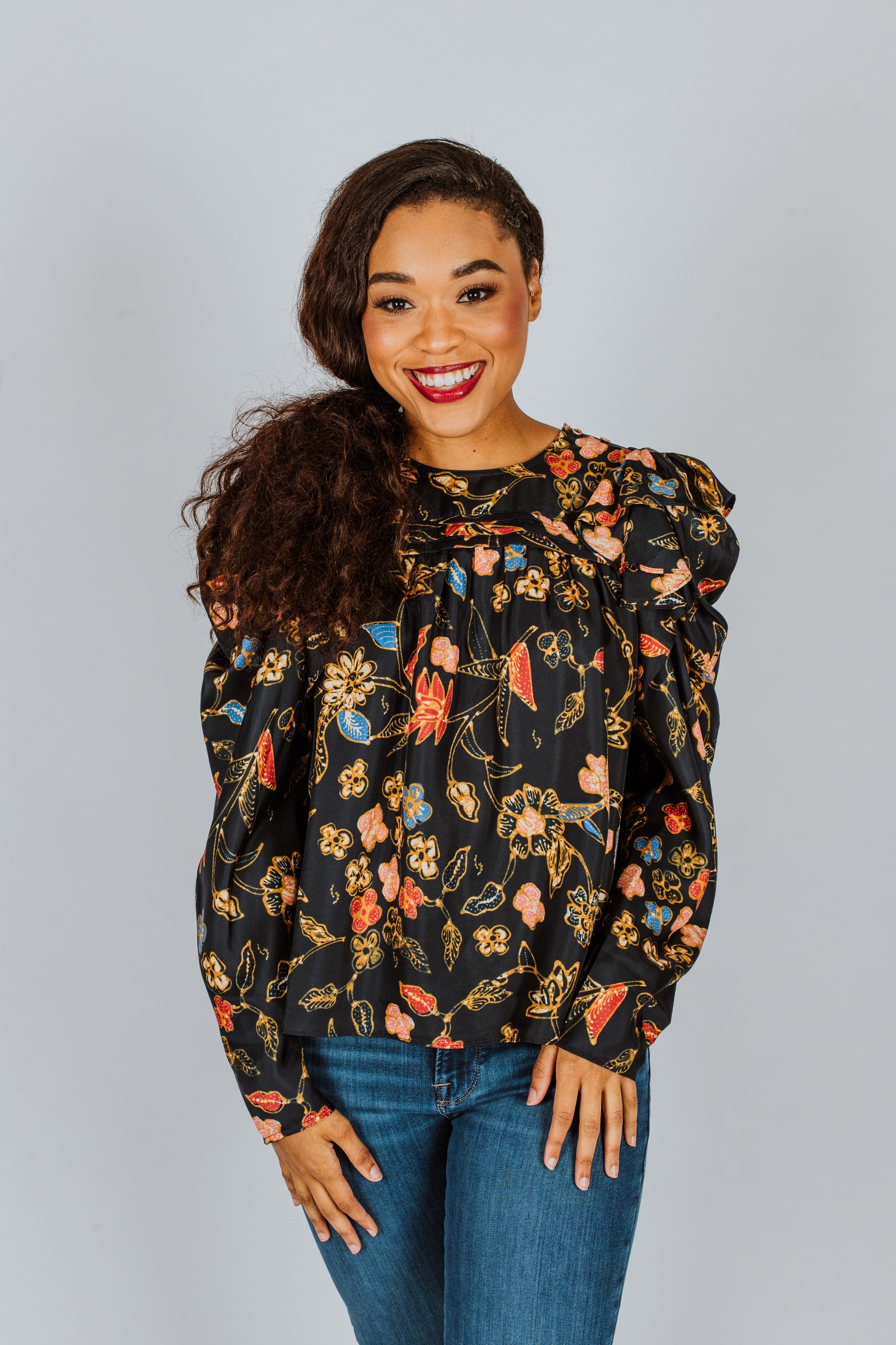 The Mattie Blouse is made from 100% silk in a playful print that features pops of color against a deep inky background. This blouse has ruffles in the front of the bodice flares out for a relaxed fit. It is finished with signature puff sleeves. Jessica is wearing a size 6.