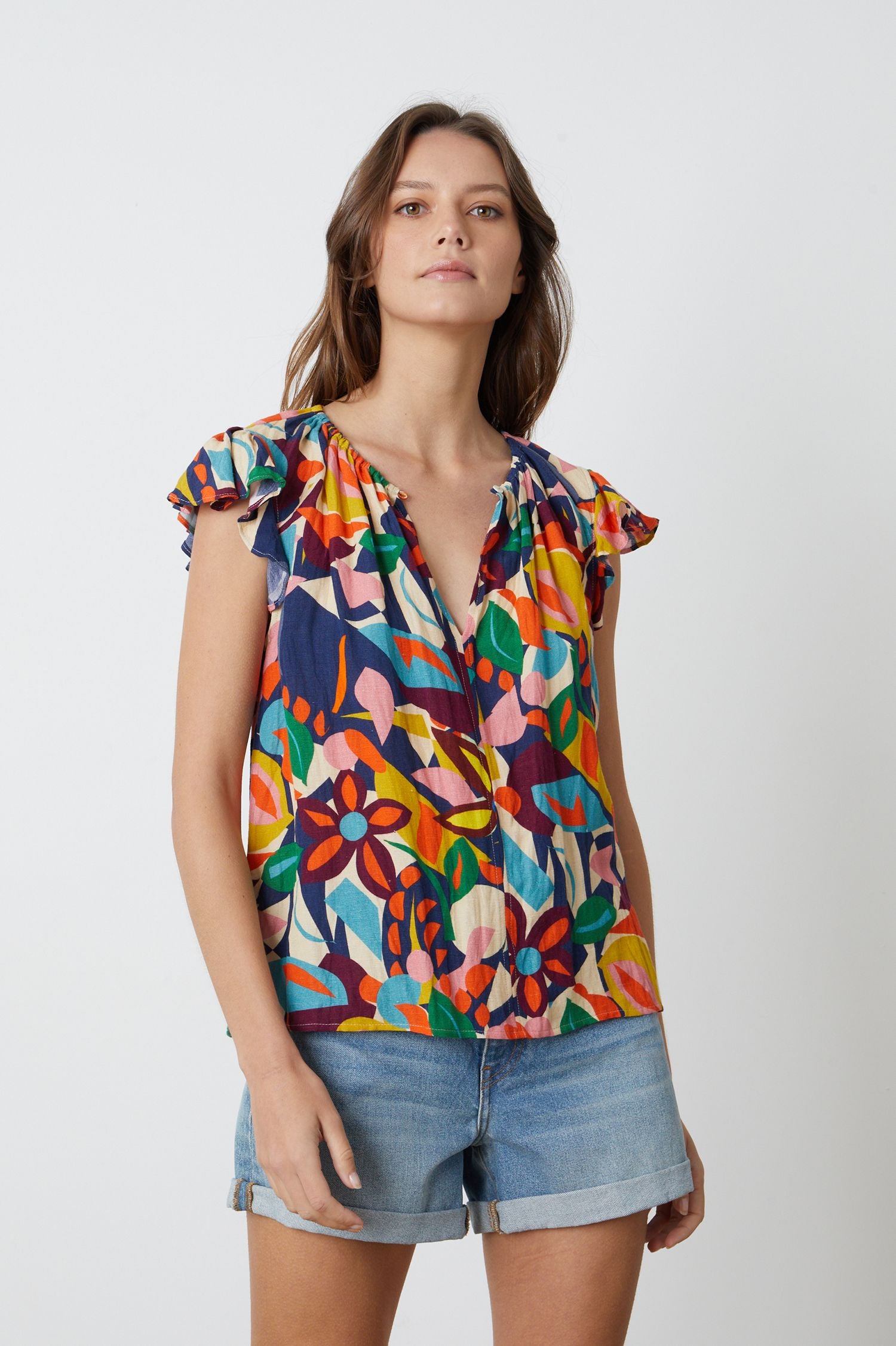 Elevate your wardrobe with the Velvet By Graham & Spencer Multicolor Blouse, featuring elegant flutter sleeves and a flattering v-neckline. Its vibrant multicolor print adds a lively touch to any outfit, making it perfect for both casual days and special occasions. Experience effortless style and comfort in one stunning blouse.