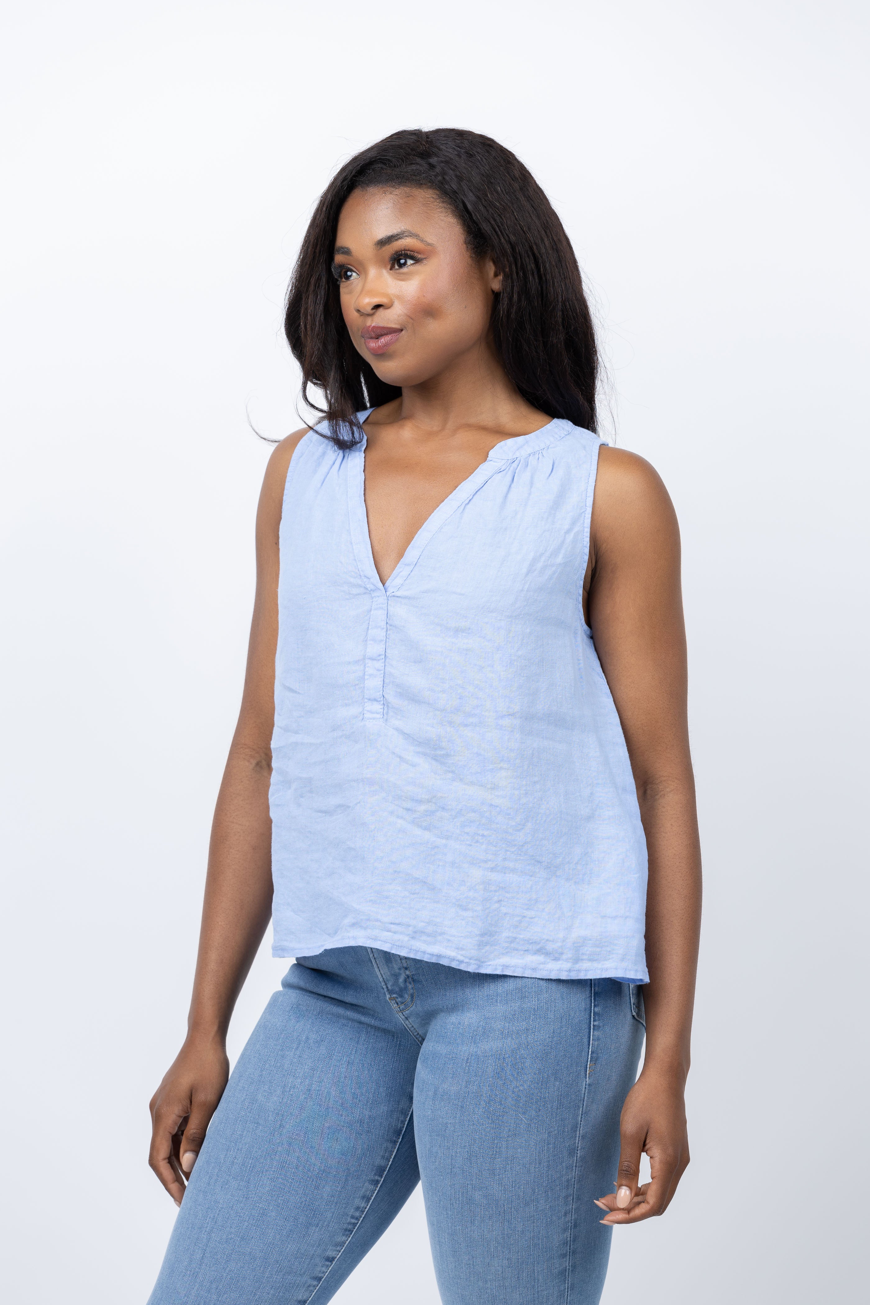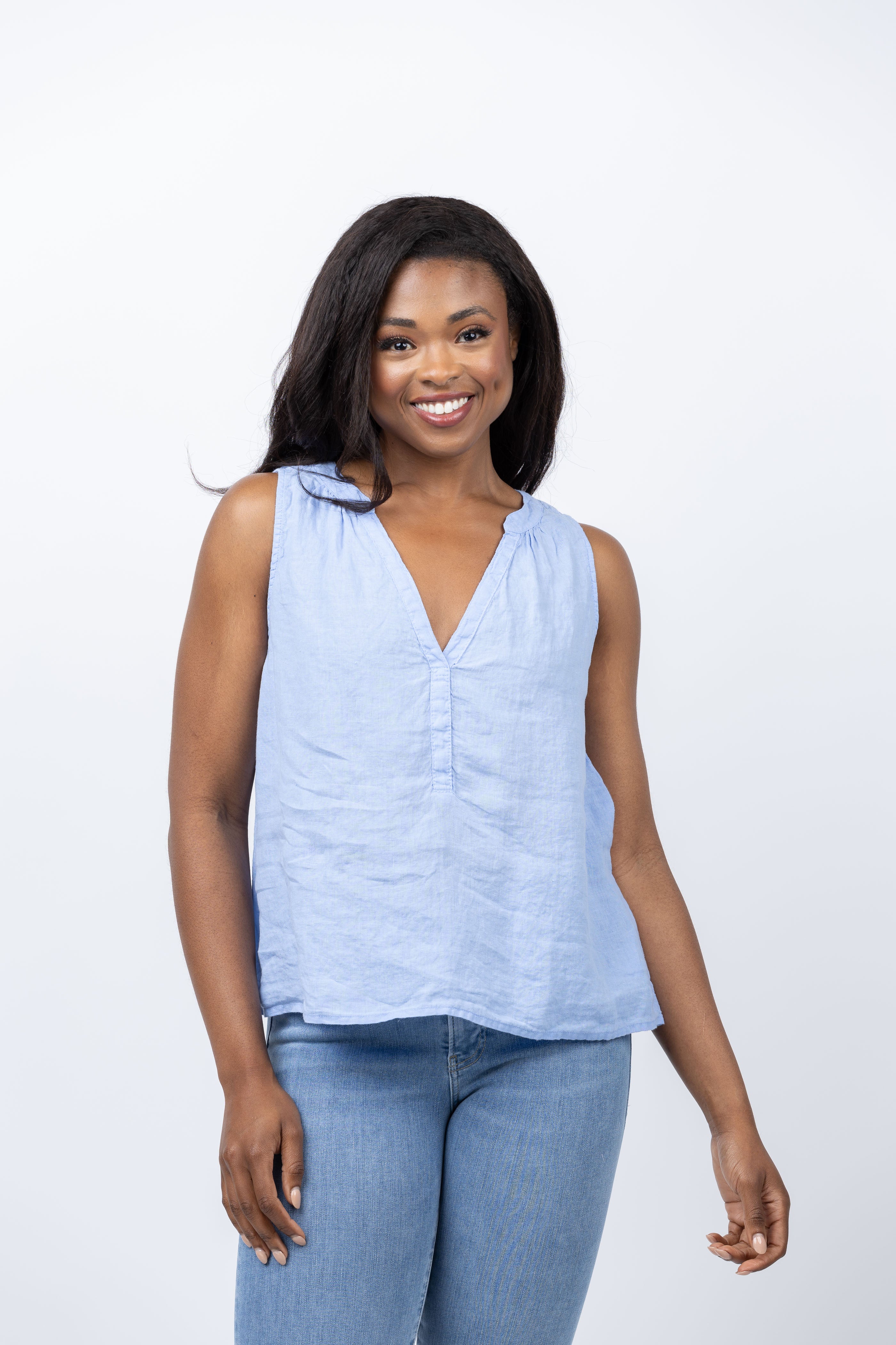 Indulge in luxurious comfort with the Velvet Tacy Tank in Chill! Made from 100% linen, this sleeveless top in a beautiful light blue hue is the perfect addition to your summer wardrobe. Pair it with white bottoms and sandals for a chic and effortless look.