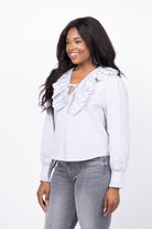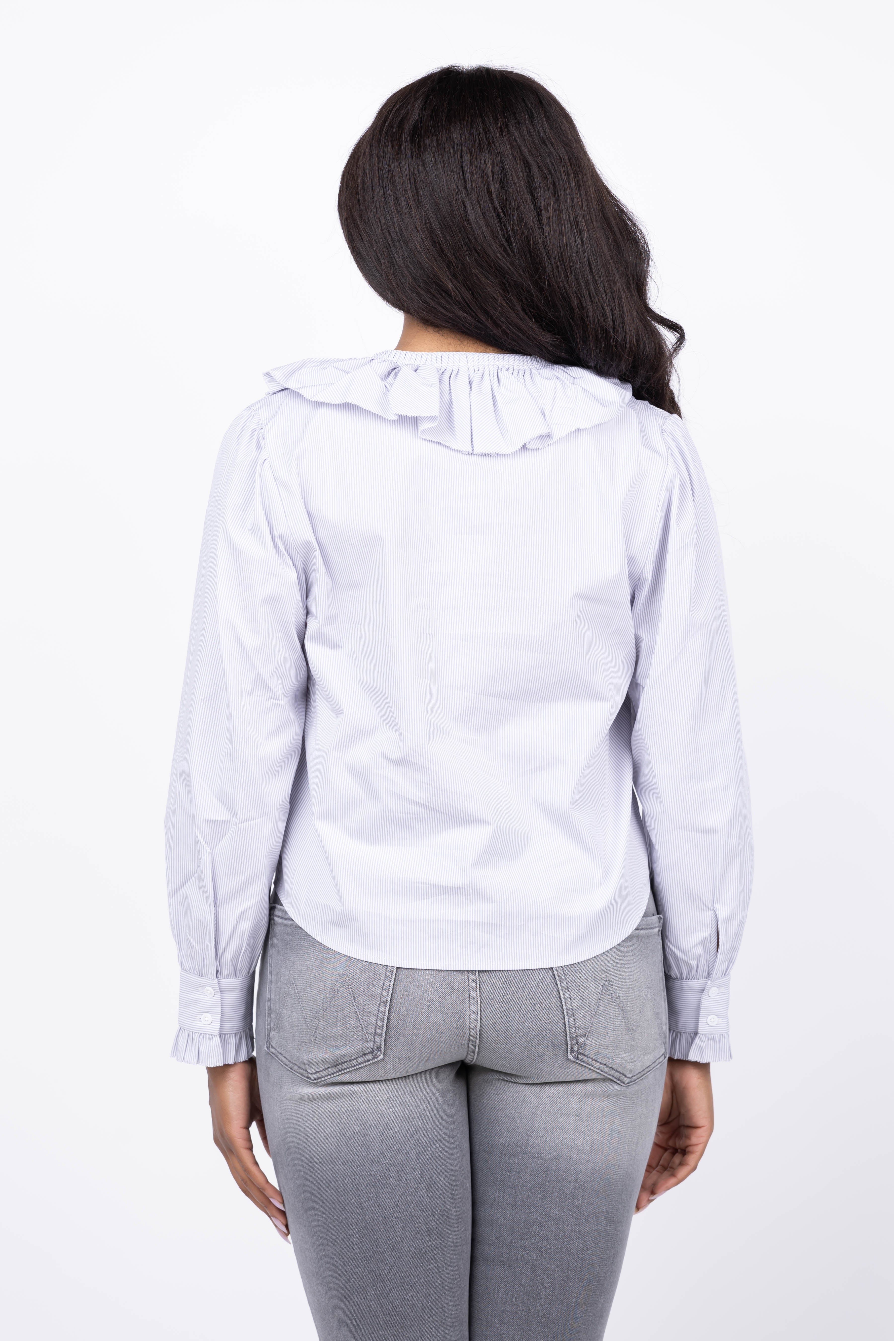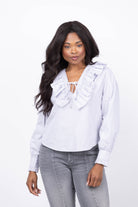 Experience the perfect blend of classic and contemporary with the We Are Sundays Thais Top in Titanium Stripe. Crafted from soft cotton yarn-dyed poplin, this top features a feminine ruffled V-neckline and a delicately adjustable self-tie closure. With full-length sleeves and a relaxed fit, it offers effortless style and comfort, making it an ideal choice for refreshing your everyday wardrobe.