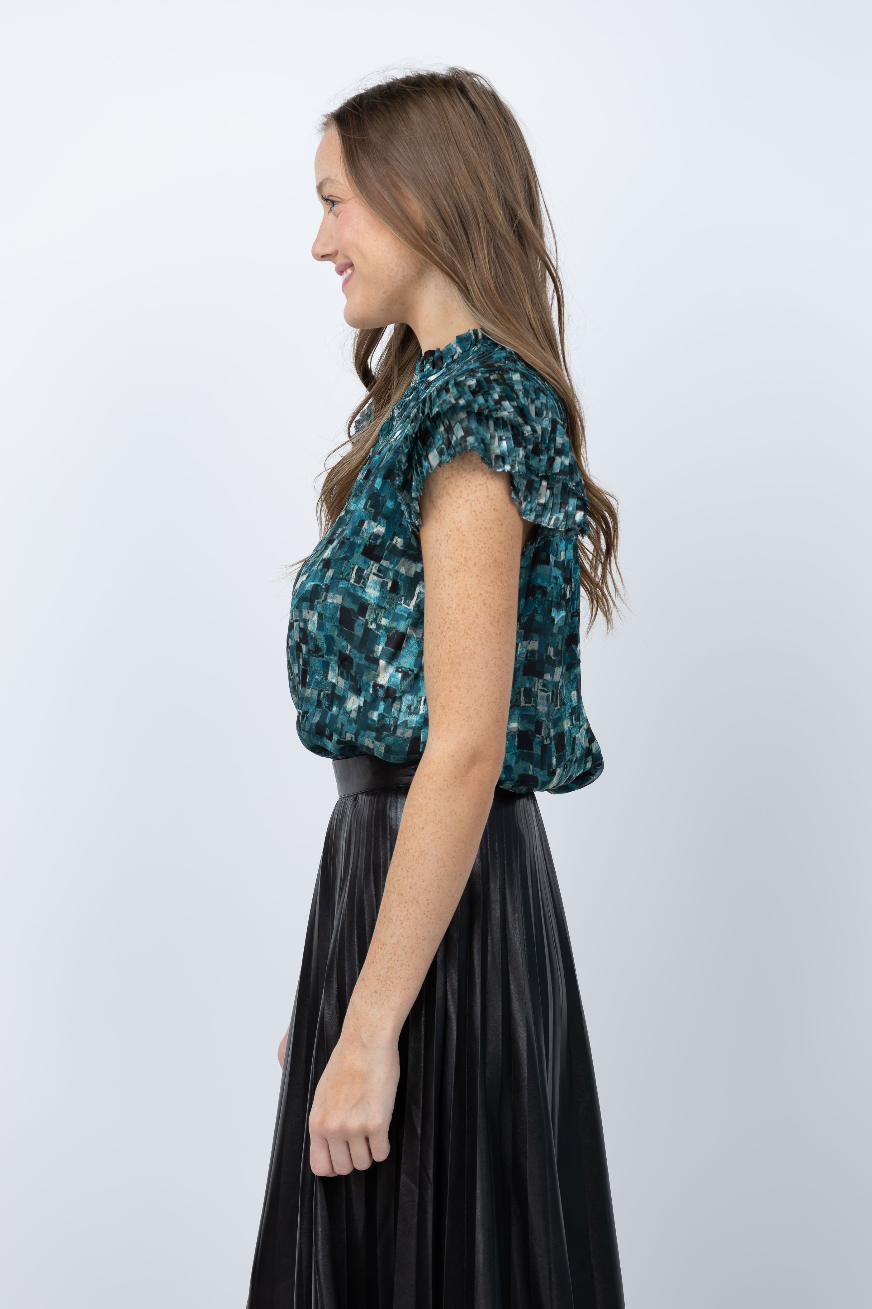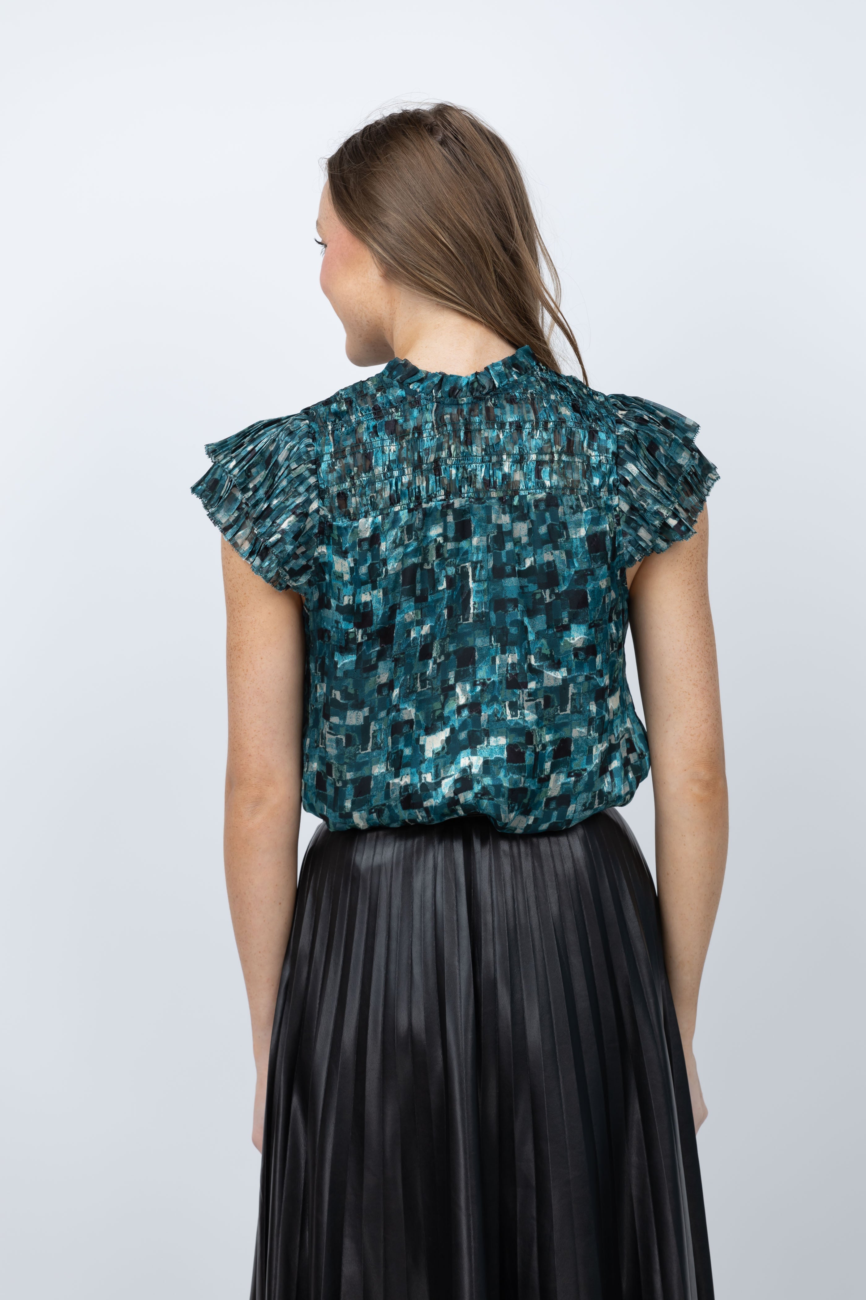 The Caballero Kaz Blouse in Emerald Burnout is a chic wardrobe essential with intricate variations and a watercolor effect. The standing ruffle collar, adjustable V-neckline, and feminine ruffle sleeves add whimsical allure. Made from viscose-silk burnout fabric, it drapes beautifully for a touch of romance in any outfit.