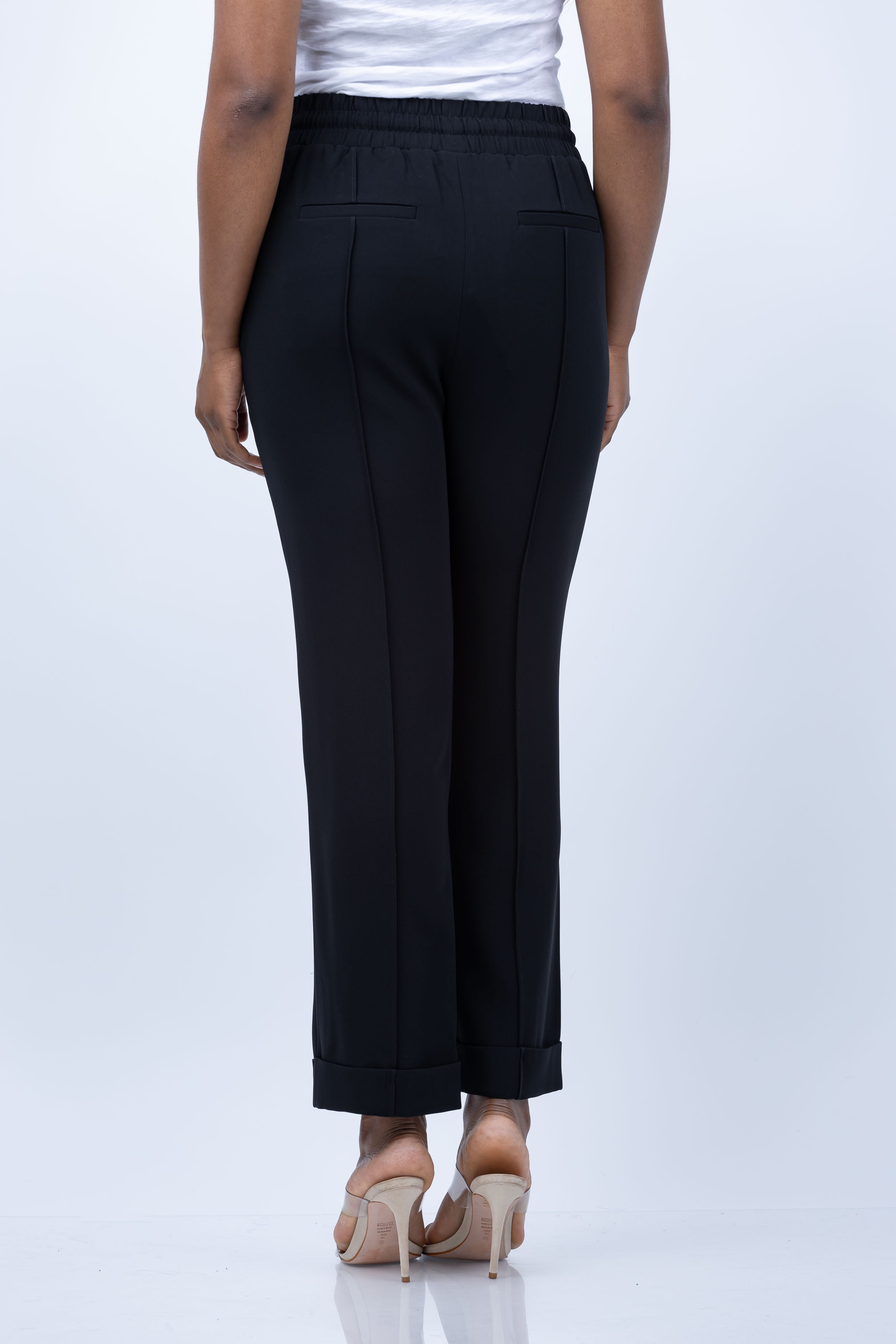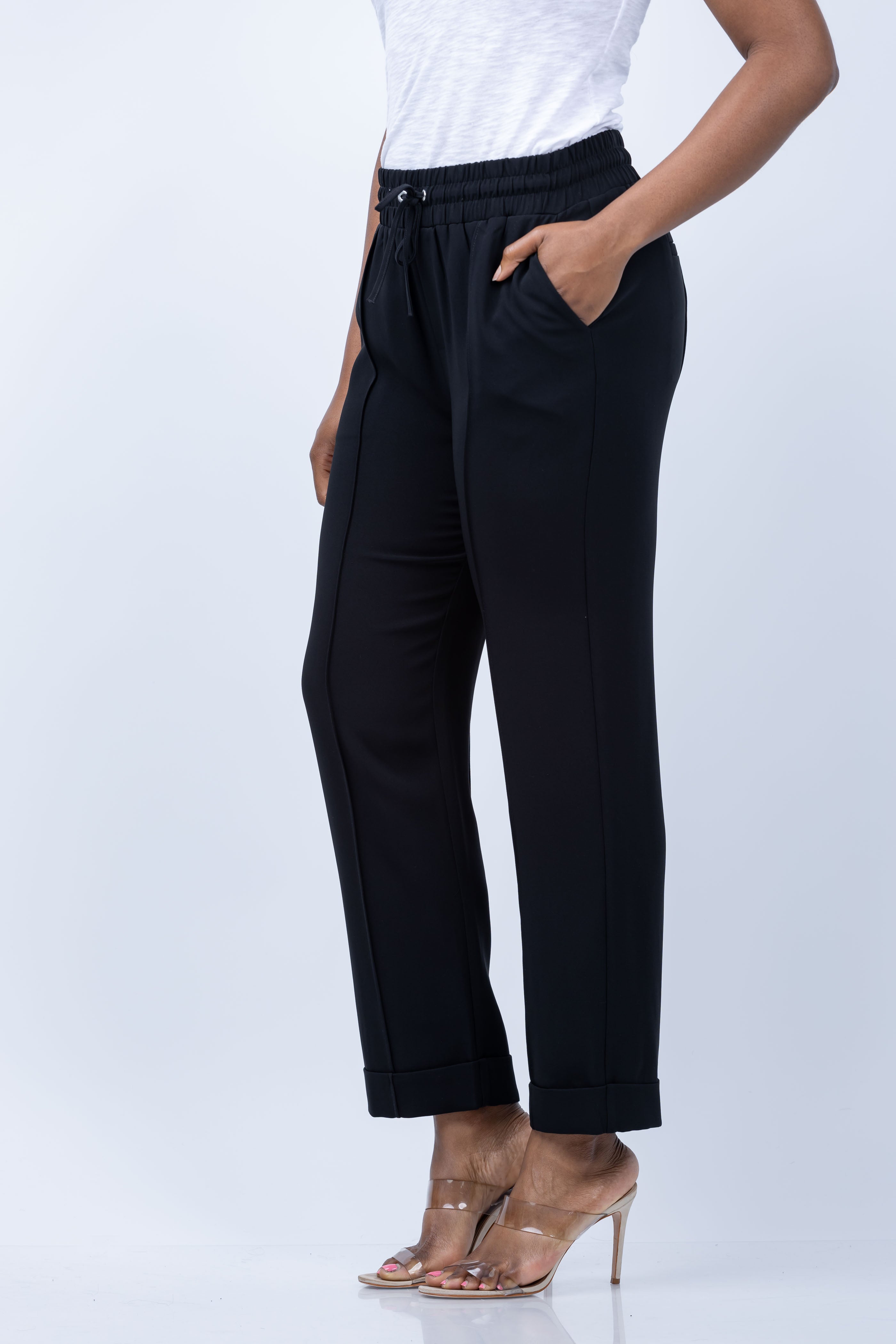 Elevate your style with the Cinq a Sept Everly Pants. The drawstring waistband provides a comfortable fit while the side slip and back welt pockets add functionality. These cropped pants feature straight legs, pull-on style, creases, and cuffed hem for a chic look. Make a statement in versatile black!